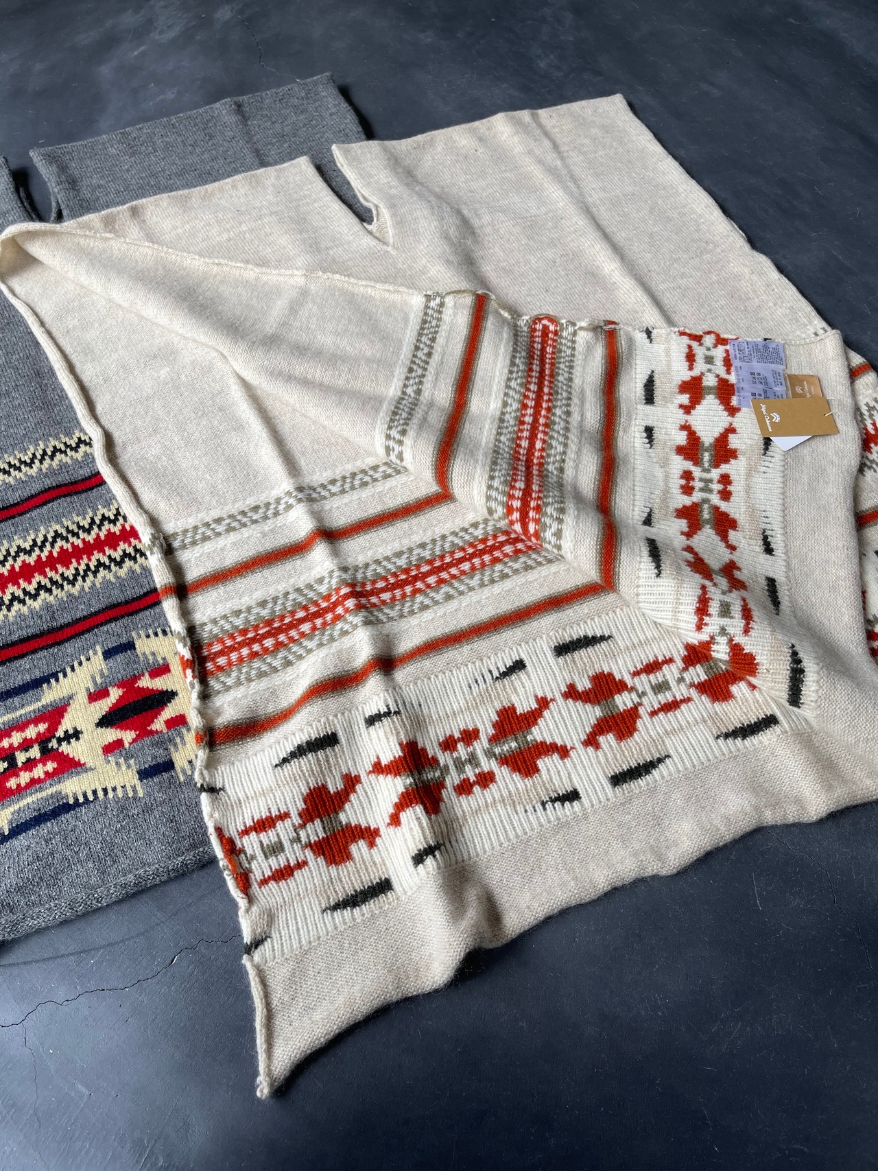 中央のスリットに首を通してマントとしての着用や、大判ストールとして体を包むこともできるアイテムです。