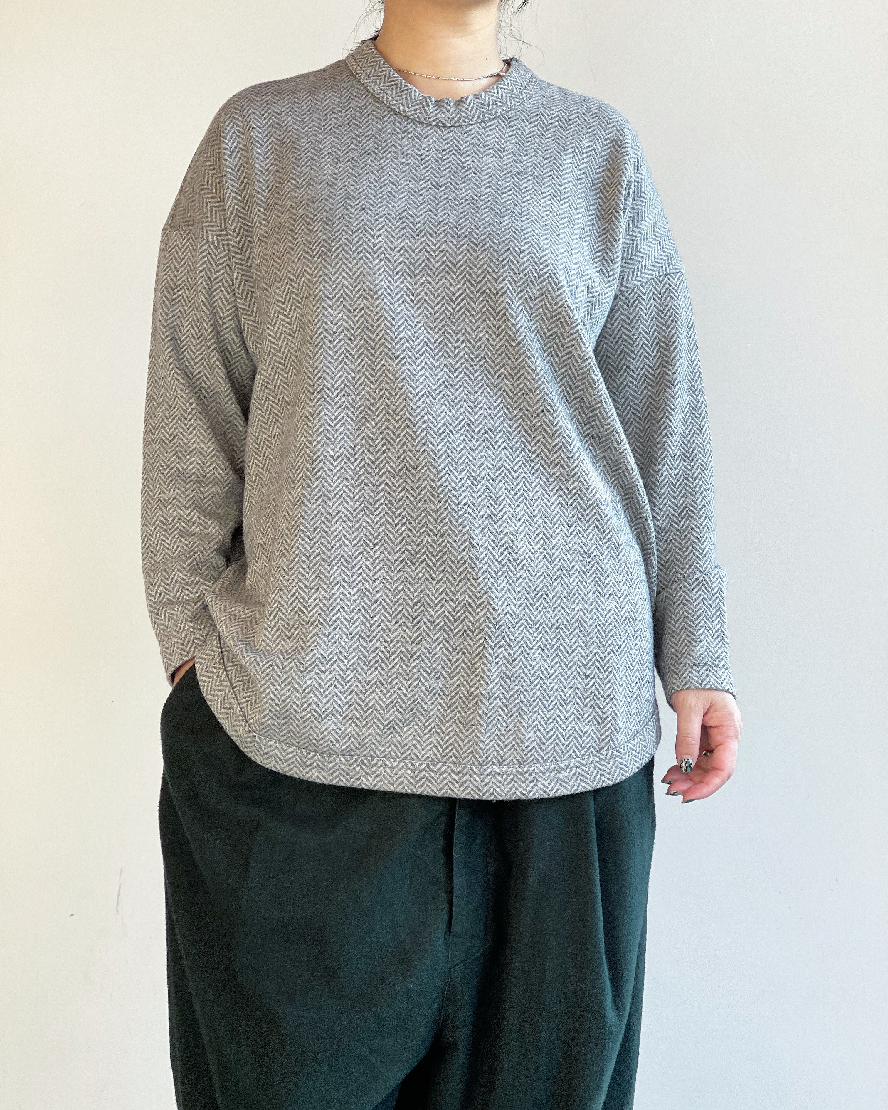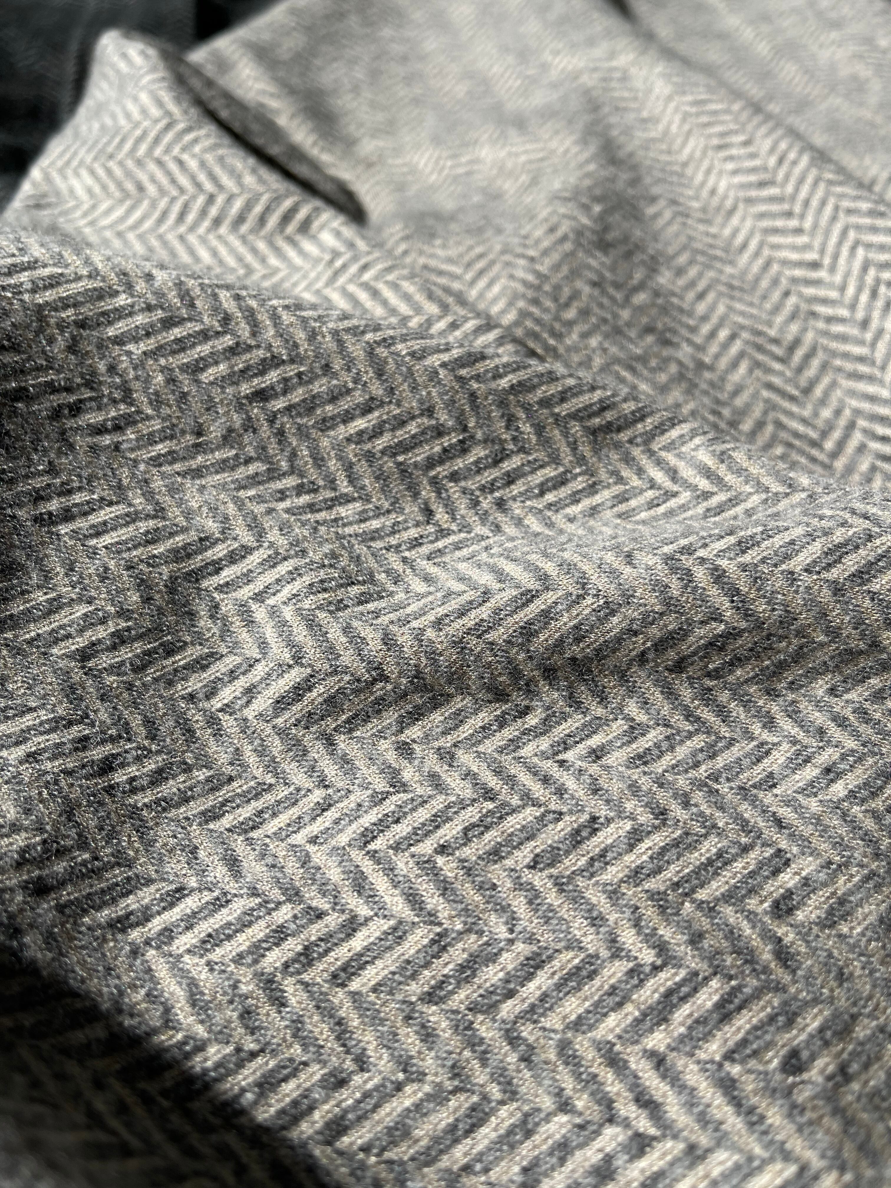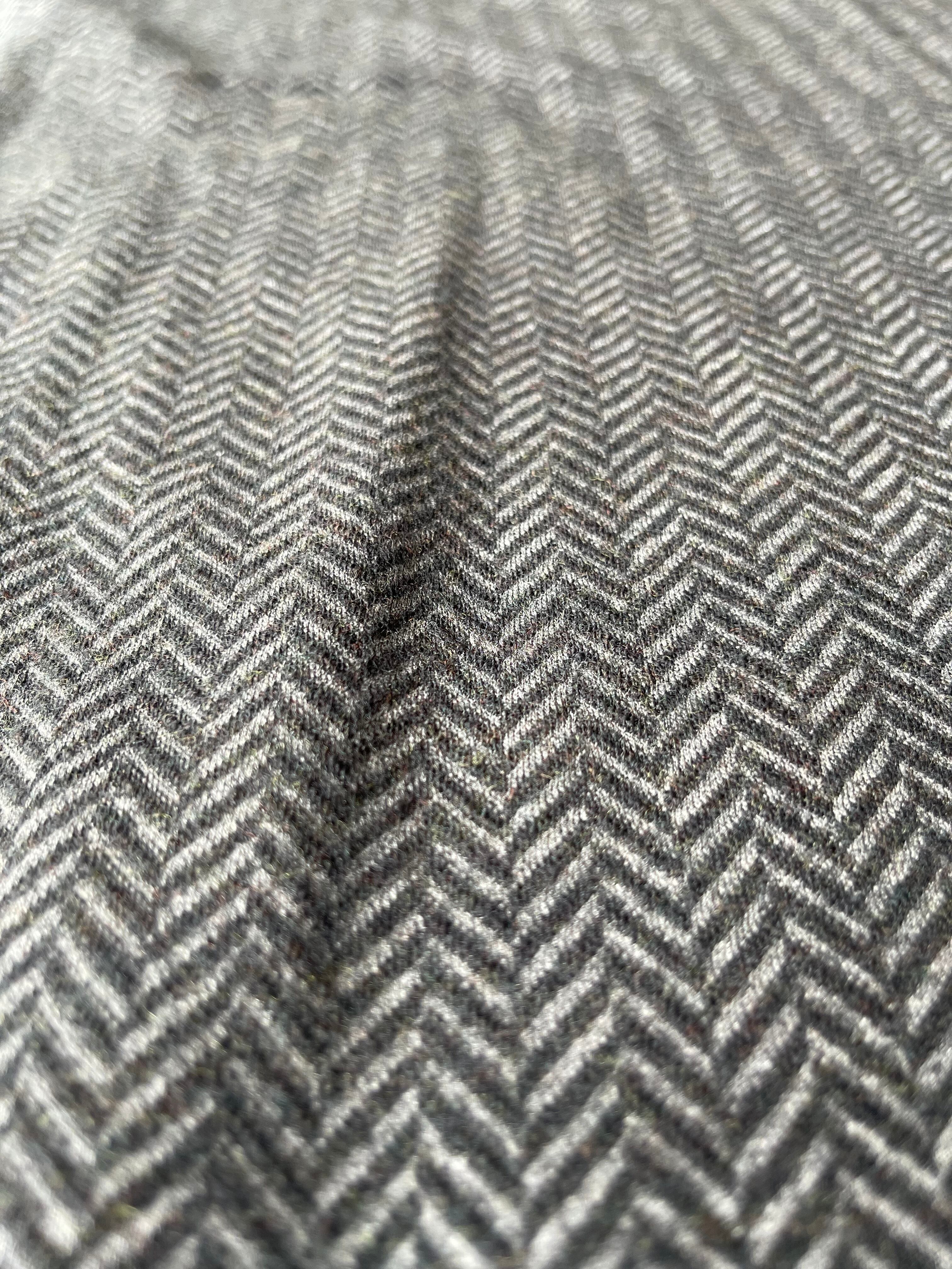ふっくらとしたウルグアイウールと綺麗な光沢を持つレーヨンをジャガード機を使用してヘリンボーン柄に編んだニット二重編み地です。