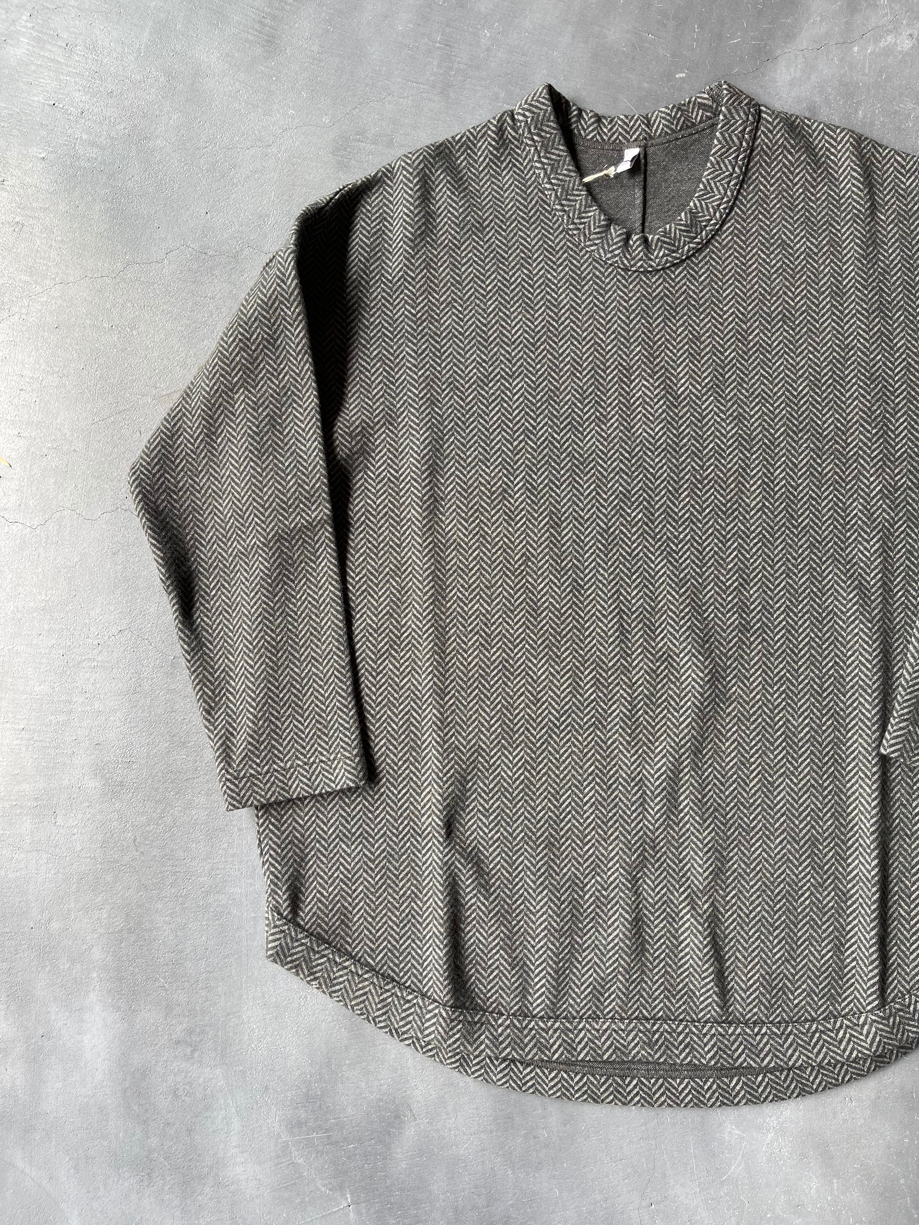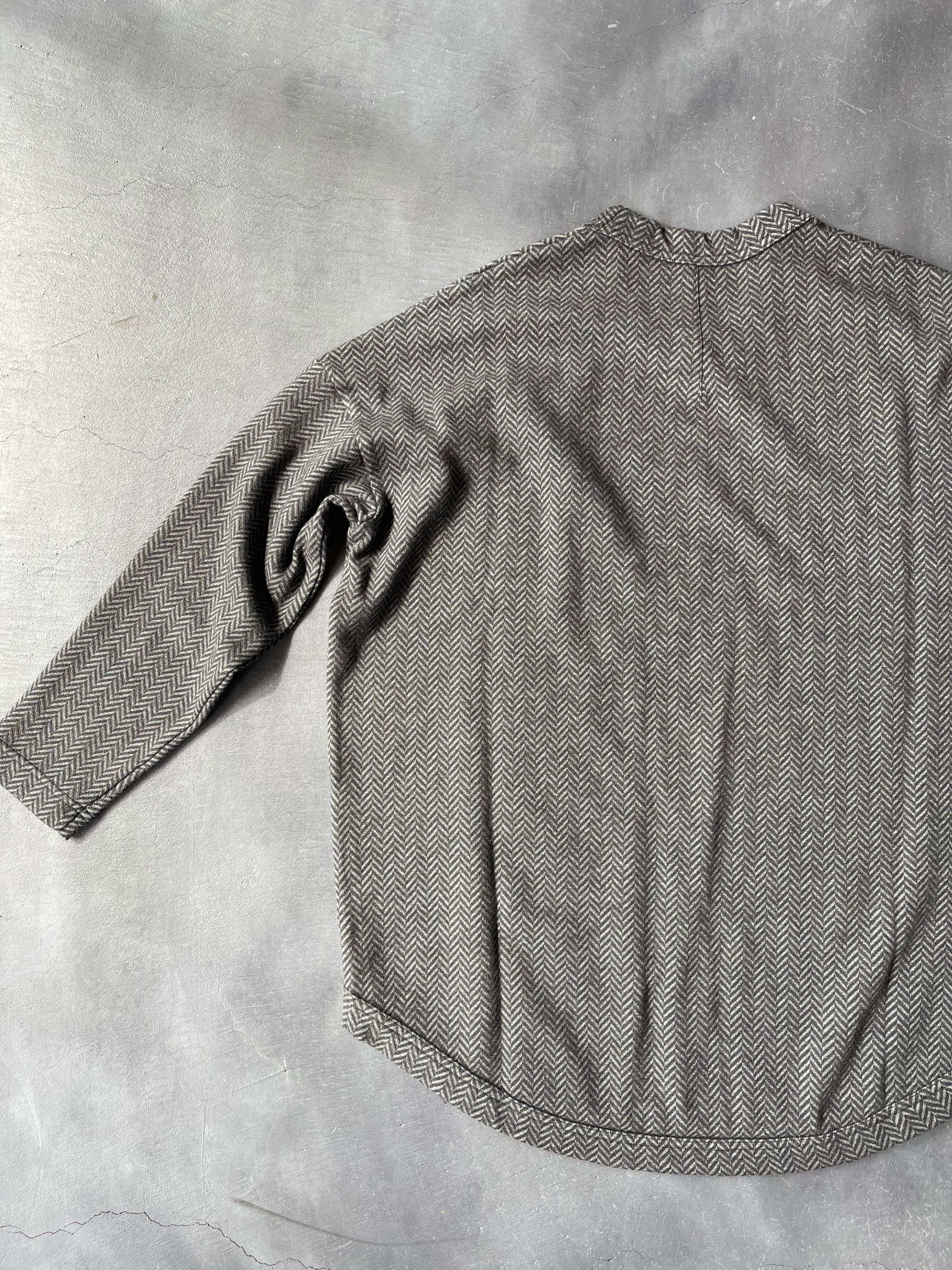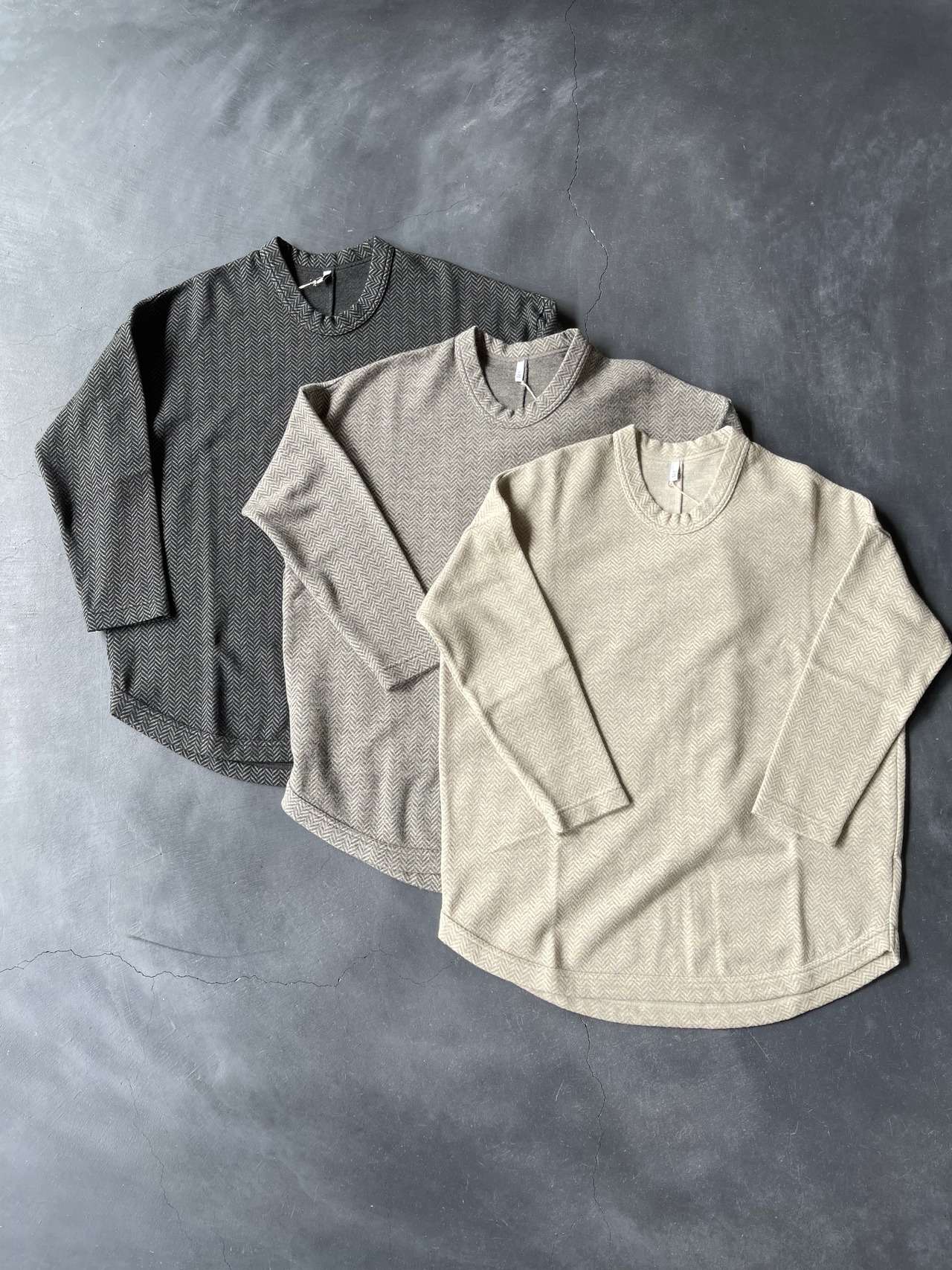 ふっくらとしたウルグアイウールと綺麗な光沢を持つレーヨンをジャガード機を使用してヘリンボーン柄に編んだニット二重編み地です。