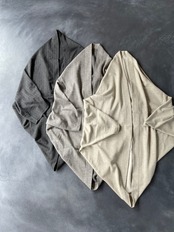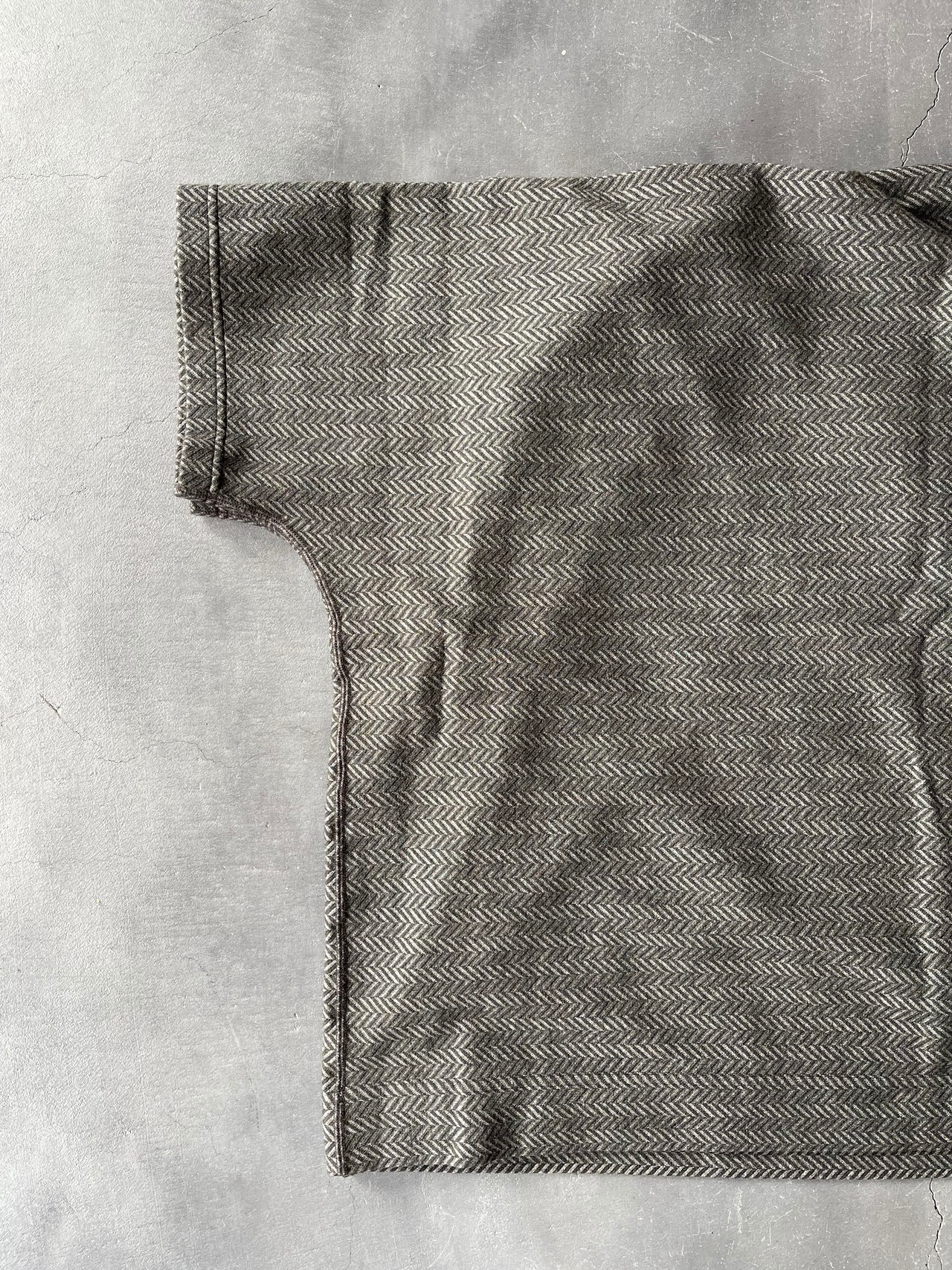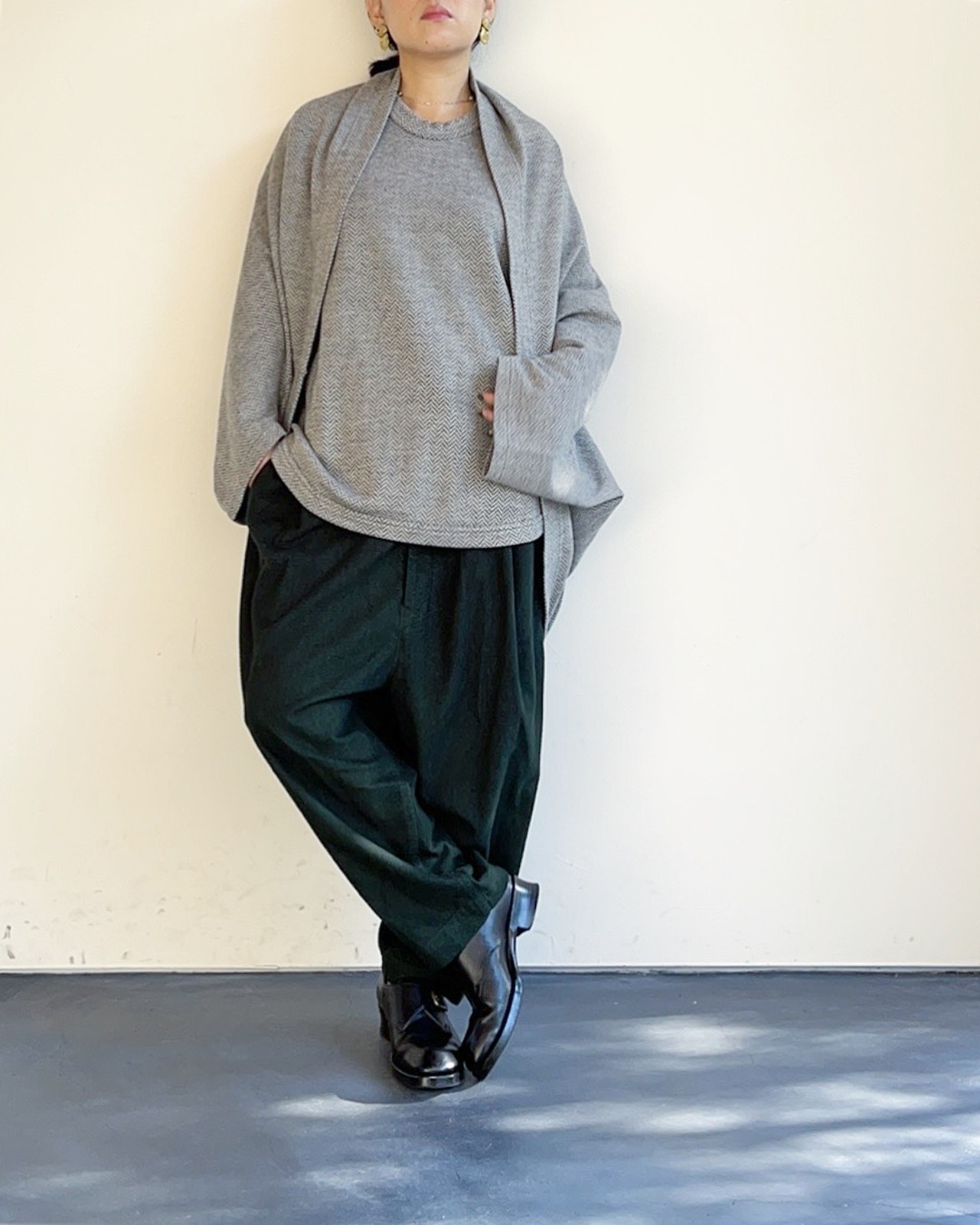 ふっくらとしたウルグアイウールと綺麗な光沢を持つレーヨンをジャガード機を使用してヘリンボーン柄に編んだニット二重編み地です。