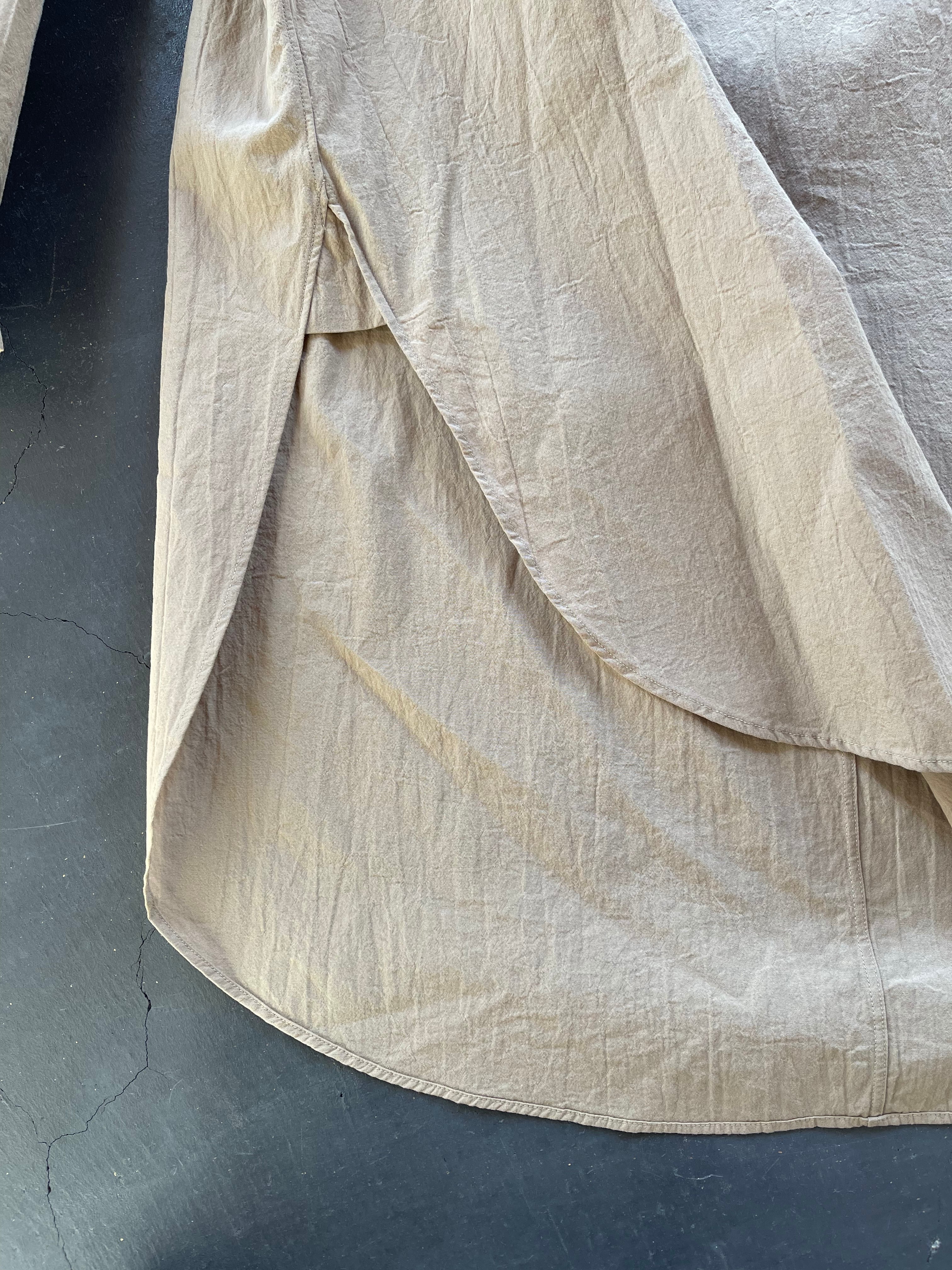整理加工をせずに生機の状態から直接水でもみ洗いしタンブラー乾燥をすることで荒い質感とシワ感を強く出した仕上げにしています。