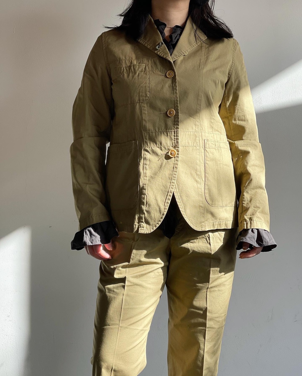 ウーマンでは初のホスピタルジャケットをデザインベースとしたジャケットです。ホスピタルジャケットは傷病兵に負担をかけないアンコンストラクティッドな仕様でありながら、サヴィルロウのしっかりとした構築美を失っていない事が特徴です。