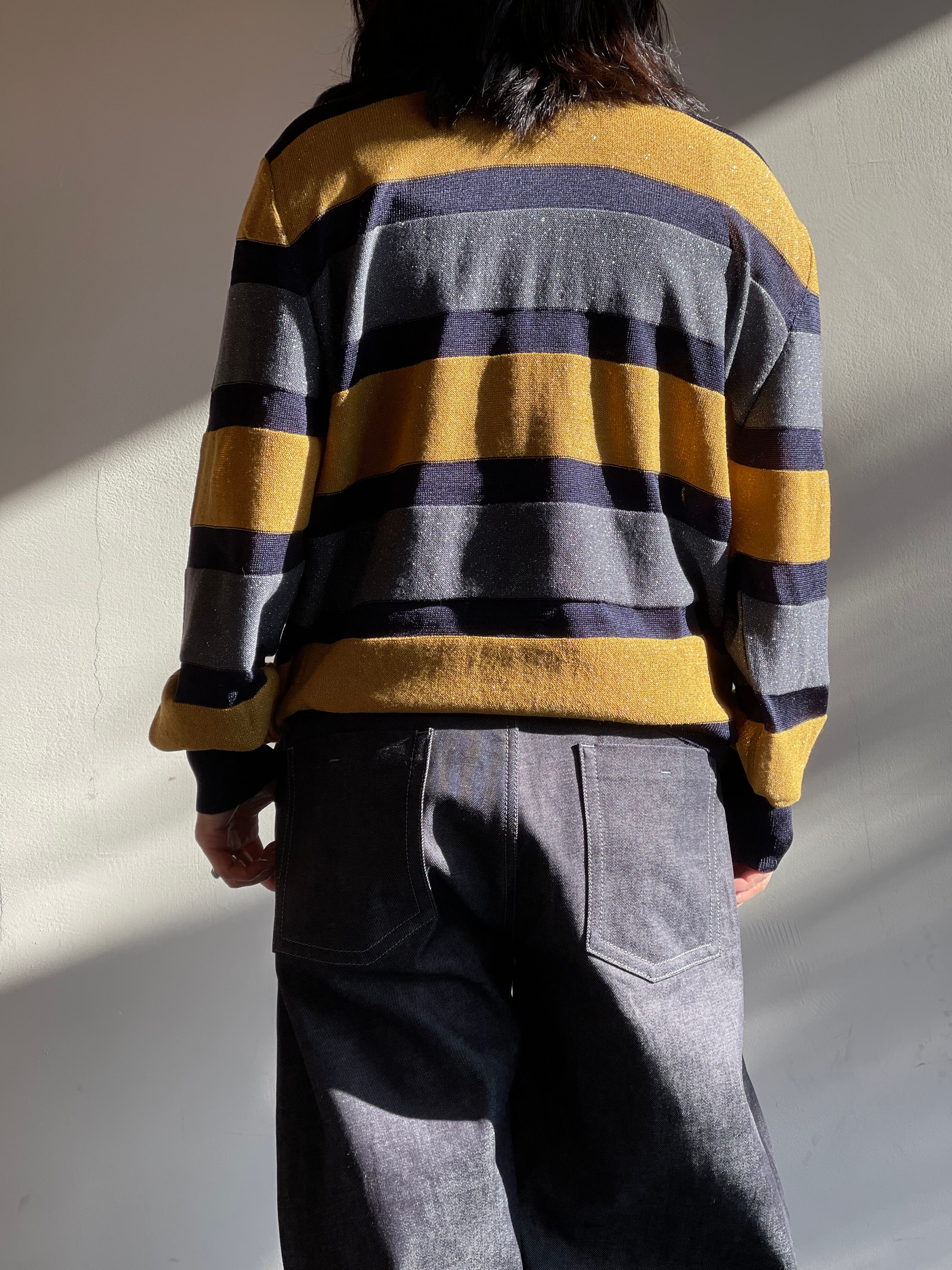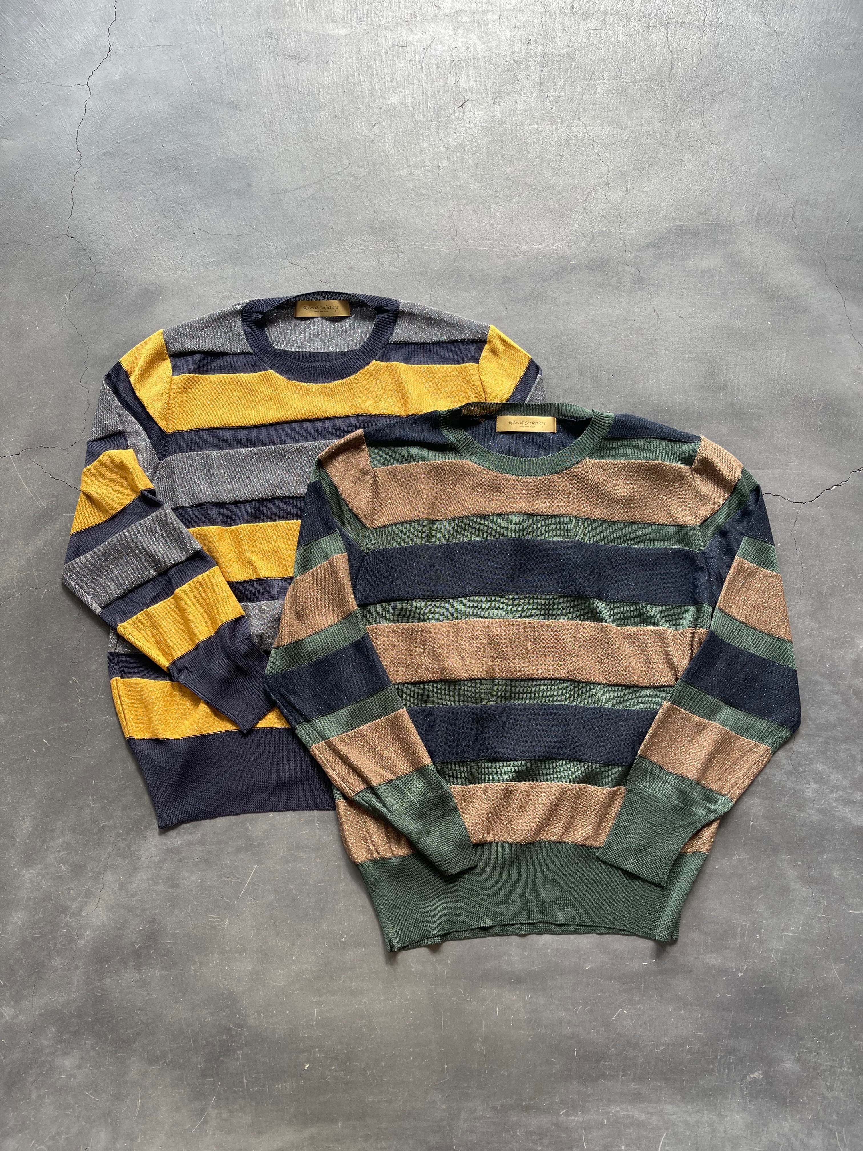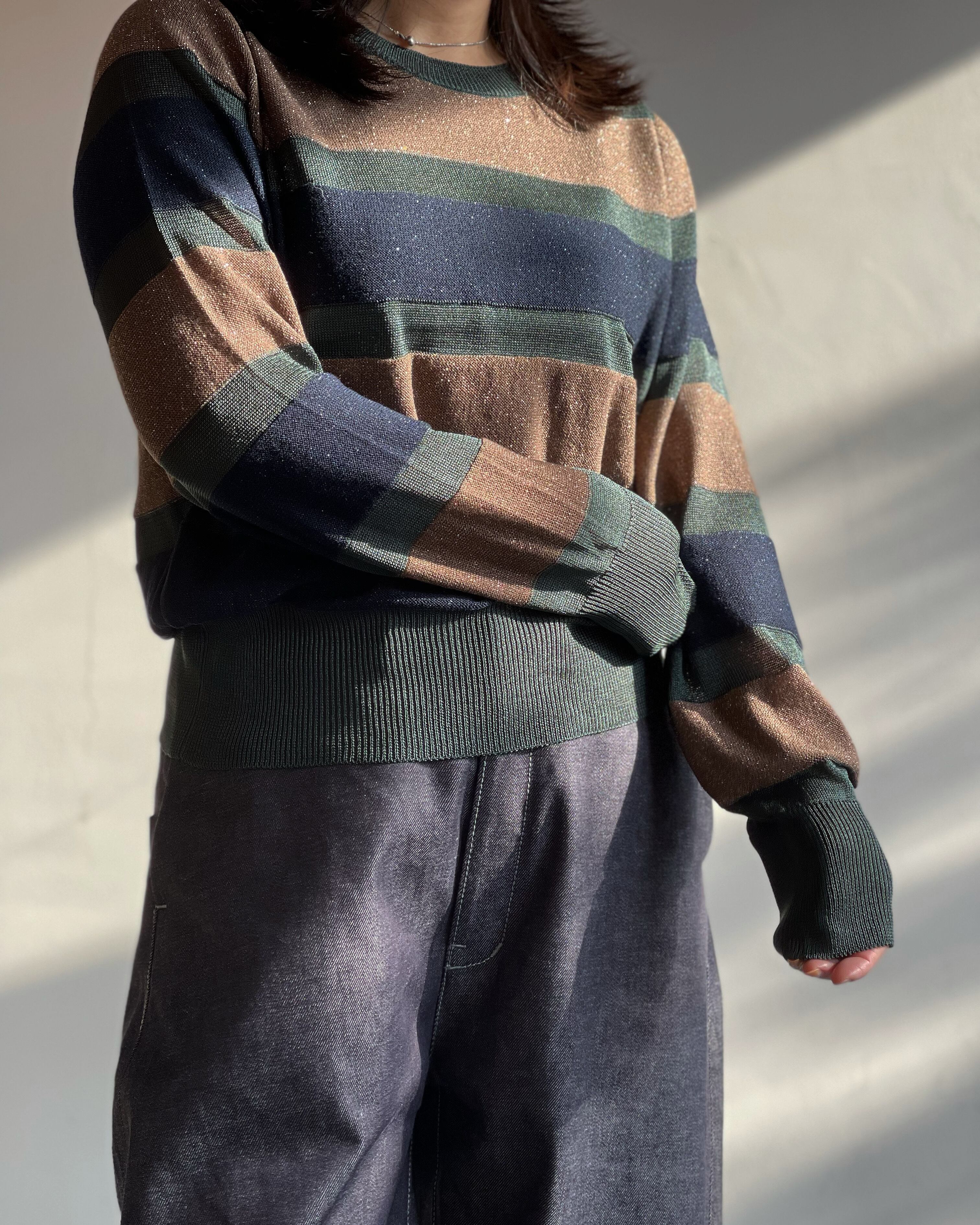 柔らかい光沢のラメ糸を使ったボーダーニットです。