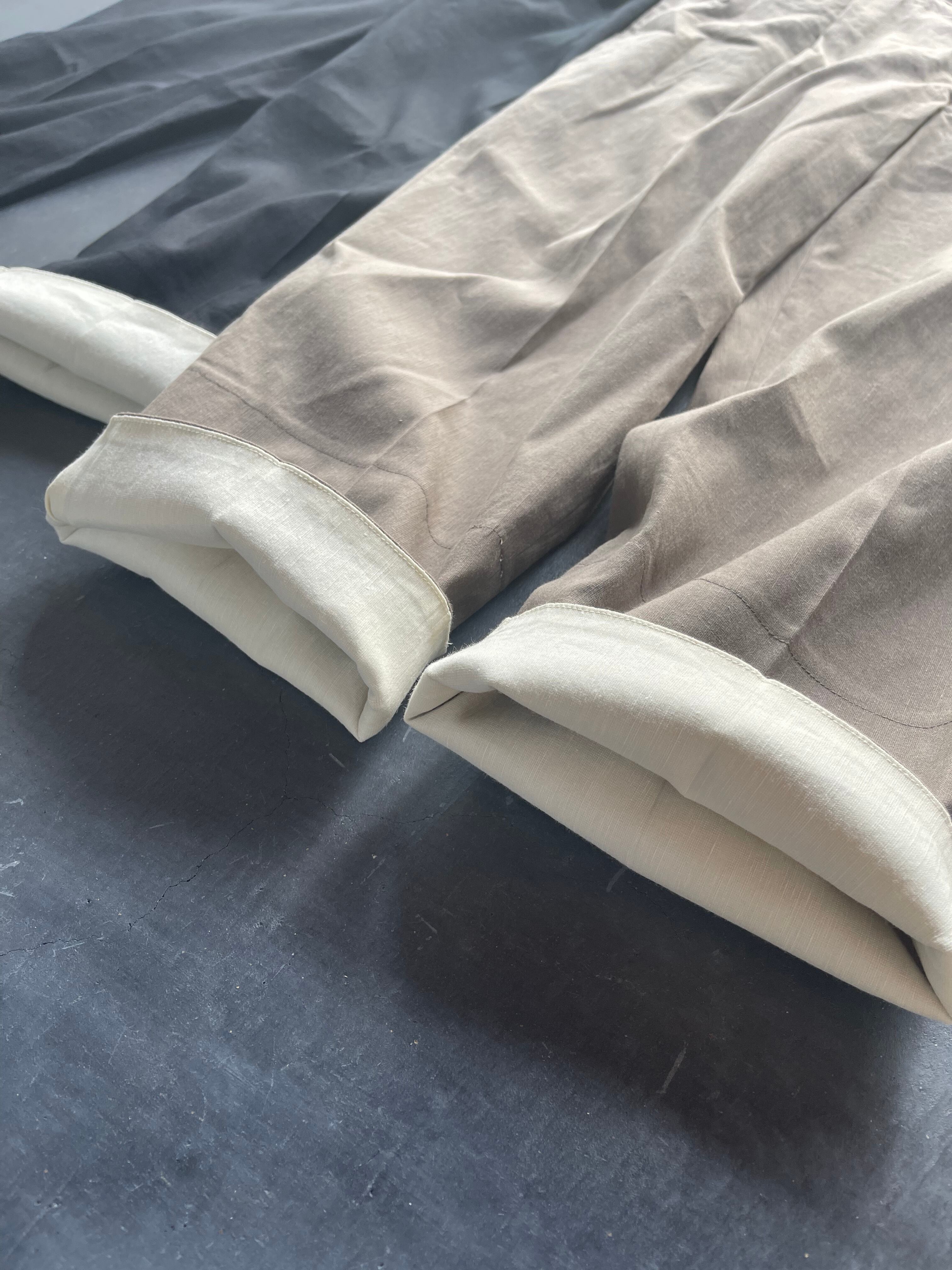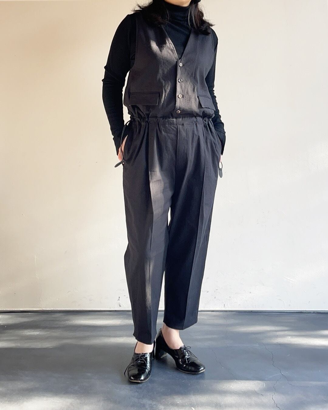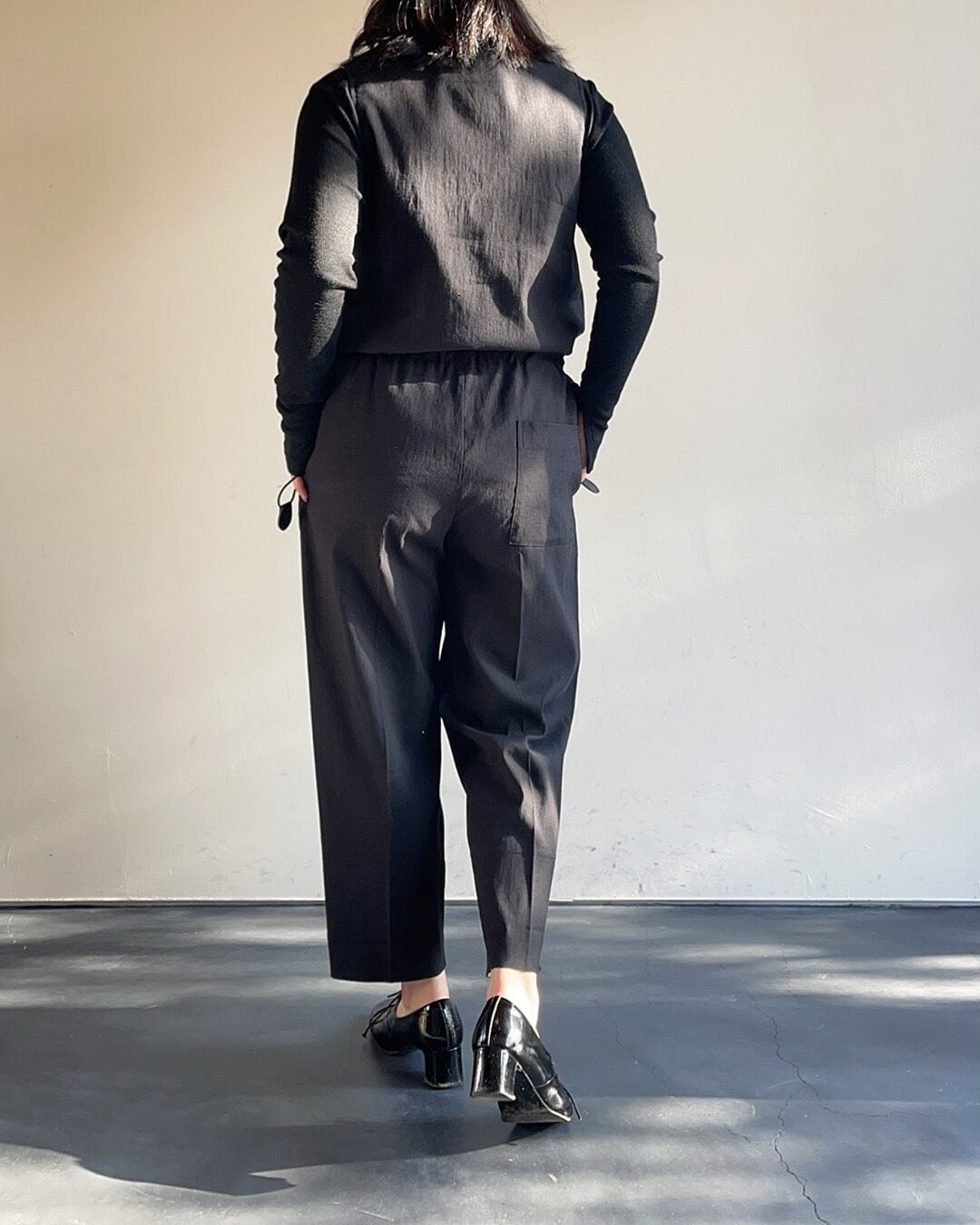 リネンのような見た目ながら、ストレッチが効いていて膝も出ず軽い着心地です。