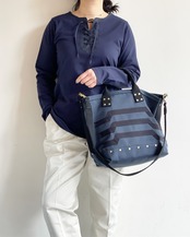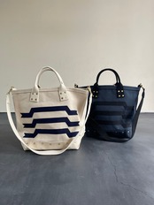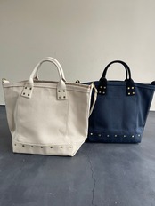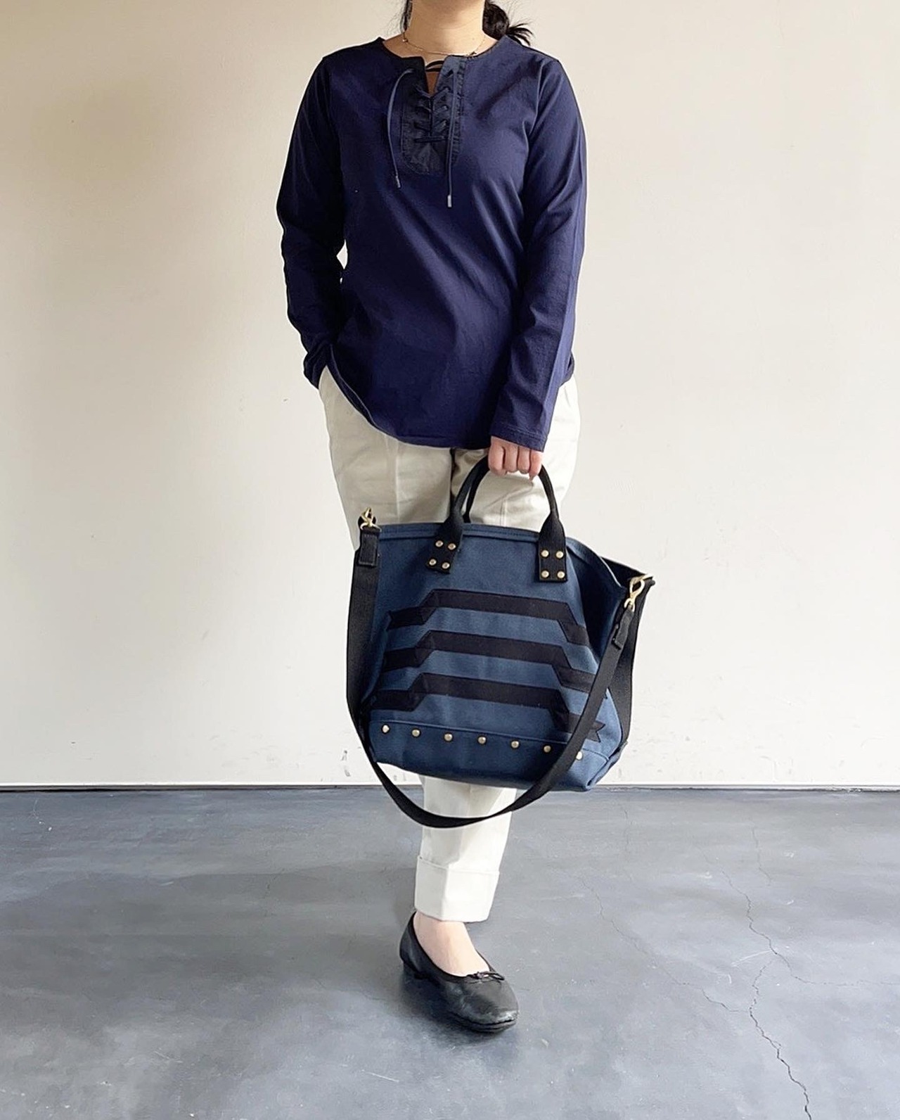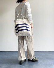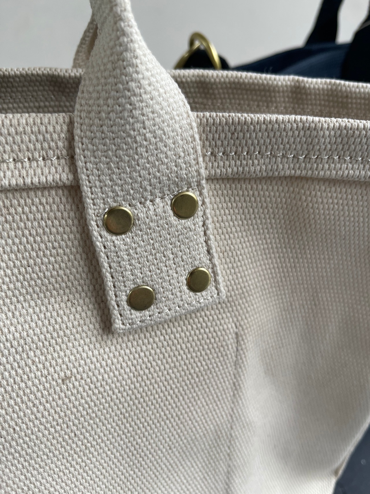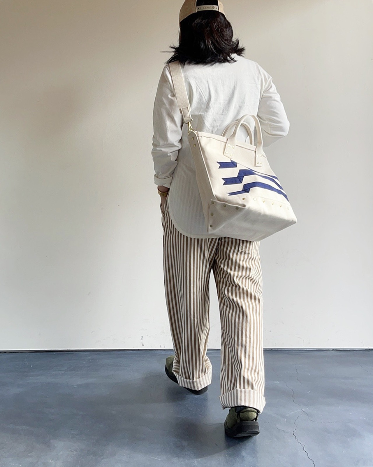 US NAVYの船上で洗濯物を入れる為に使われていた、ランドリーバックのデザインを基に。1950年代の物と思われるフランスのトートバックをアップデートしました。A3サイズがちょうど良く納まる大きさ、着脱式のショルダー付きで機能的です。しっかりとした厚みのある素材は、極太番手の綿糸をシャトル織機で高密度に織り上げたこだわりのOXです。使い込むほどに馴染み雰囲気ある表情になります。