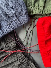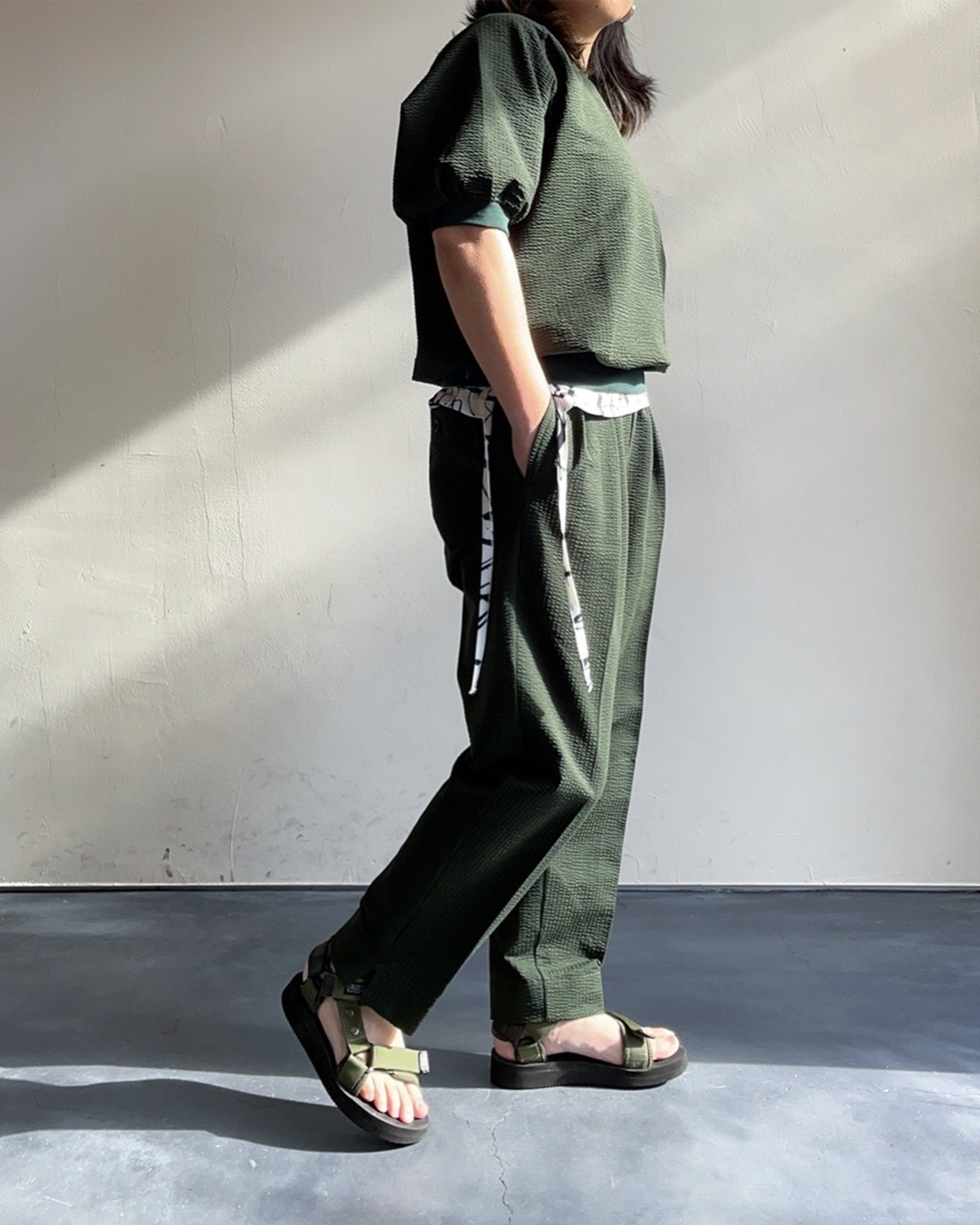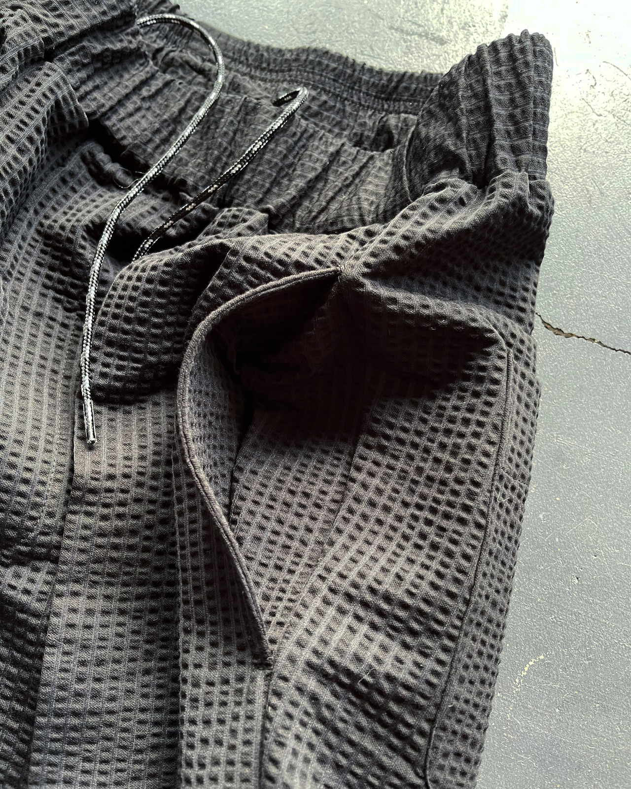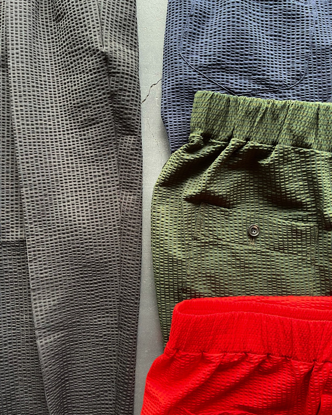 波状の凹凸が特徴のシアサッカー素材をハイゲージニットで表現したオリジナリティ溢れるジャージ素材。