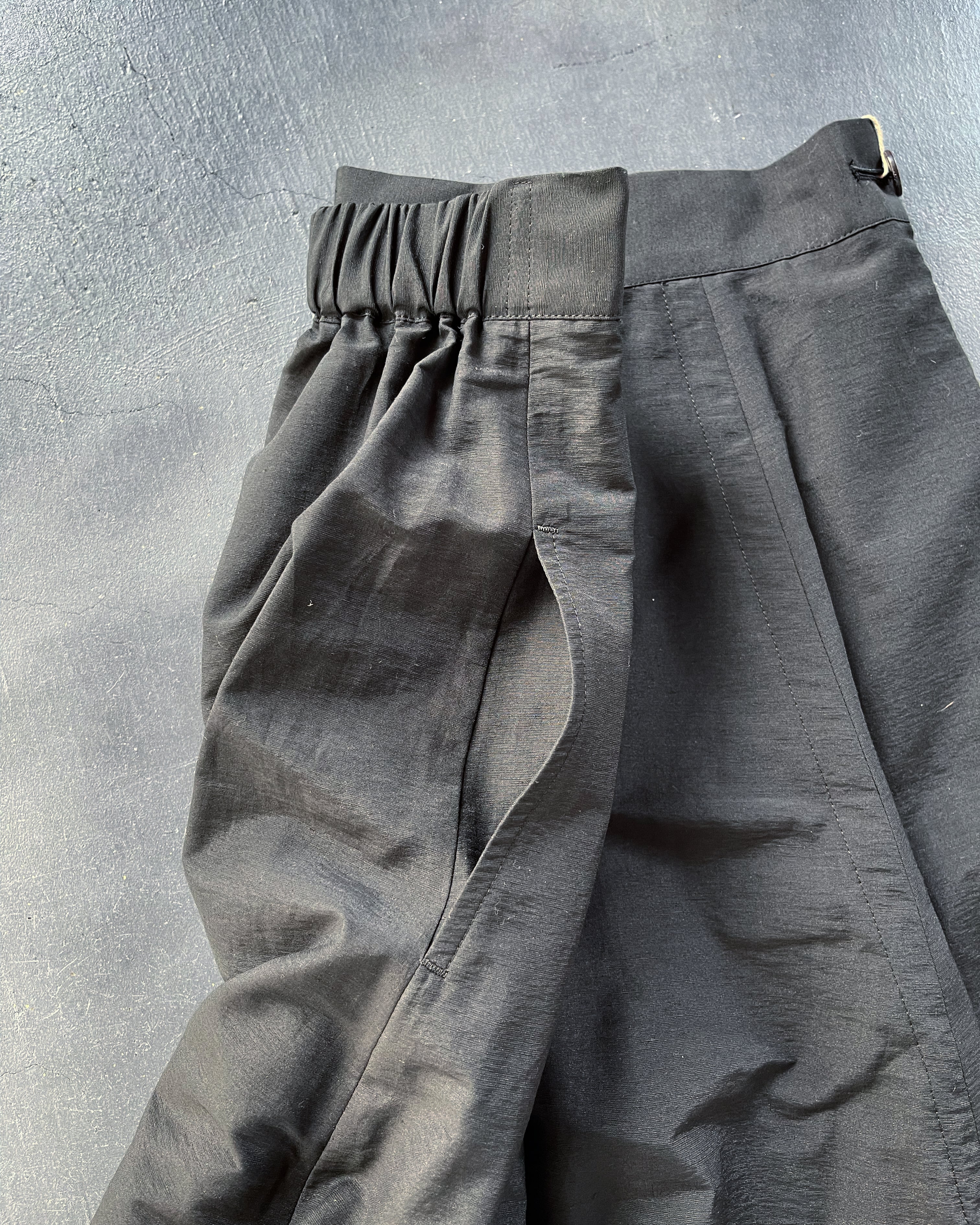 前見頃の紐を絞るとギャザーで丈を上げられます。