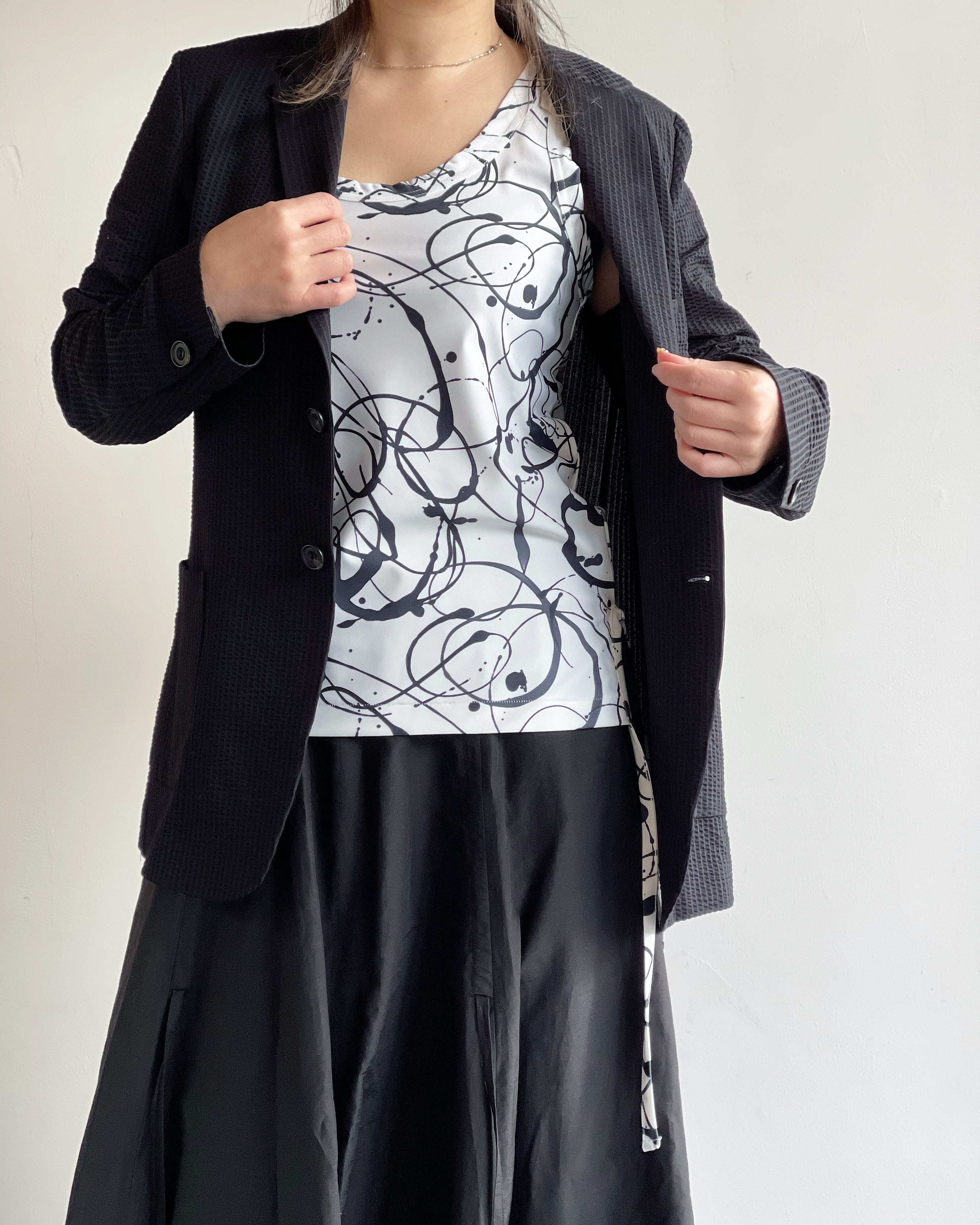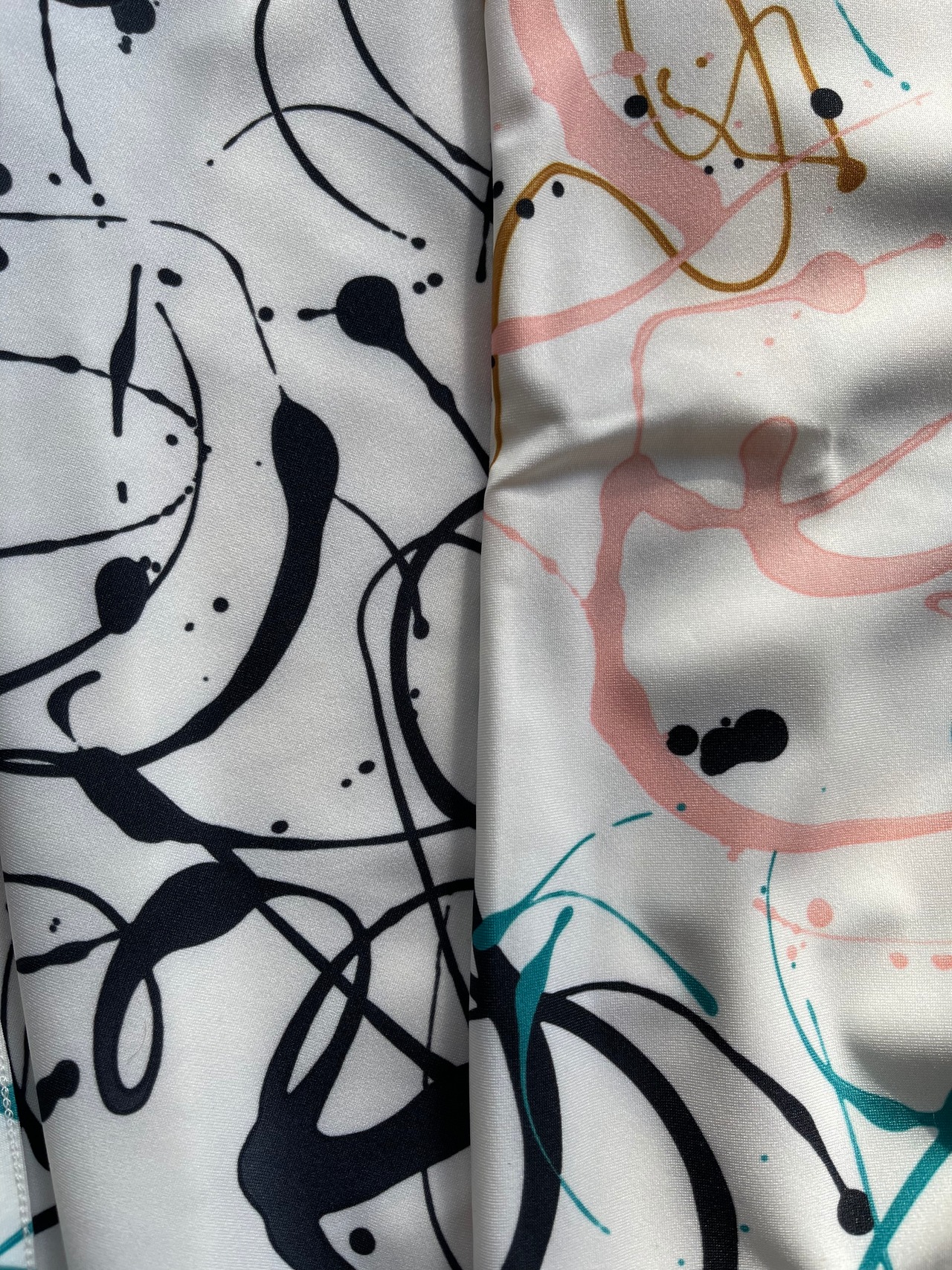 4wayストレッチ・吸水速乾・UVケアの機能を兼ね備えたスポーティーな生地に、ジャクソン・ポロックに代表される抽象表現主義アートのアクションペインティング(ドリッピング技法)によるオリジナル図案をプリントしてあります。