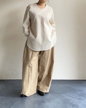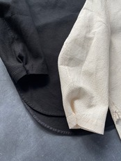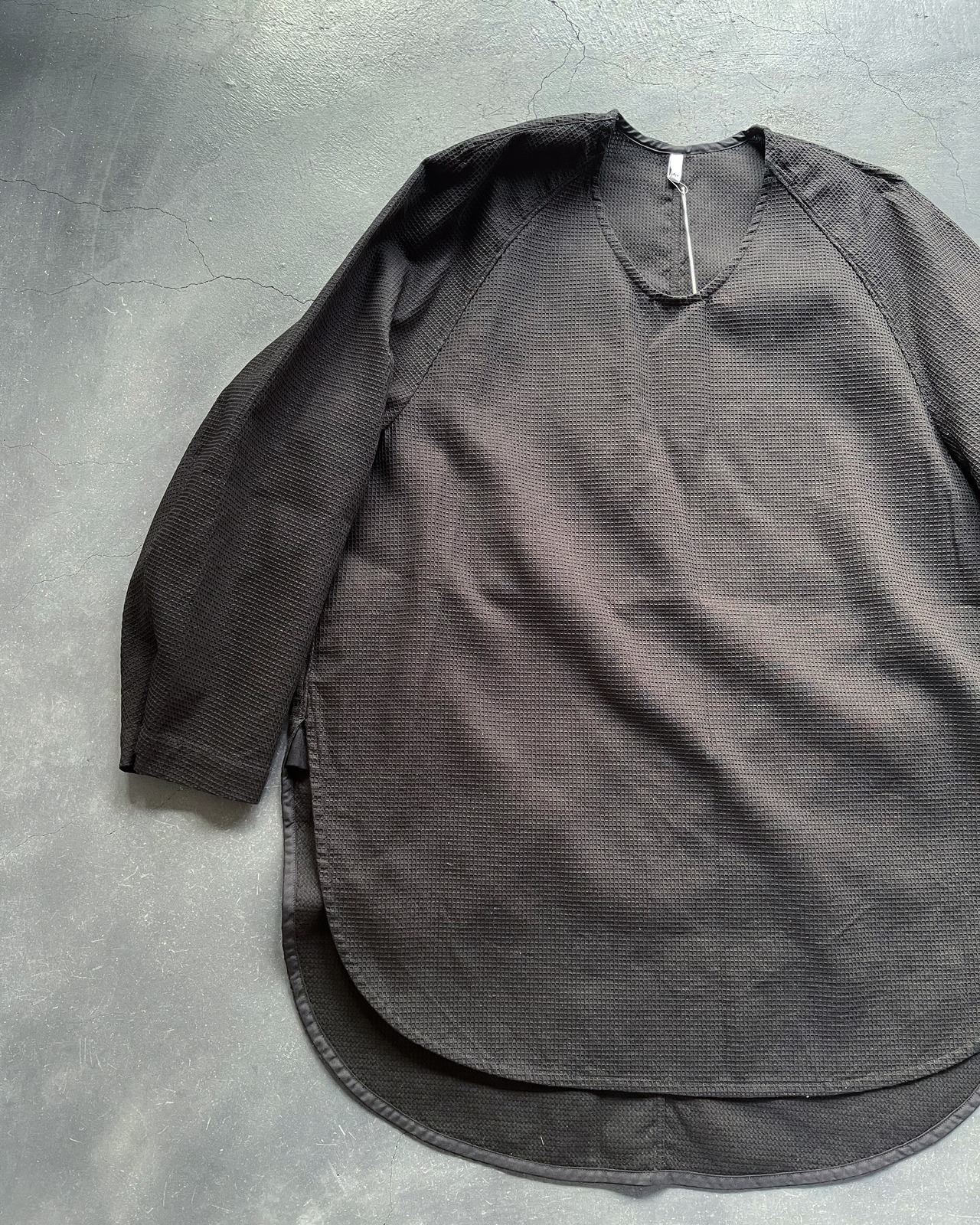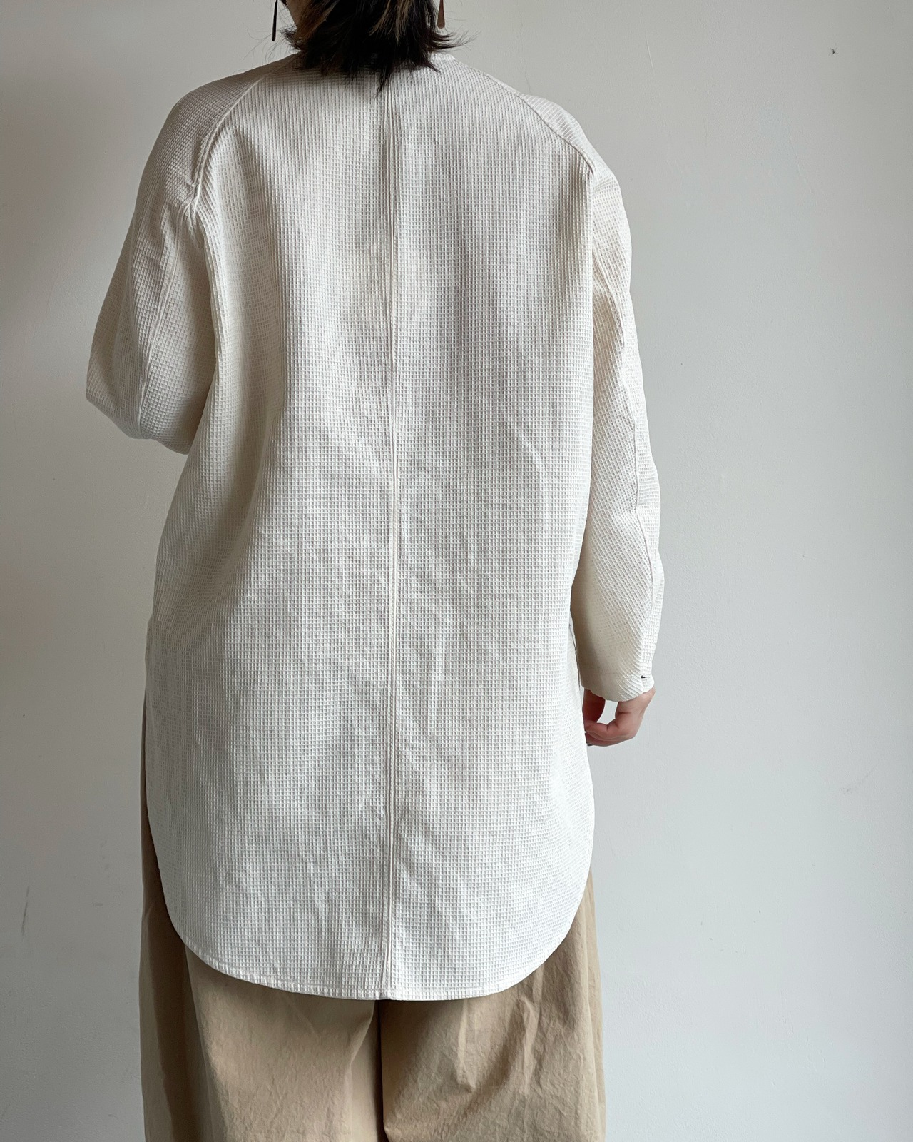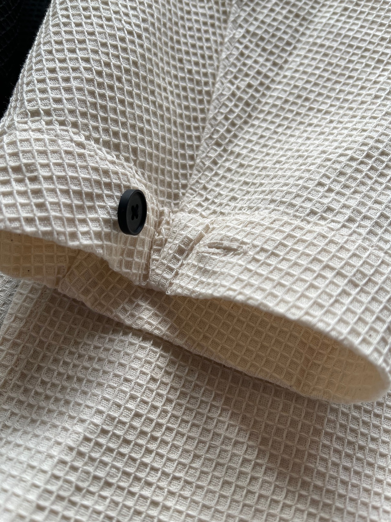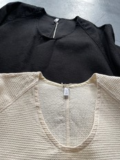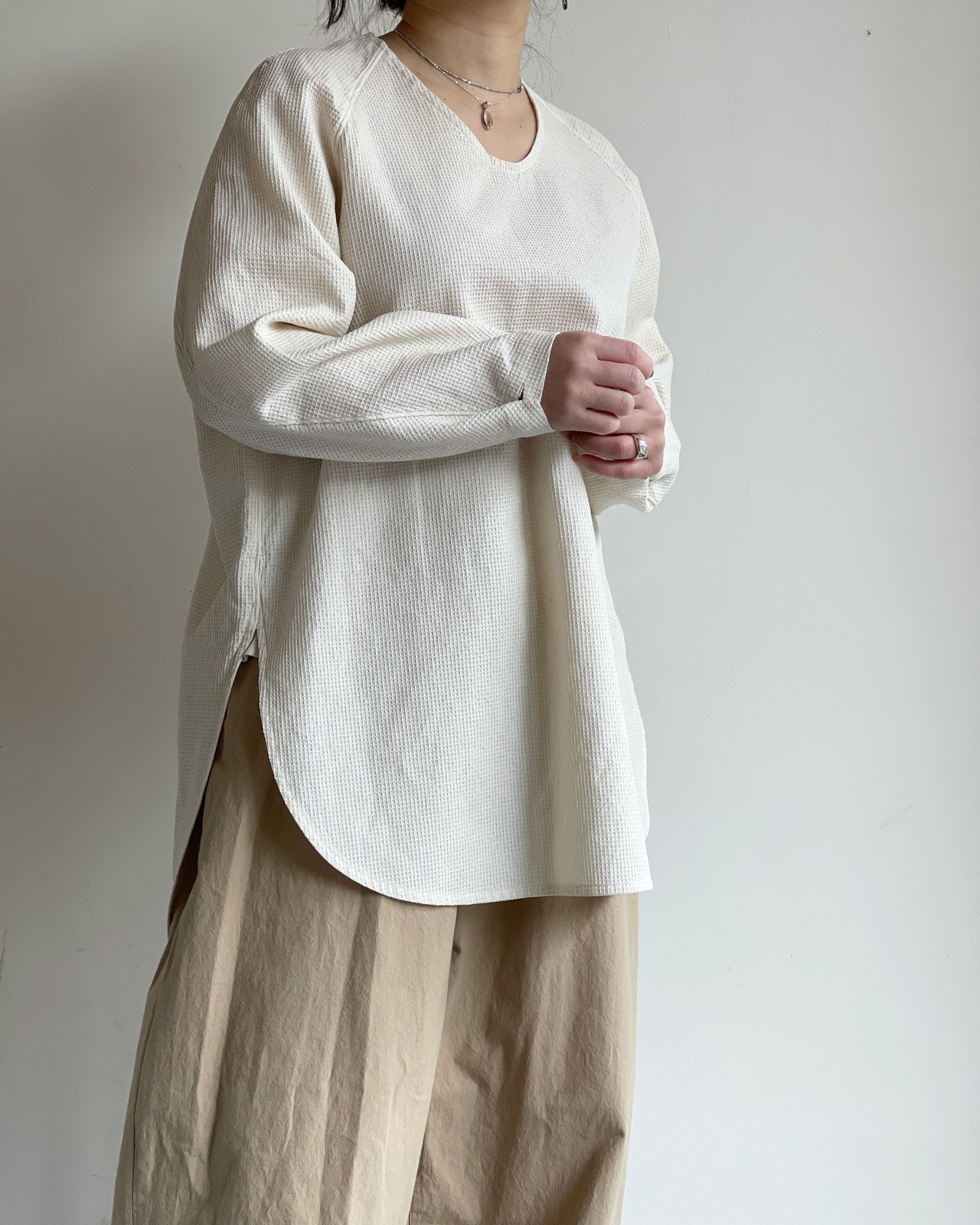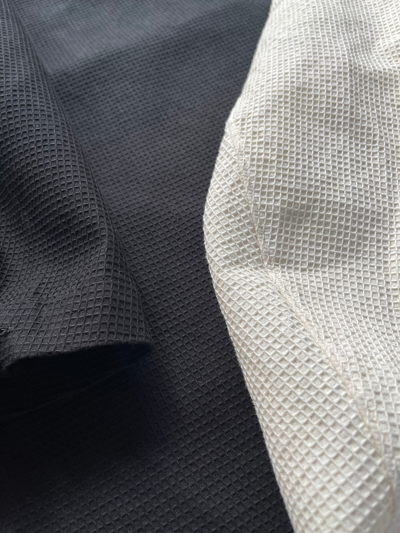 布帛サーマルワッフル素材のウィークポイントであったひっかけにも強く、通常の布帛サーマルワッフルなどに比べるとやや高密なイメージ。