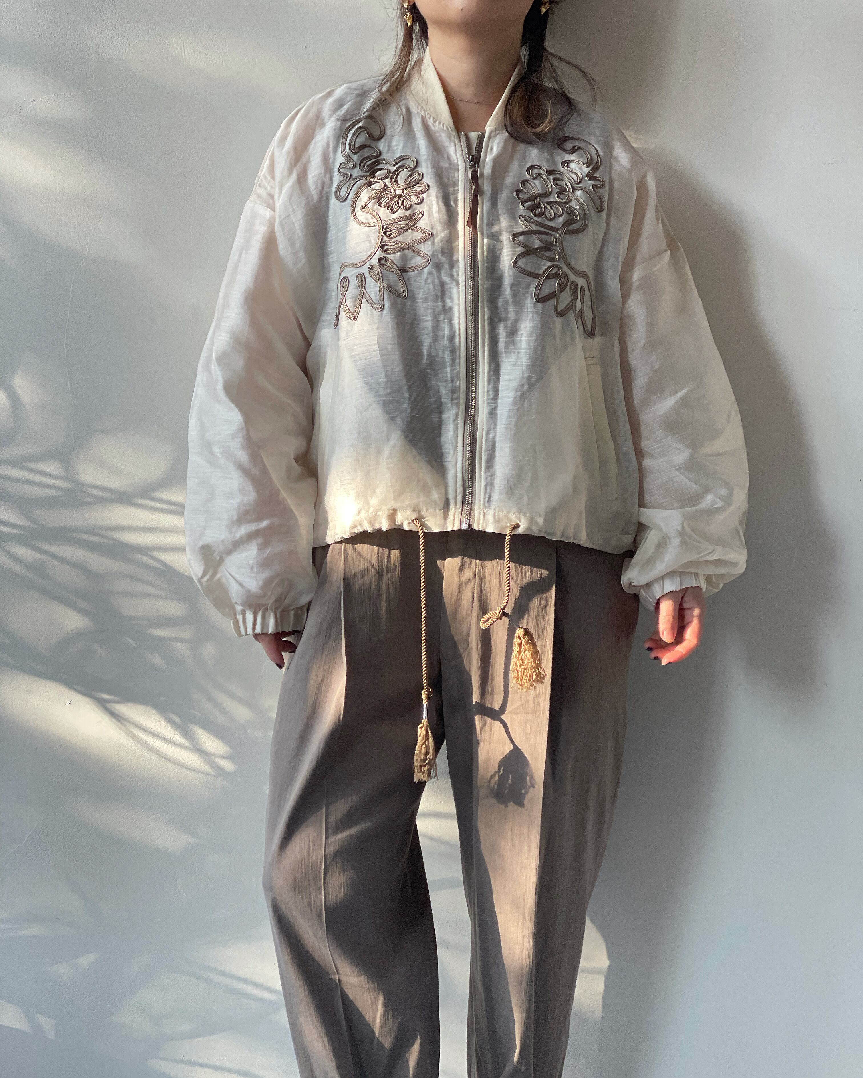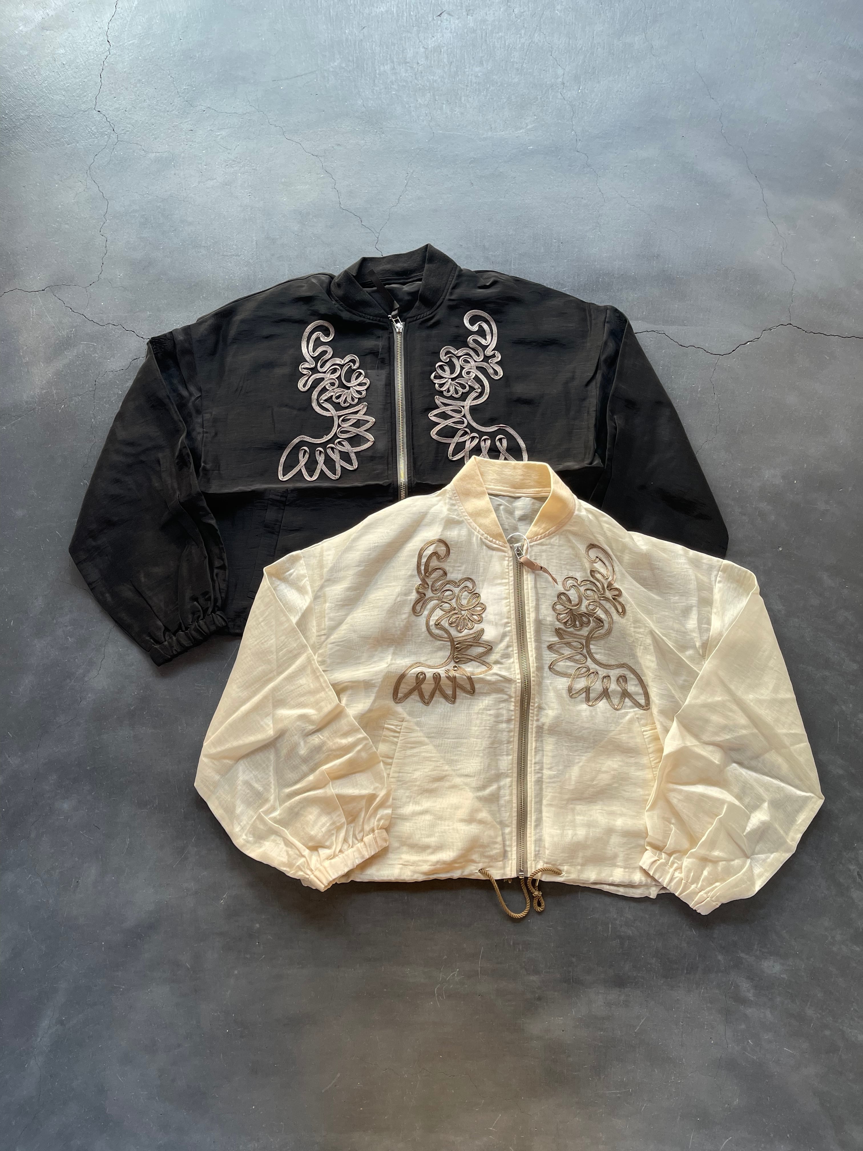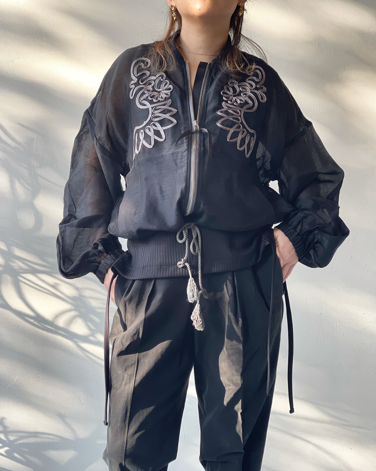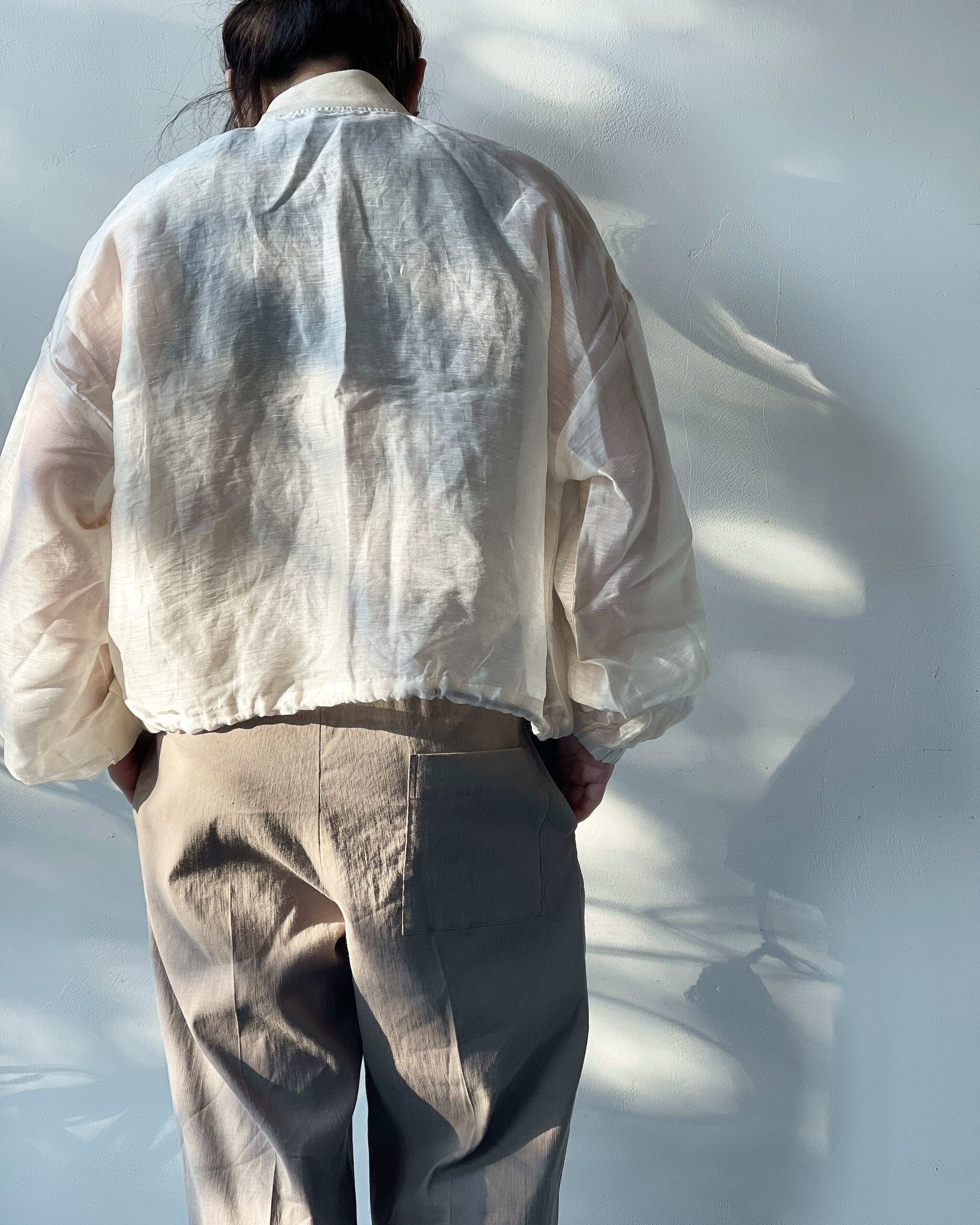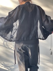 シアー素材を使用したややドレッシーなショートブルゾン。