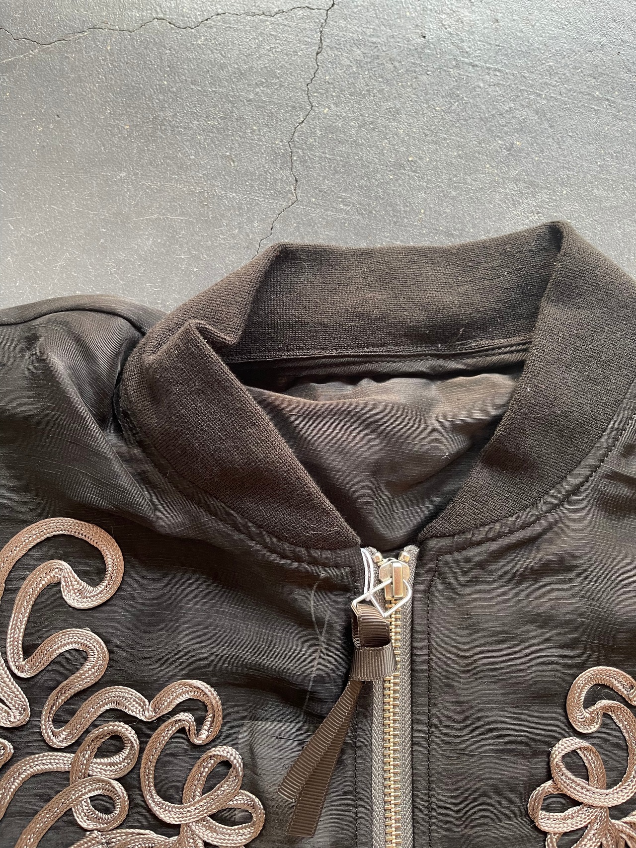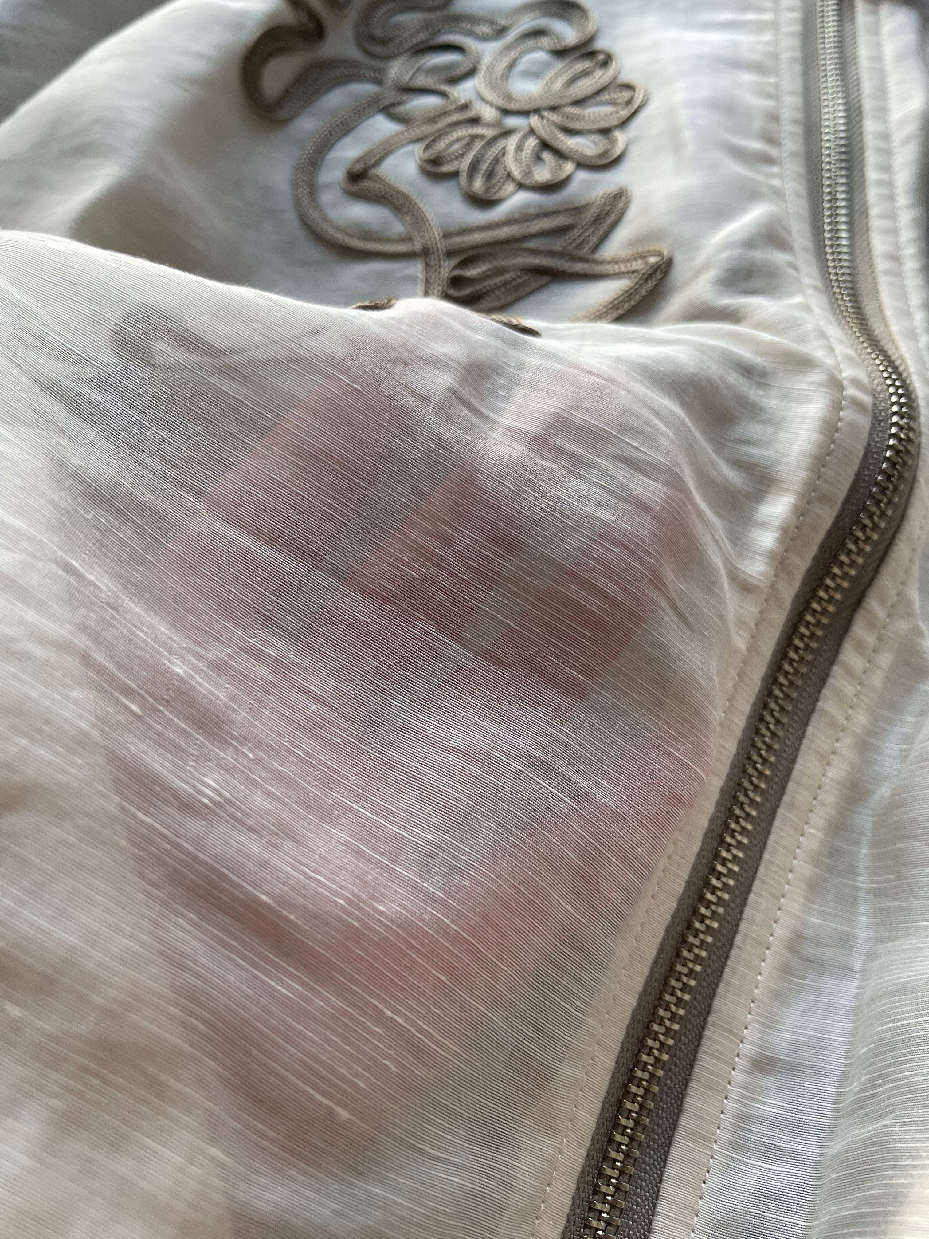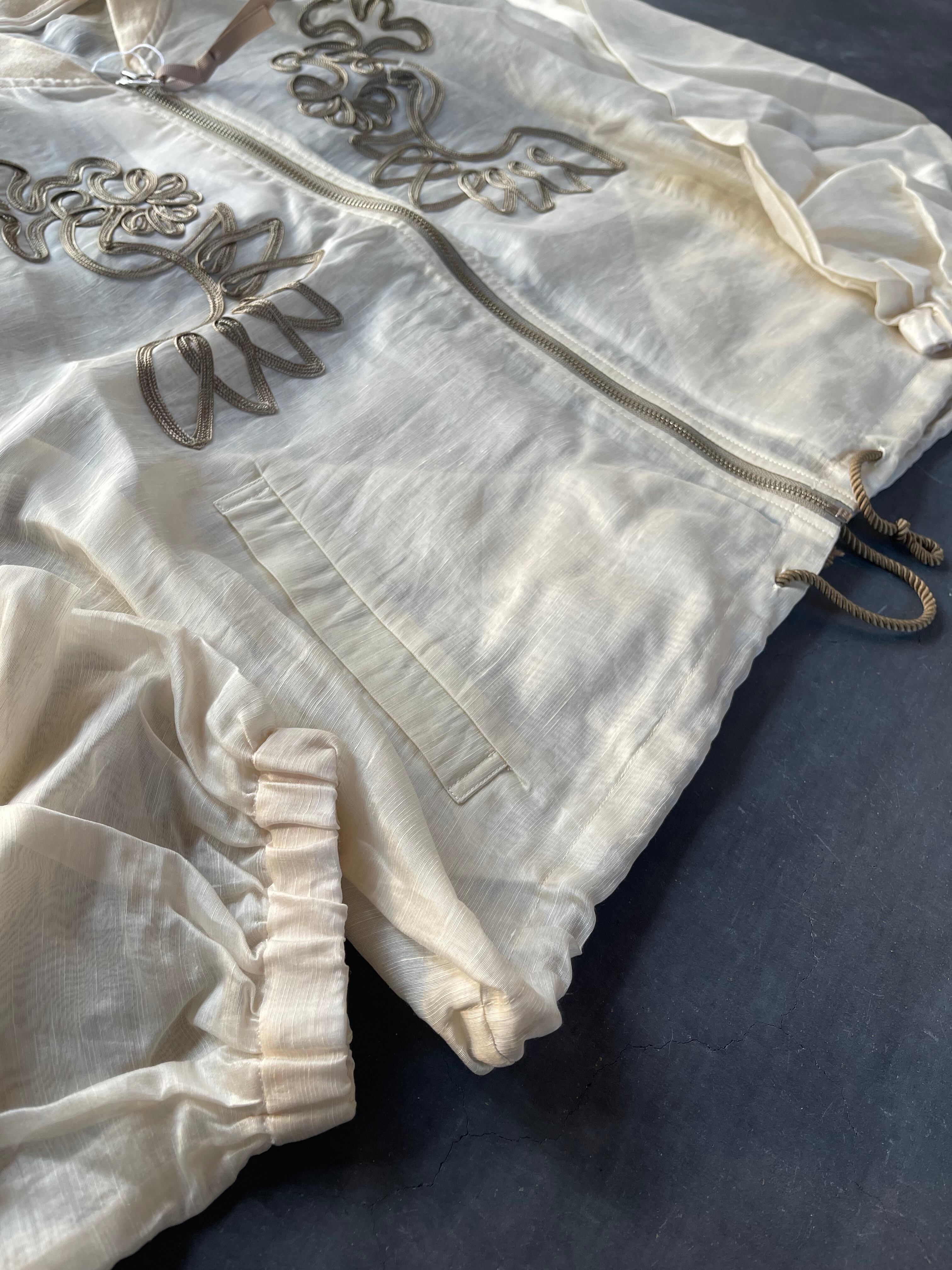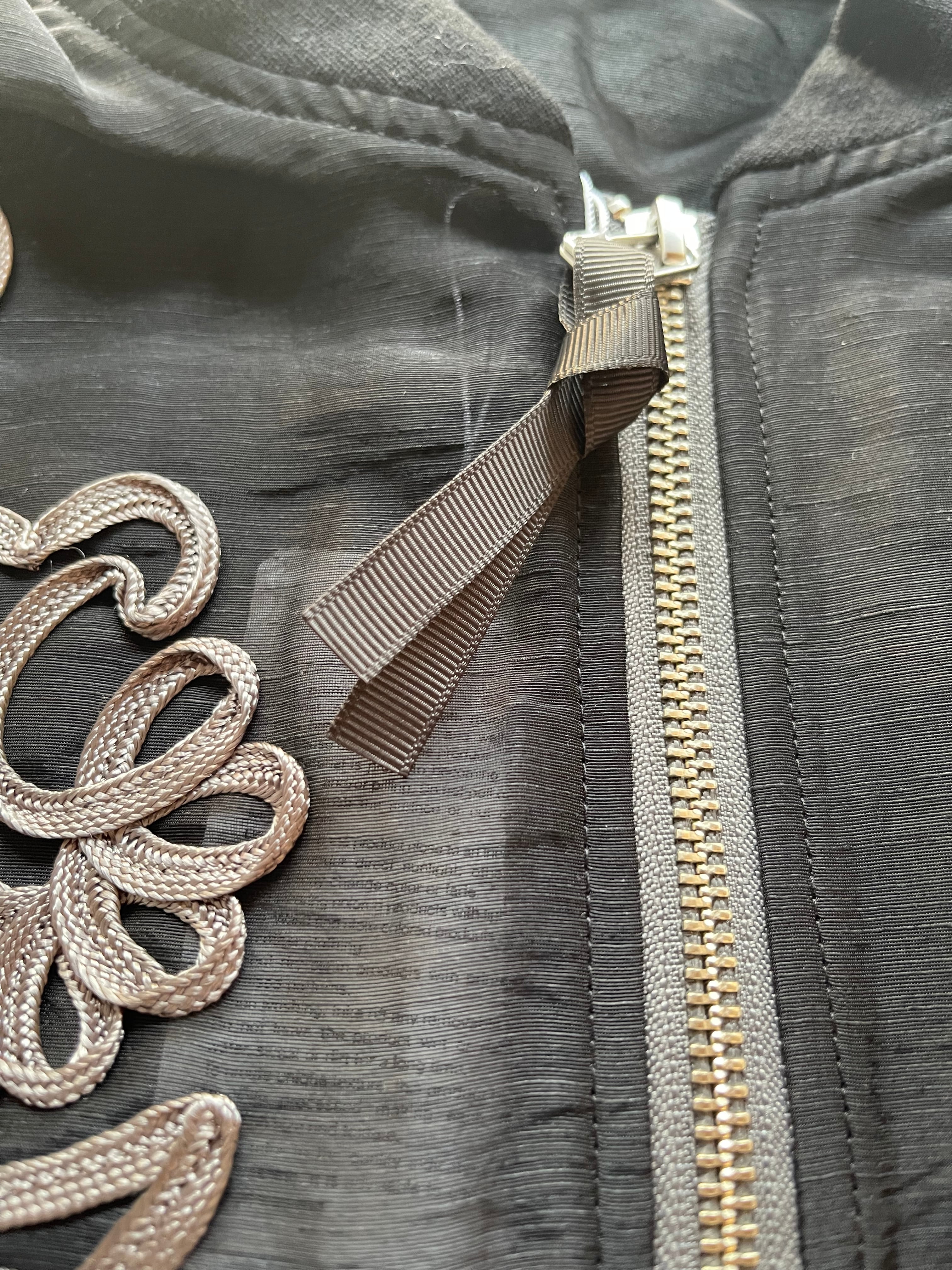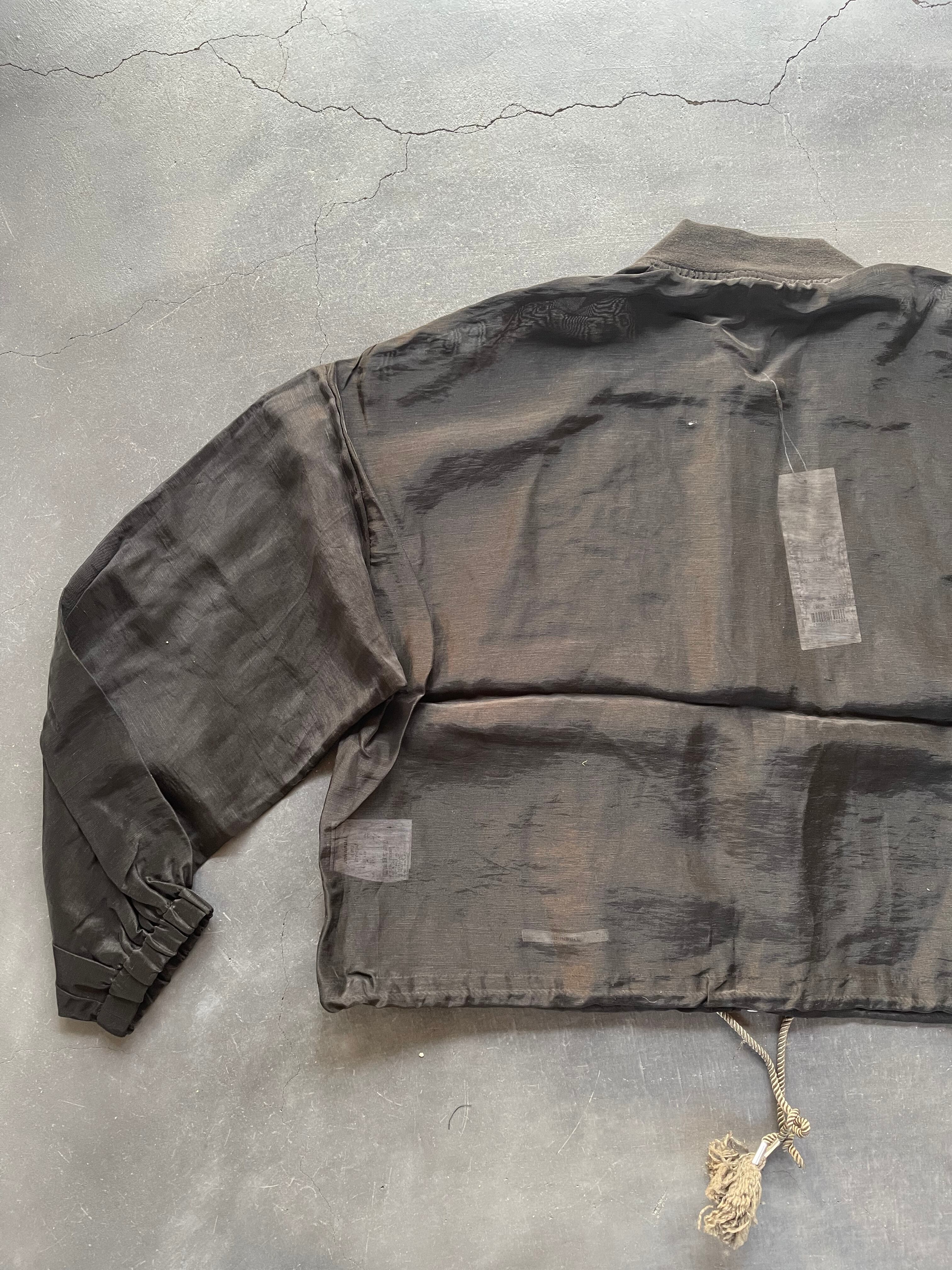 シアー素材を使用したややドレッシーなショートブルゾン。