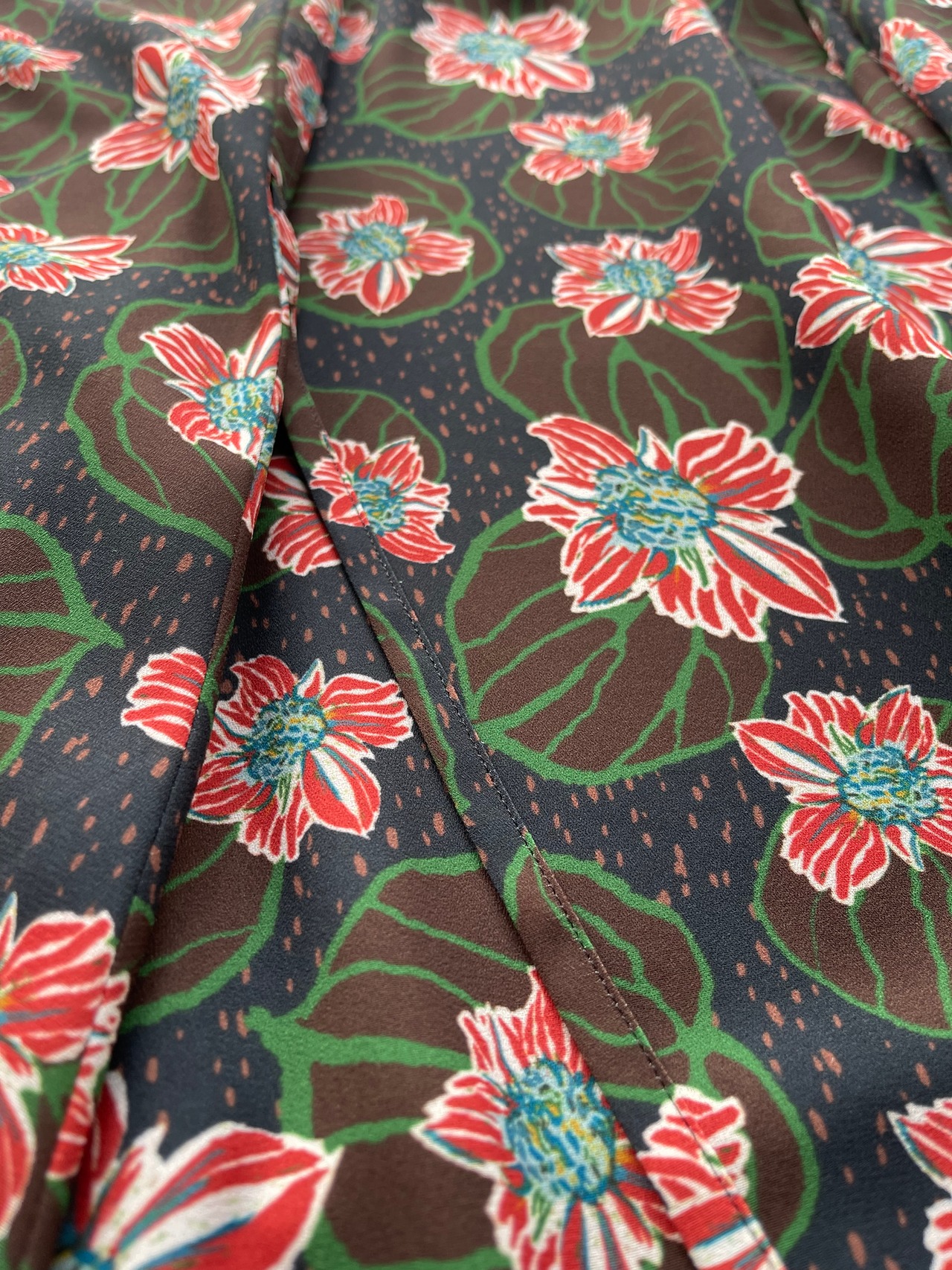 手描きならではの歪み、滲みと、クールで機械的な表現方法の相反する特徴の融合によって、都会的でモダンな独特の印象に仕上げた新感覚フローラル柄プリント素材です。