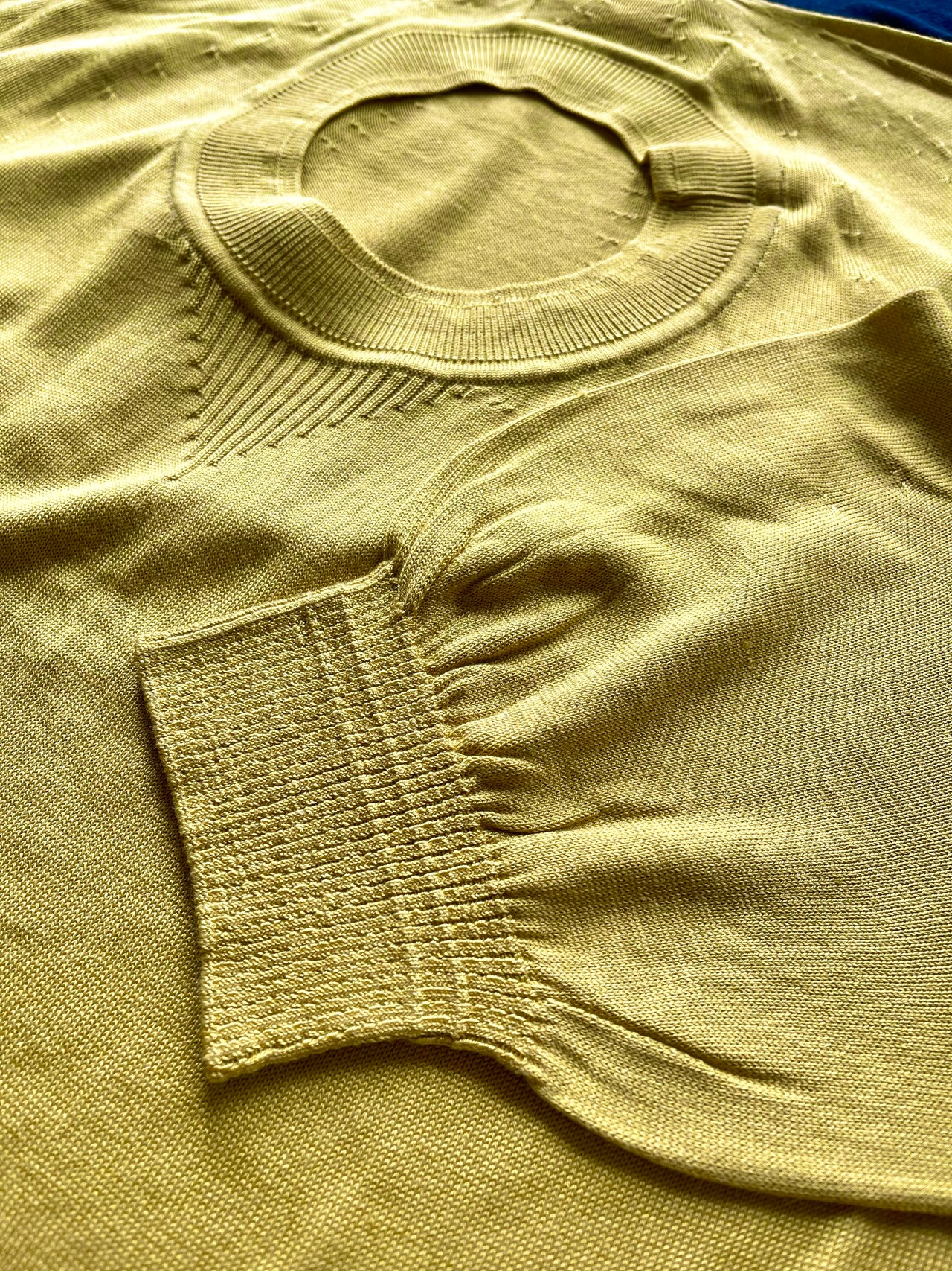 通常より光沢を抑えた繊細で上品なタッチの最高級シルク糸に独自のプロテインコーティング加工を施すことで、伸び縮みしずらく、白化現象を軽減させ、家庭洗濯まで可能にしたシルク100%ニットです。