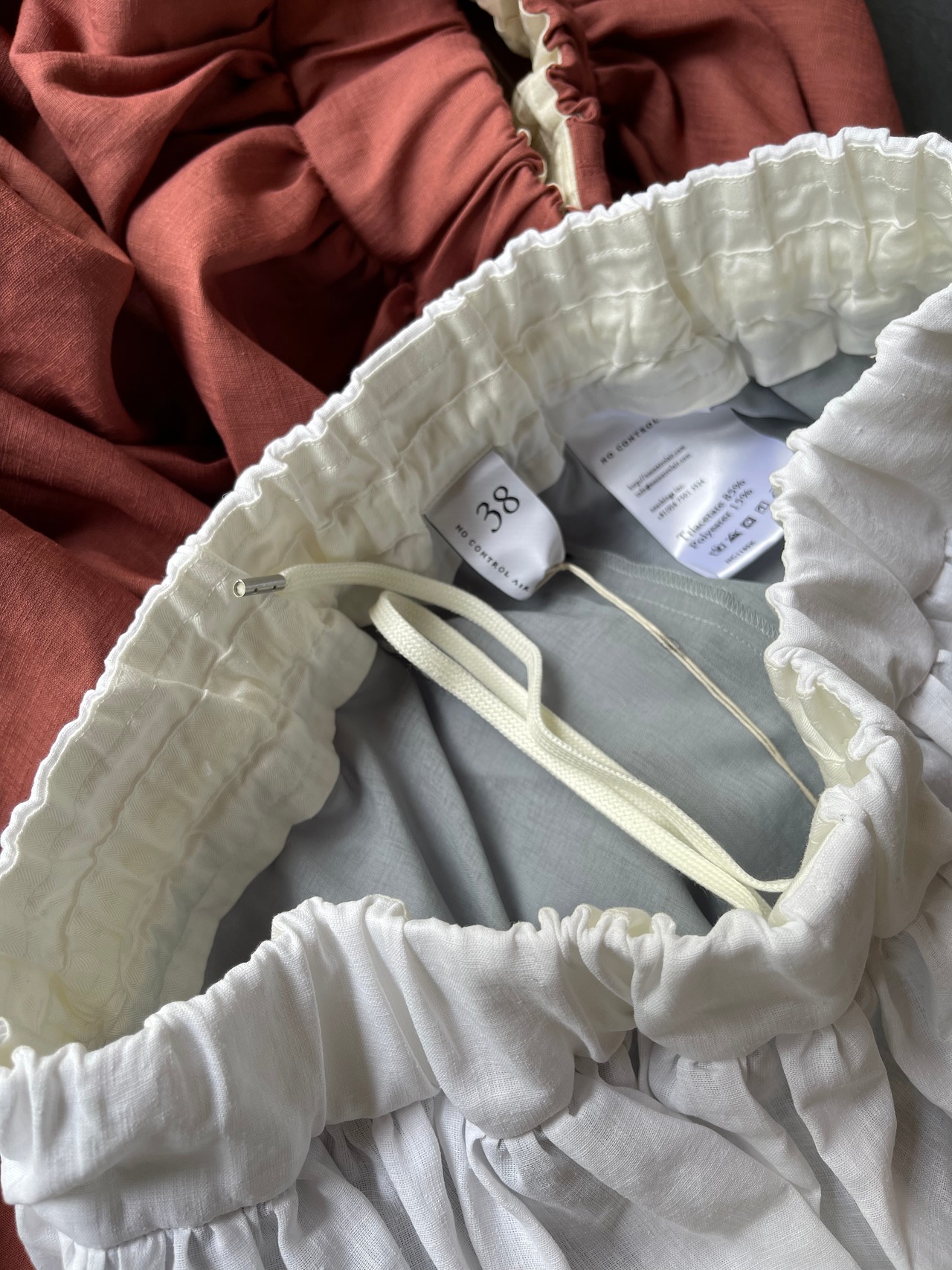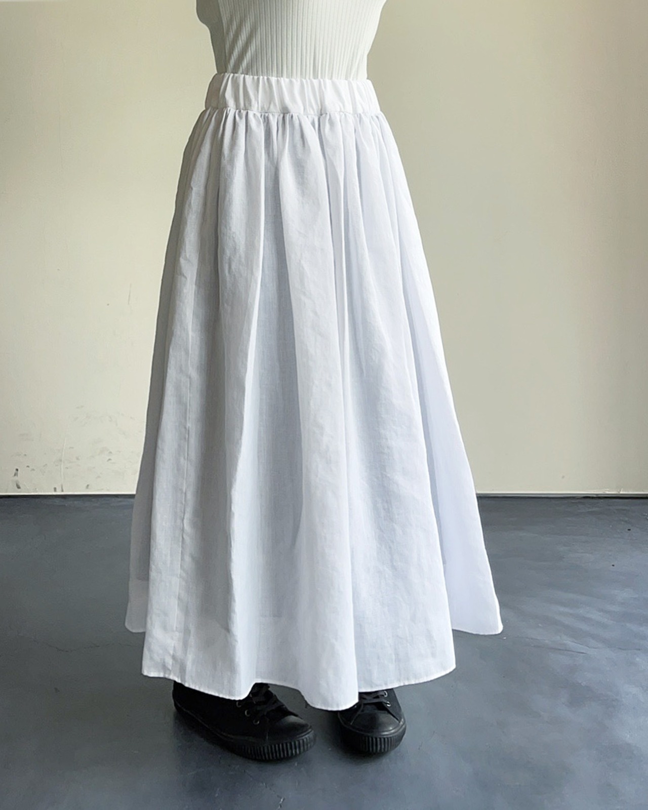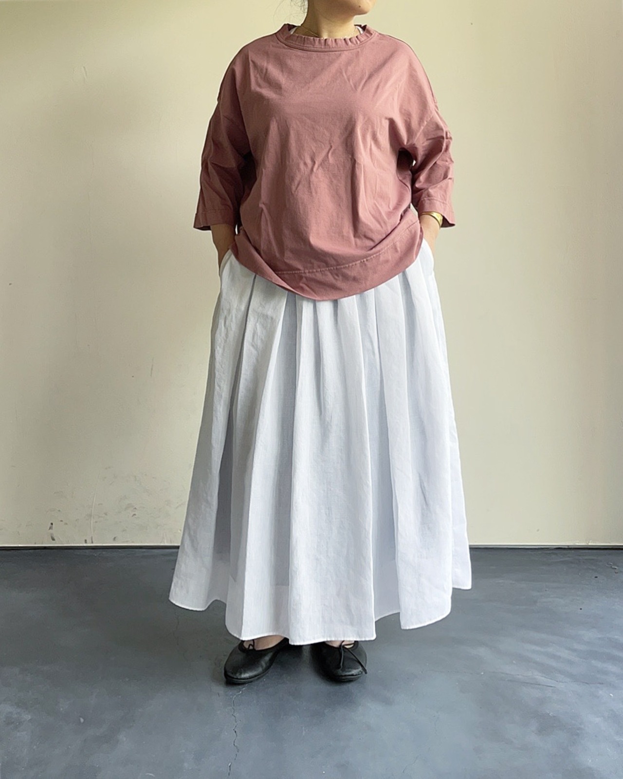 細番手のスラブトリアセテートを使用した甘平織のガーゼ生地です。トリアセテート糸の表面にマイクロファイバーコーティングを施し麻のような質感を出しています。とてもシワになりにくく、薄く軽い生地感です。洗いによる形態の変化も少なく扱いやすいストレスのない素材です。吸水速乾、接触冷感の機能があります。00.Whiteは透け感がありますが、濃色はそれほど透け感はありません。