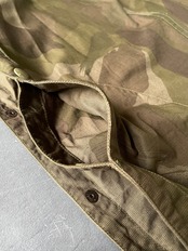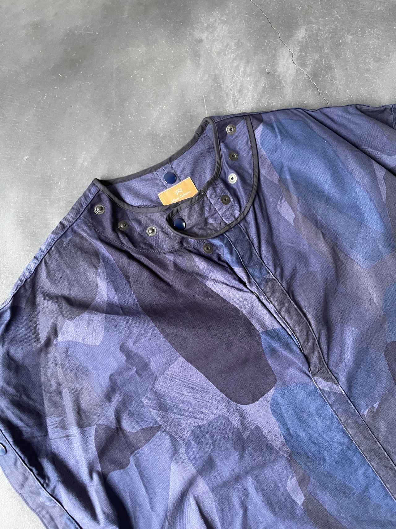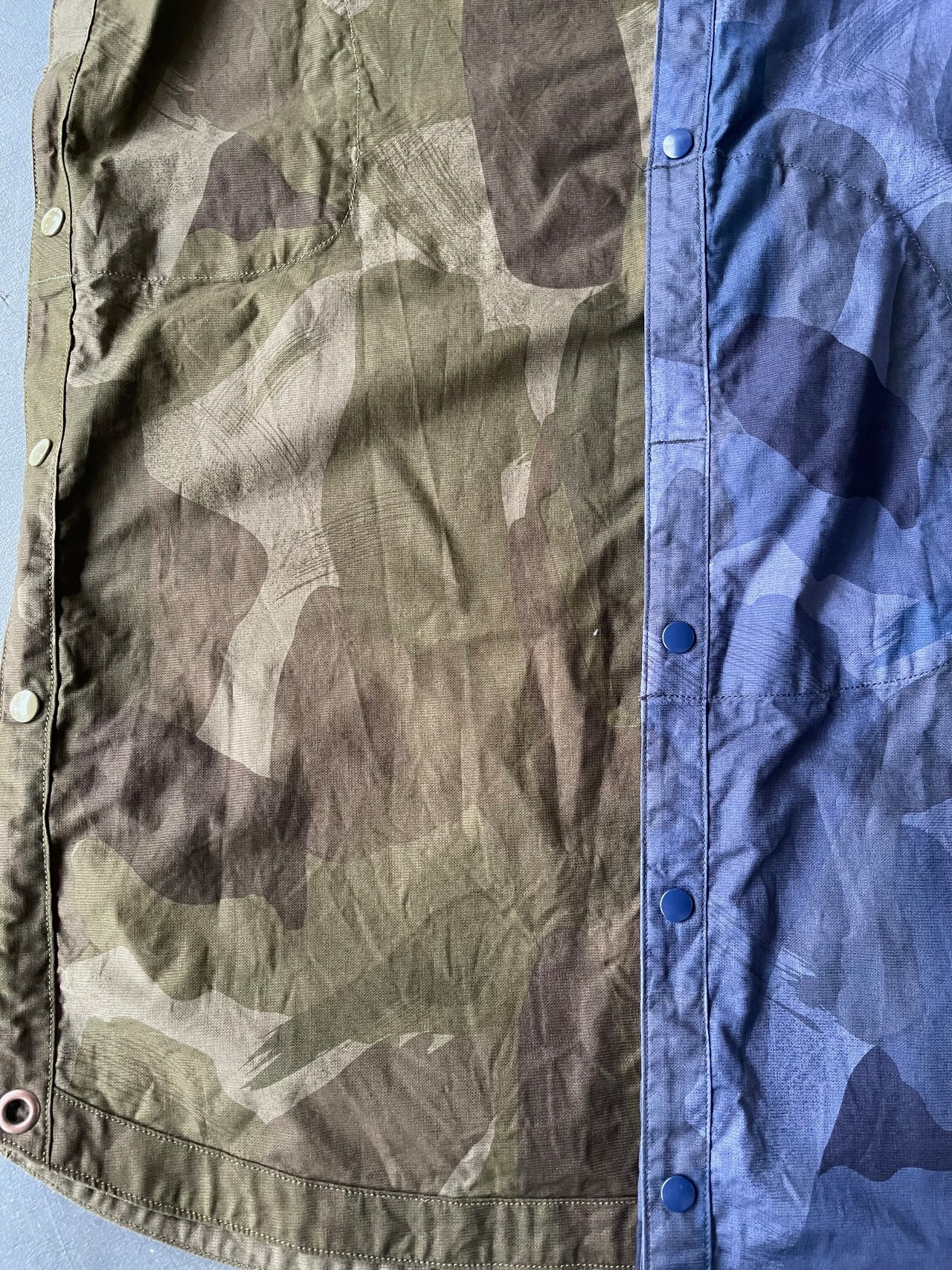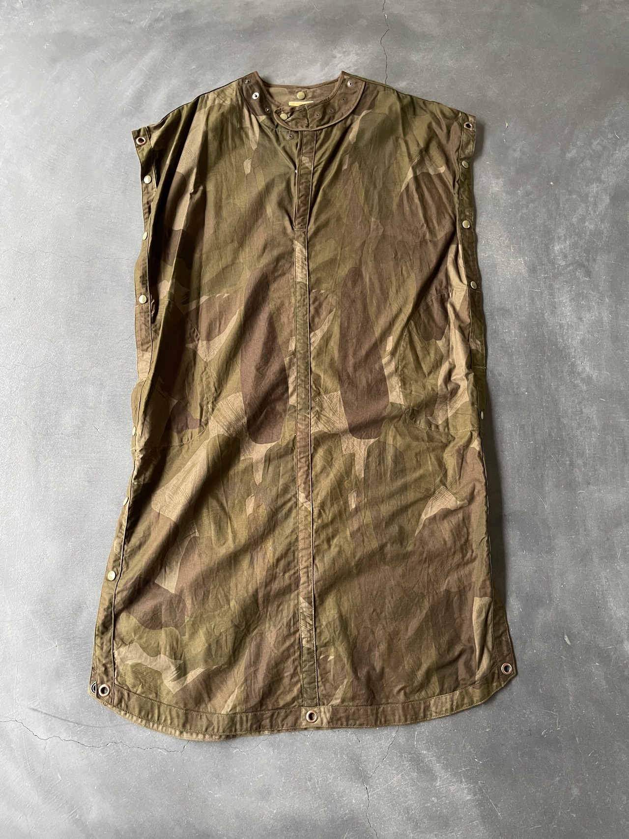 ナイジェル・ケーボン氏のアーカイブである大変珍しいフロッグスキンカモ柄のポンチョテントを参考に、ワンピースは、左右の脇がドットボタンのためフルオープンになります。ロングジレの様に着こなす事もできます。左右裾と前後中心のハトメは、タープとして使用する際にペグを打ったり、紐を通す為の仕様を残しています。