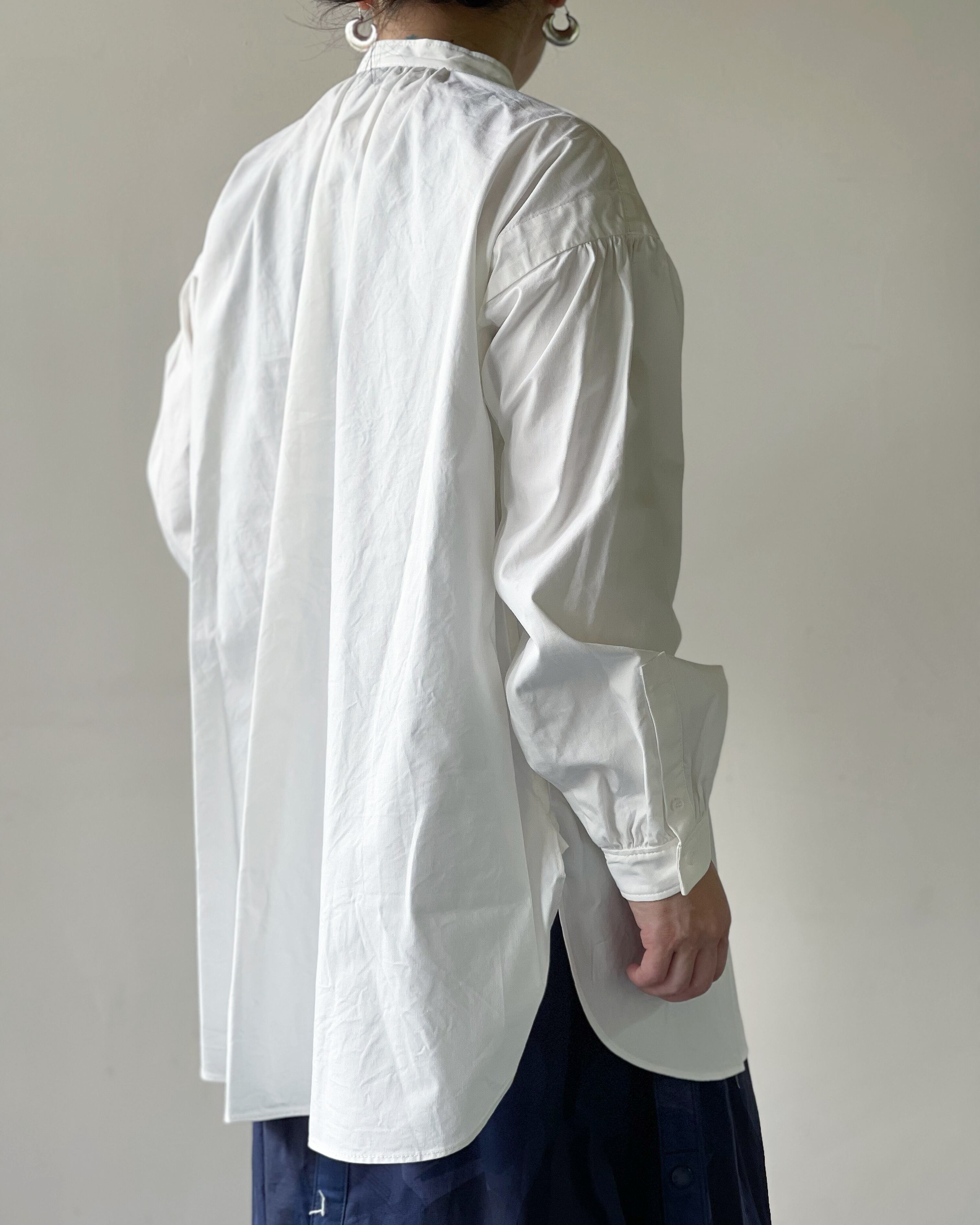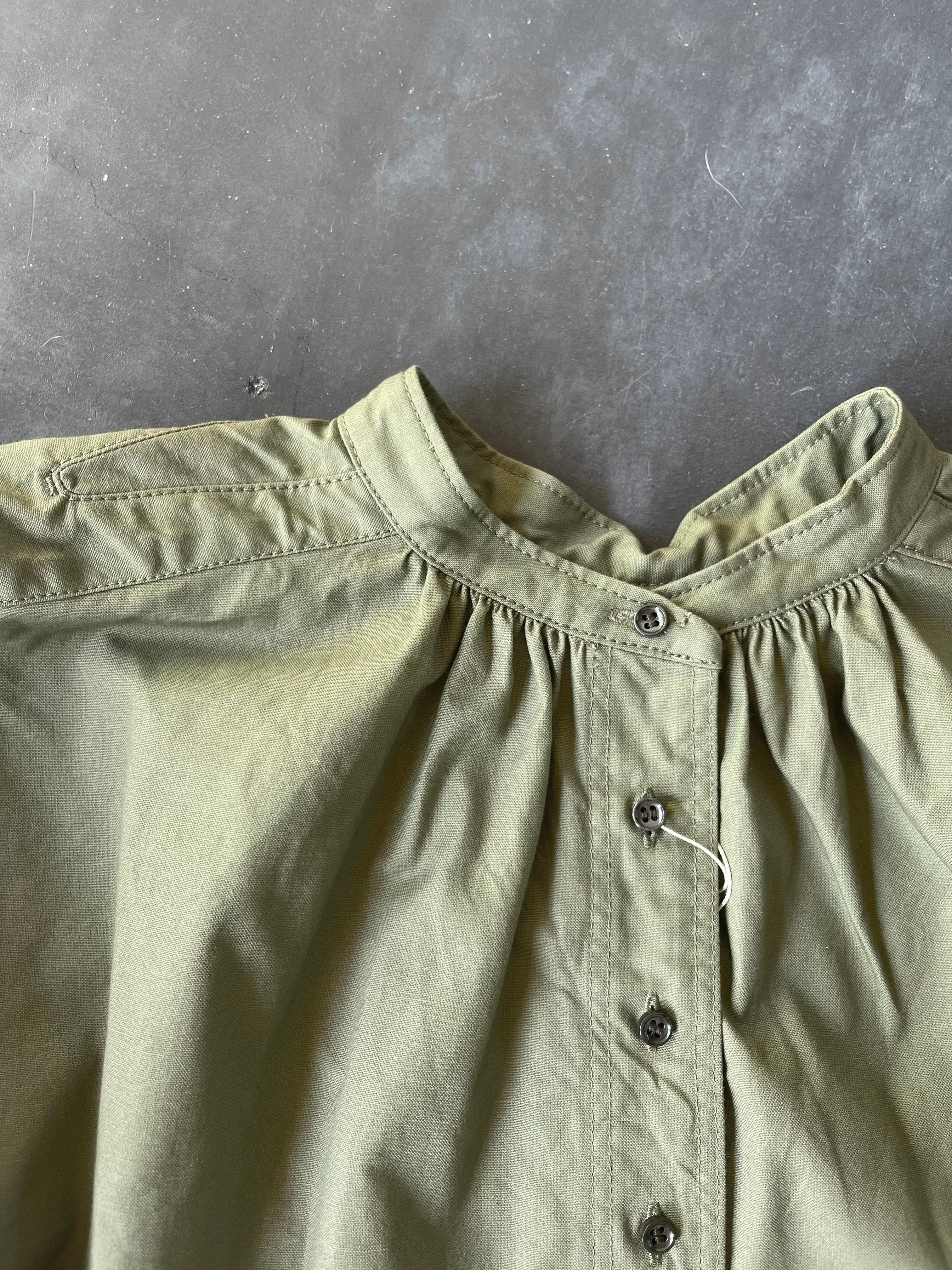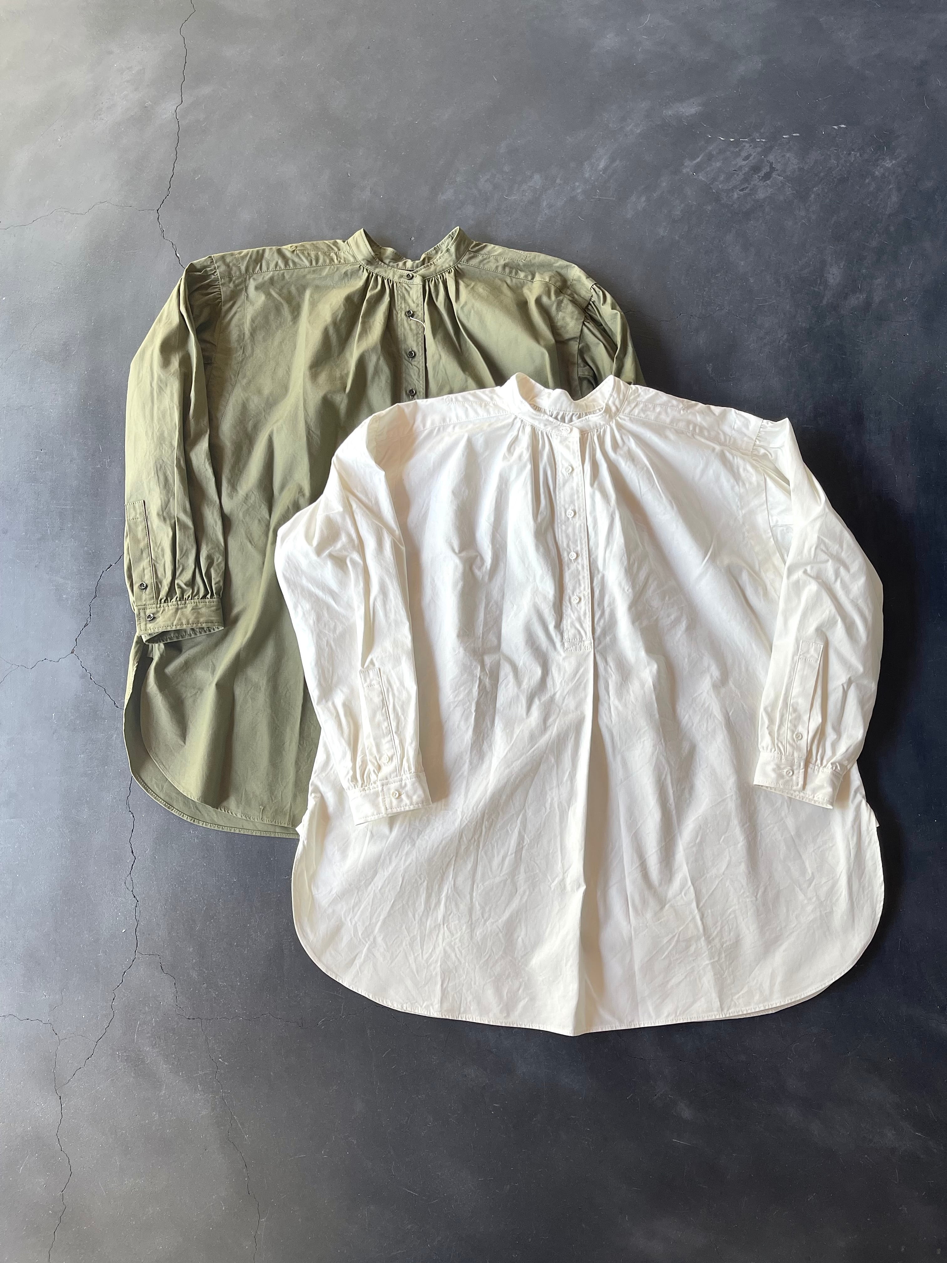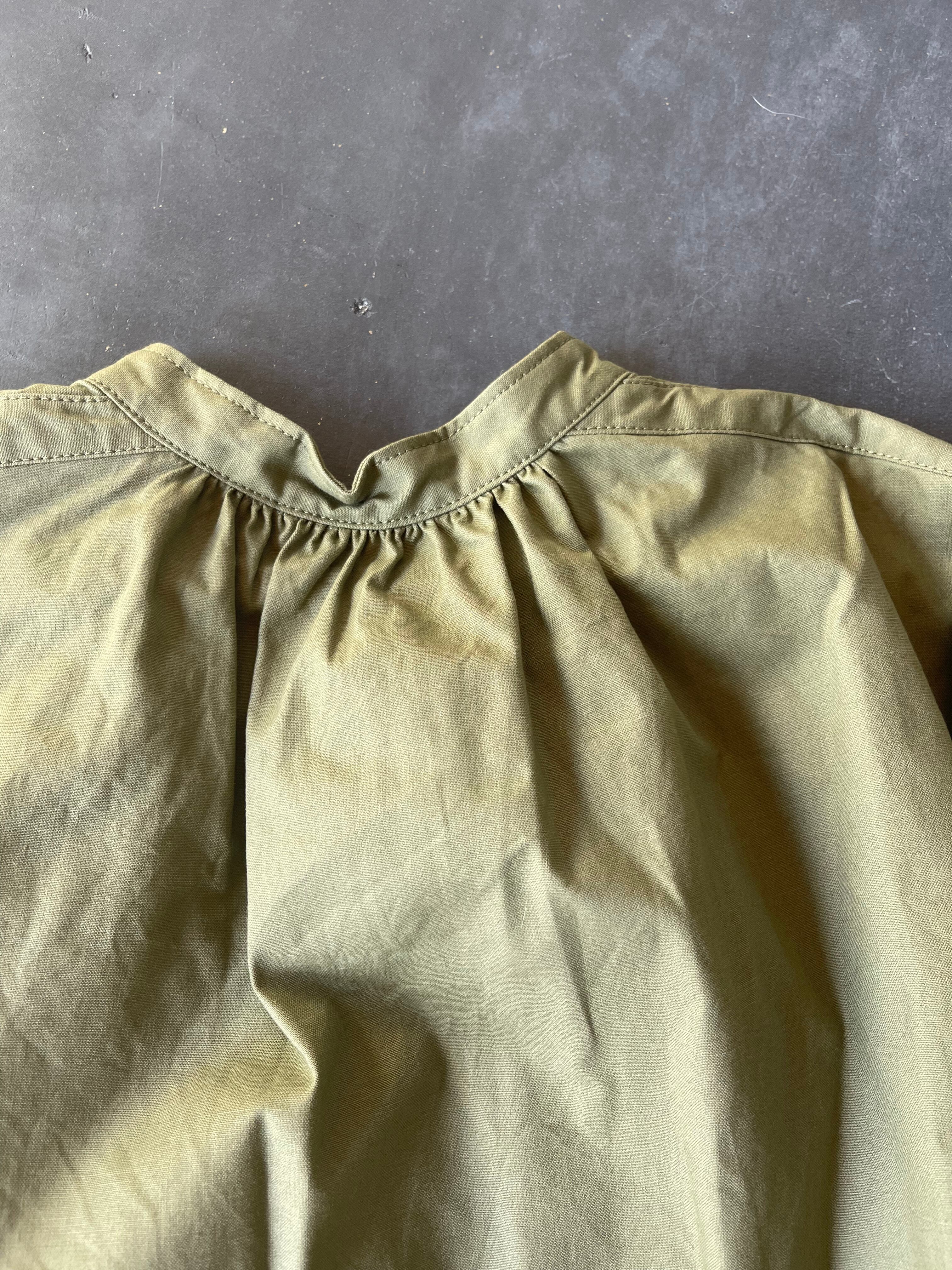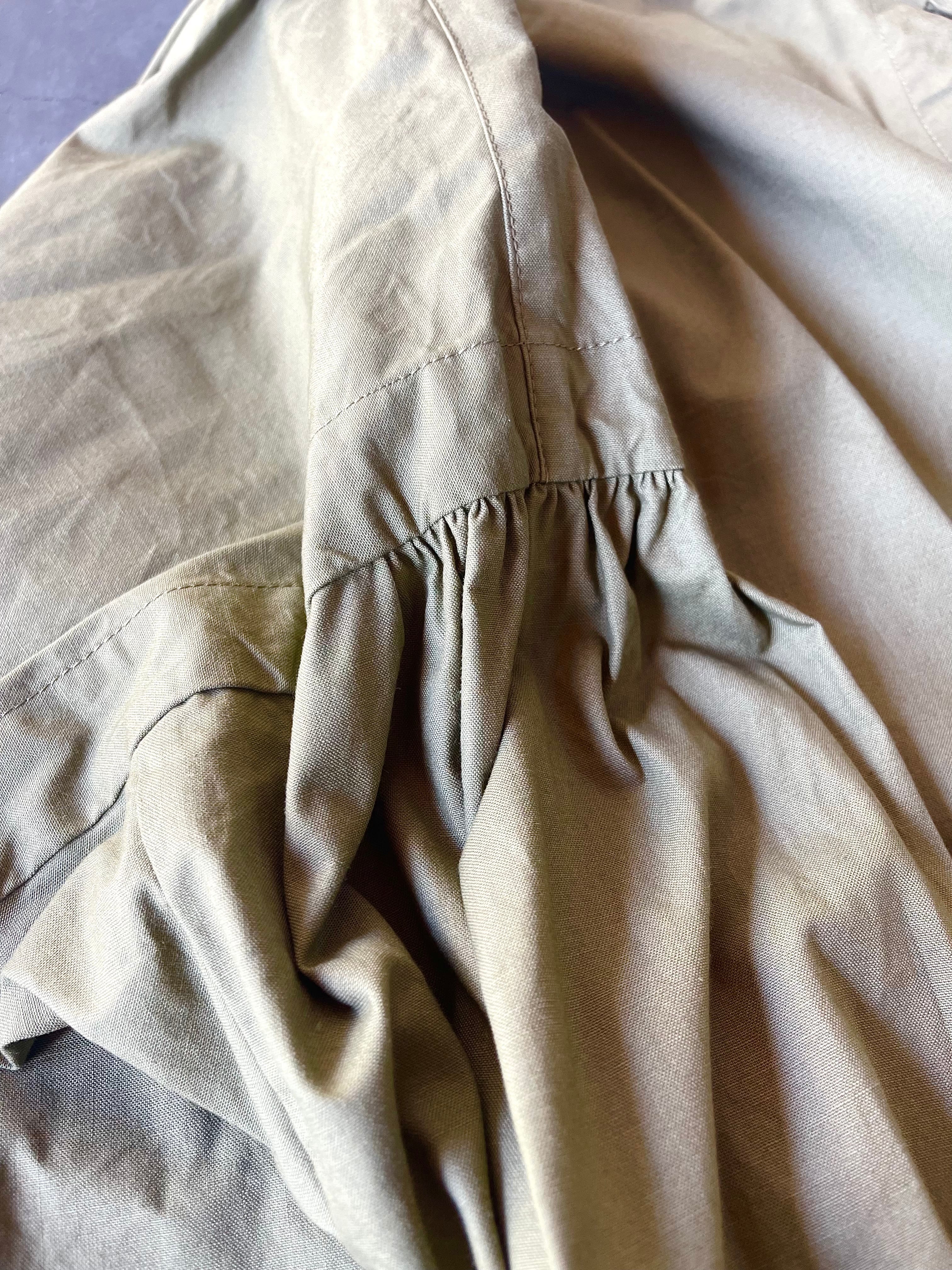 M-43ブルゾンの生地を再現した、ハリのあるコットンオックス素材のギャザースリーブブラウスです。たっぷりとギャザーを寄せた袖は、1920年代のフランスのドレスを参考にデザインしており、膨らみ、立体感があるのが特徴です。