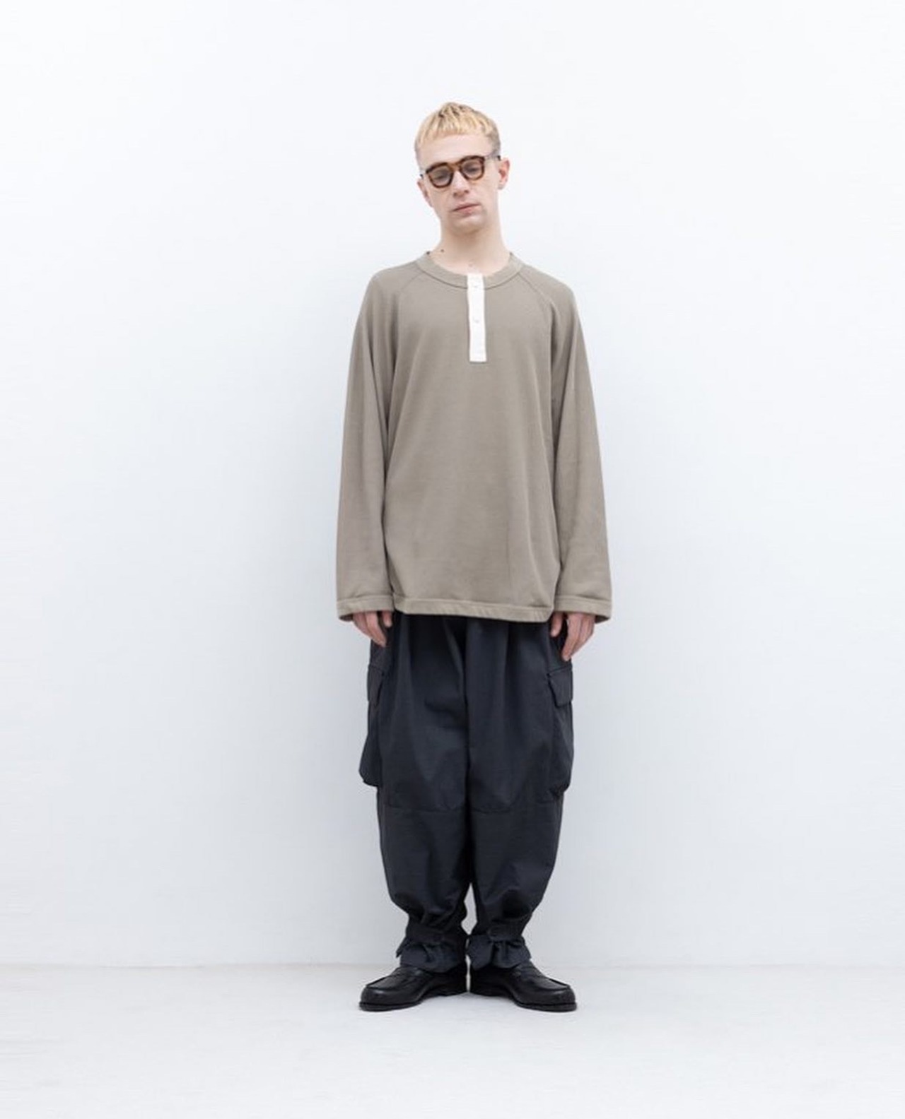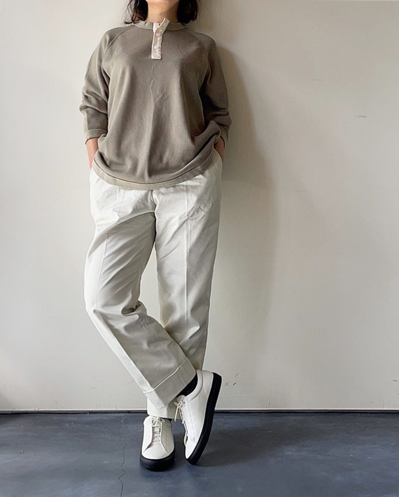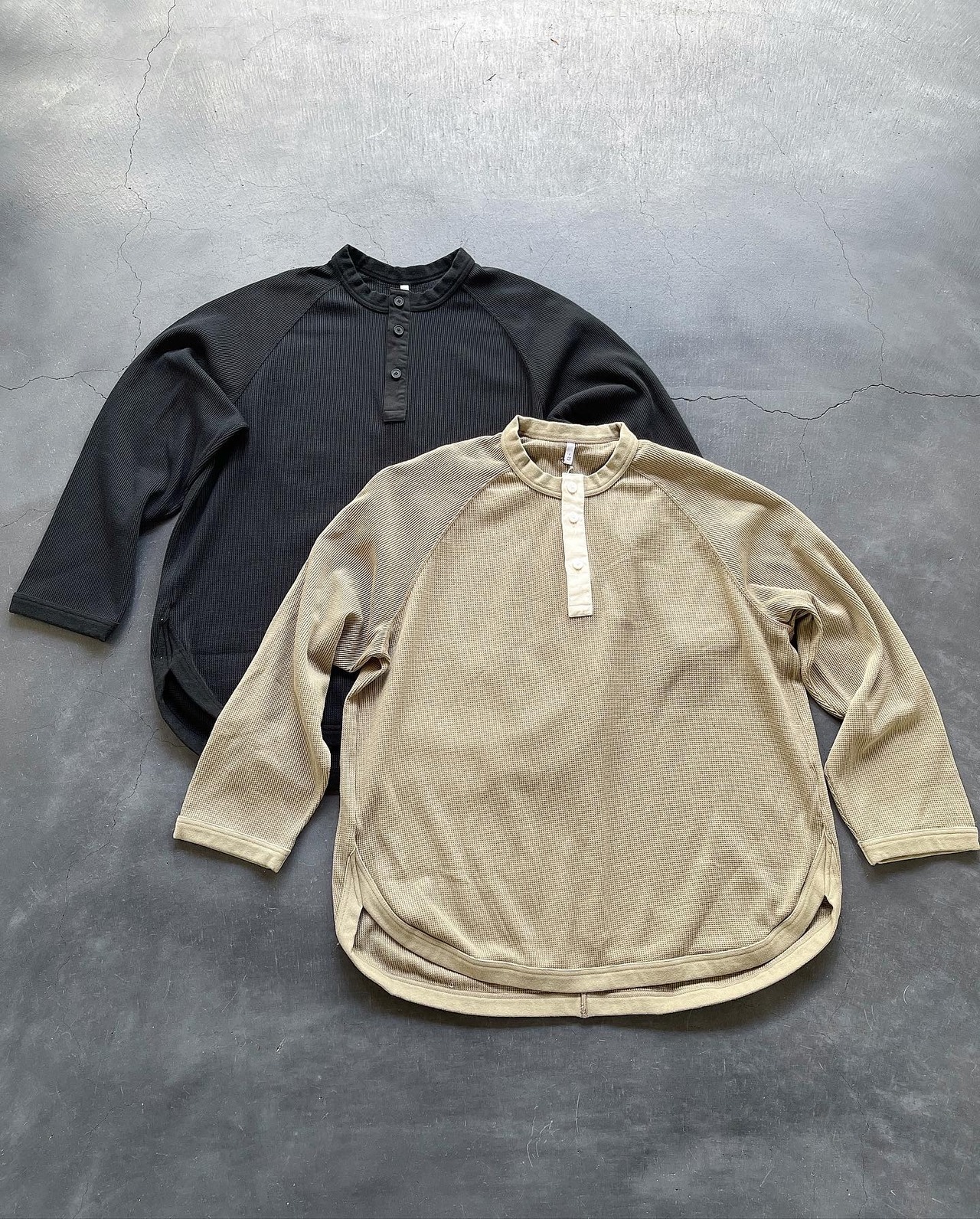 綿とポリエステルの交編のワッフル生地のニットです。綿100%のワッフルと比べてポリエステルと交編しているため、ダレが少ない強度のあるワッフルになります。洗ってタンブラー乾燥させてワッフルの凹凸をさらに引き出しています。
