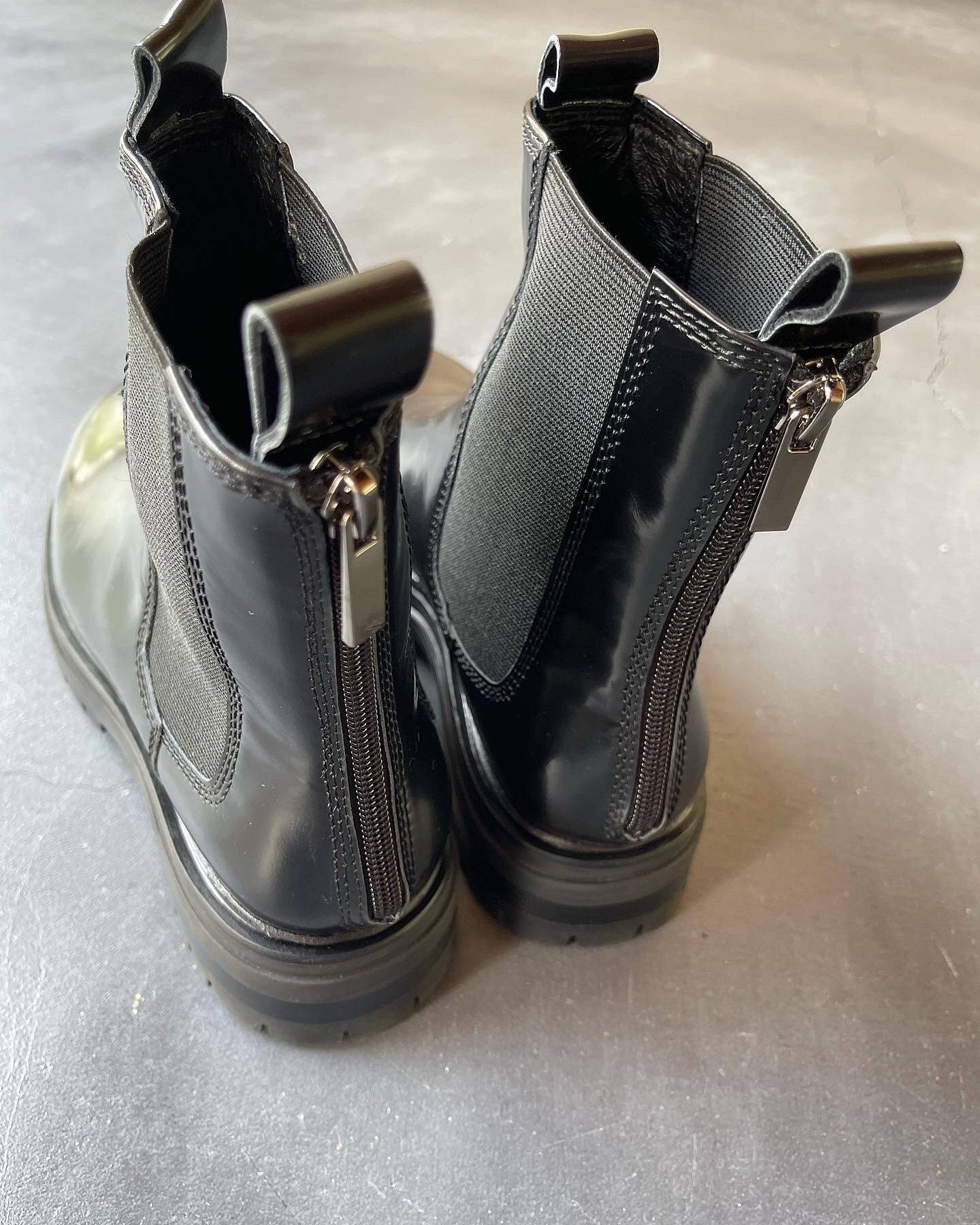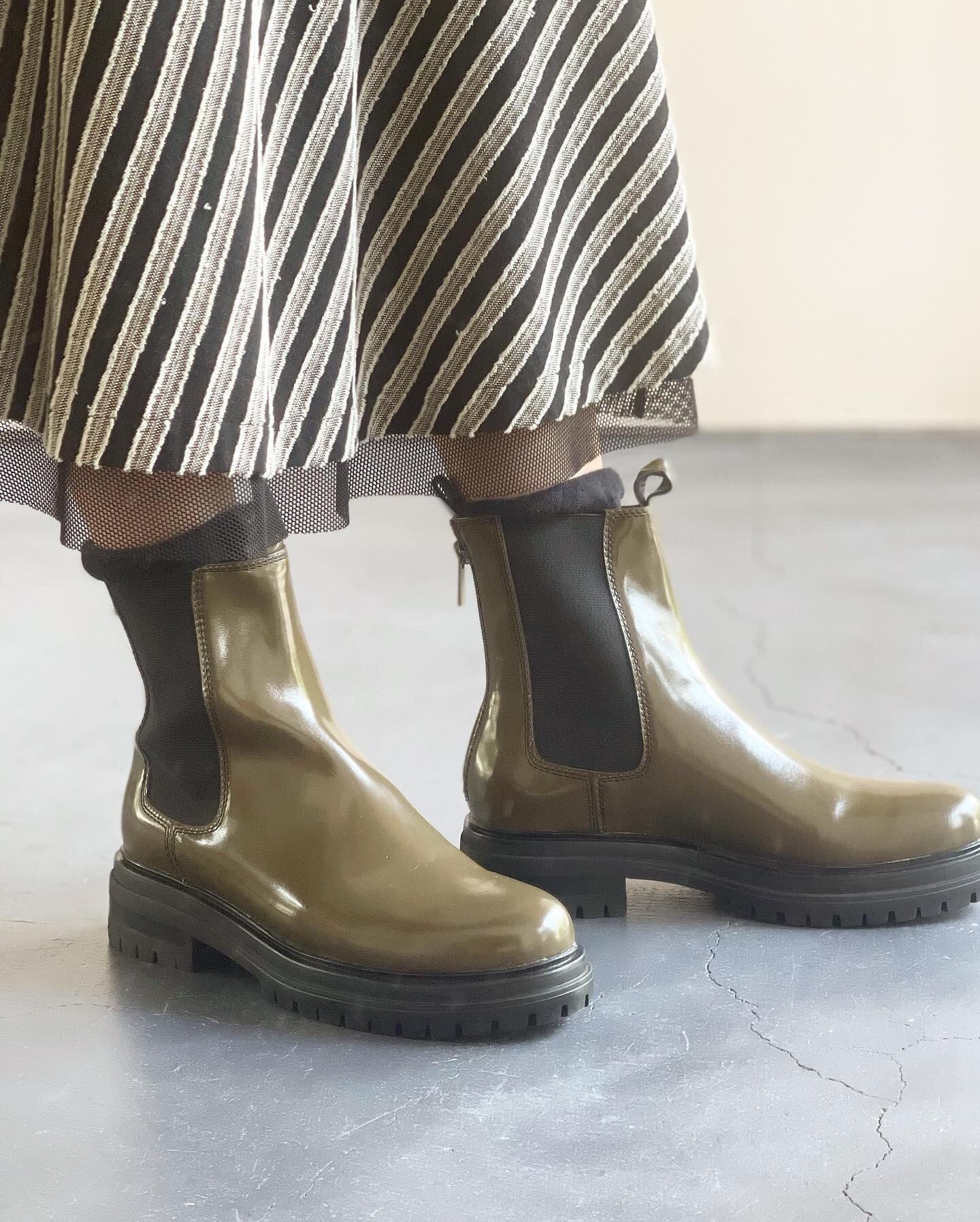 アッパーにはエナメルレザーを使用し、光沢感がある質感です。