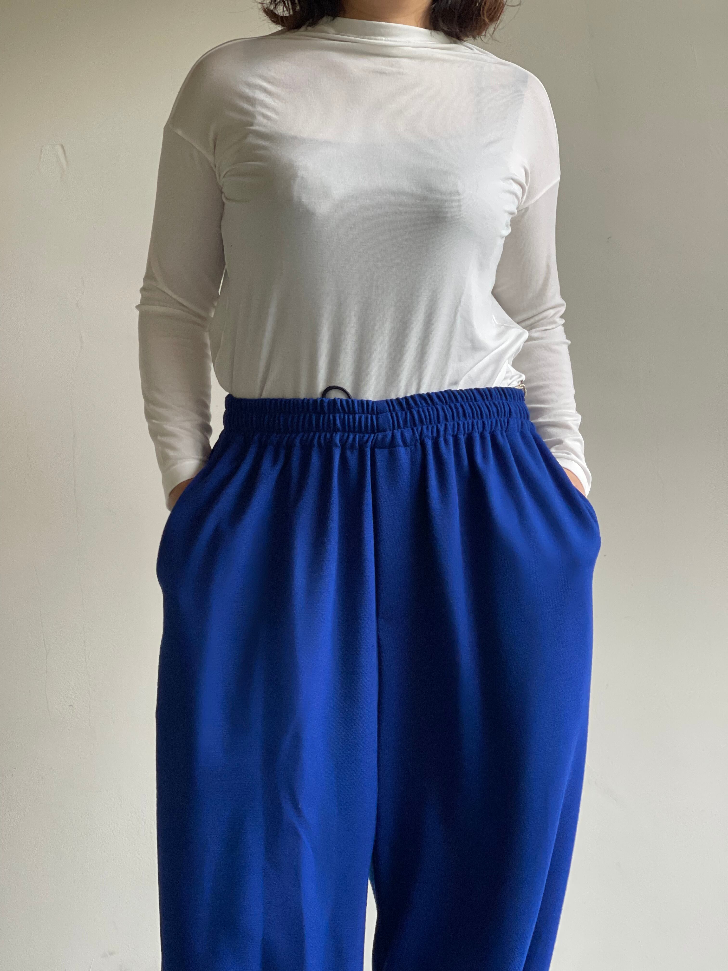 繊維径が非常に細い上質なSuper 120’s ウールにポリエステル糸を組み合わせ、ウール本来のソフトで暖かいタッチとイージーケア性を同時に発揮する高密度ジャージー素材を使用した、パンツ。