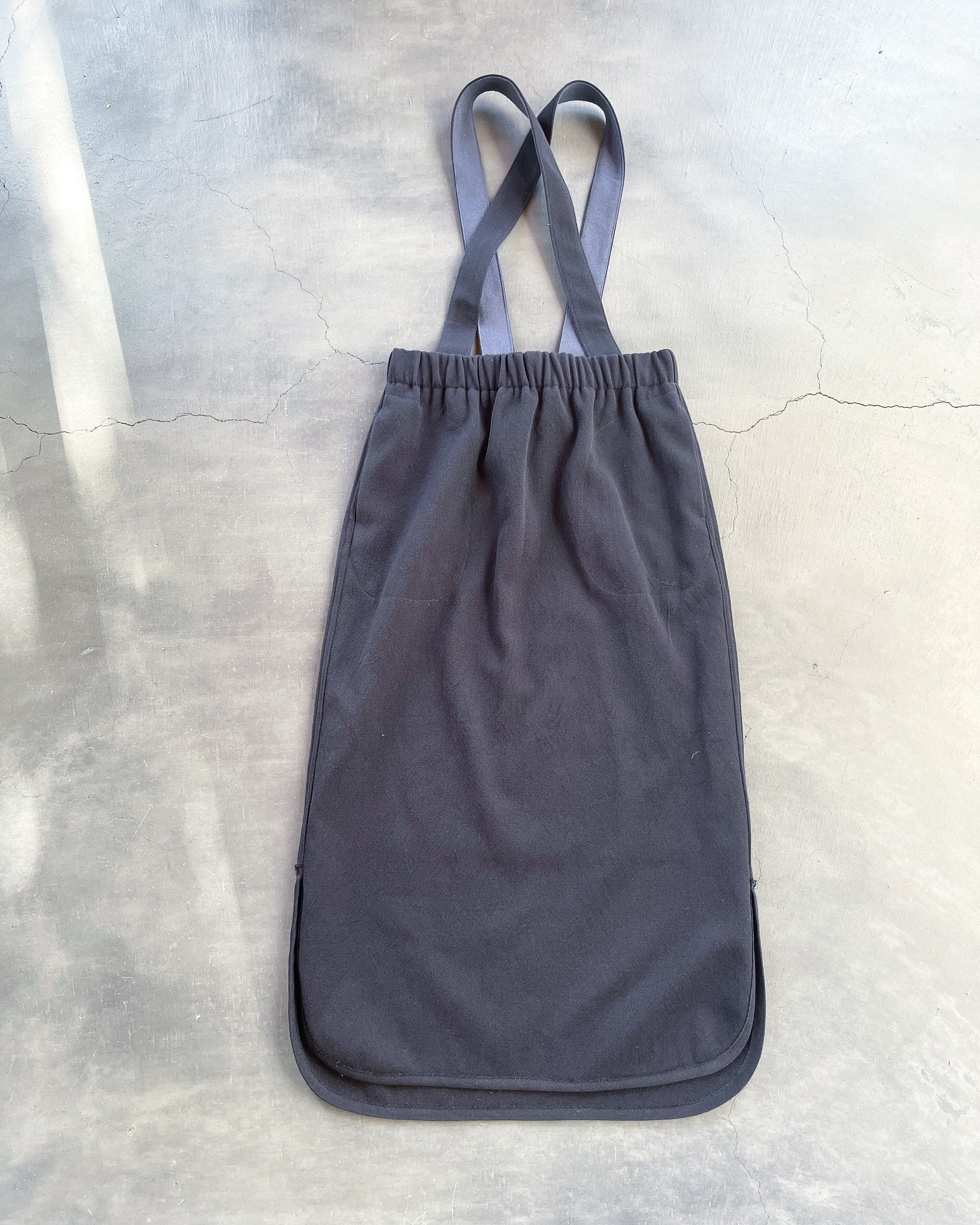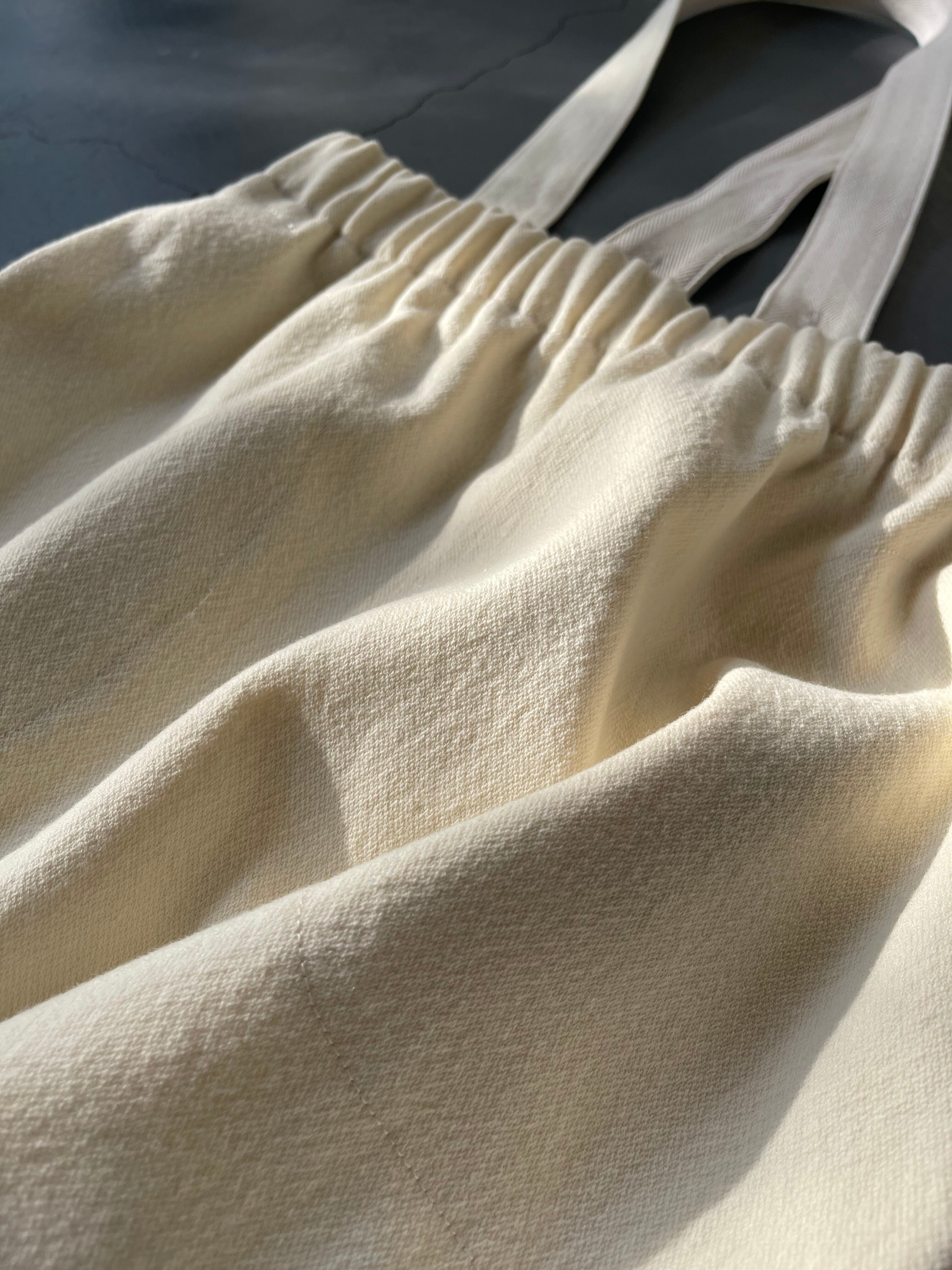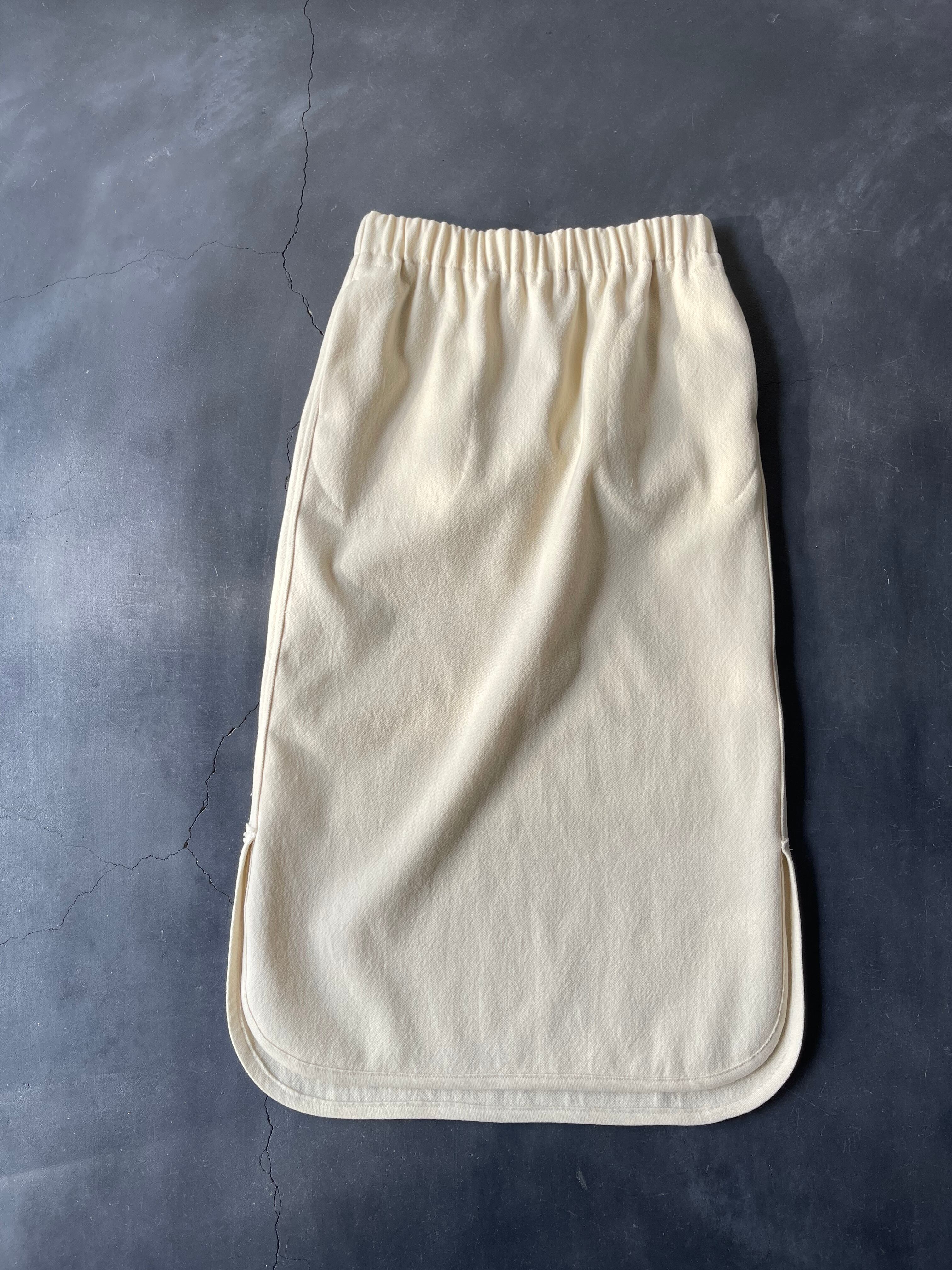共地の取り外し可能な吊ベルトが付いたスカートです。ウエストはゴムで履きやすく、ストンとしたIラインが女性らしいスカートです。