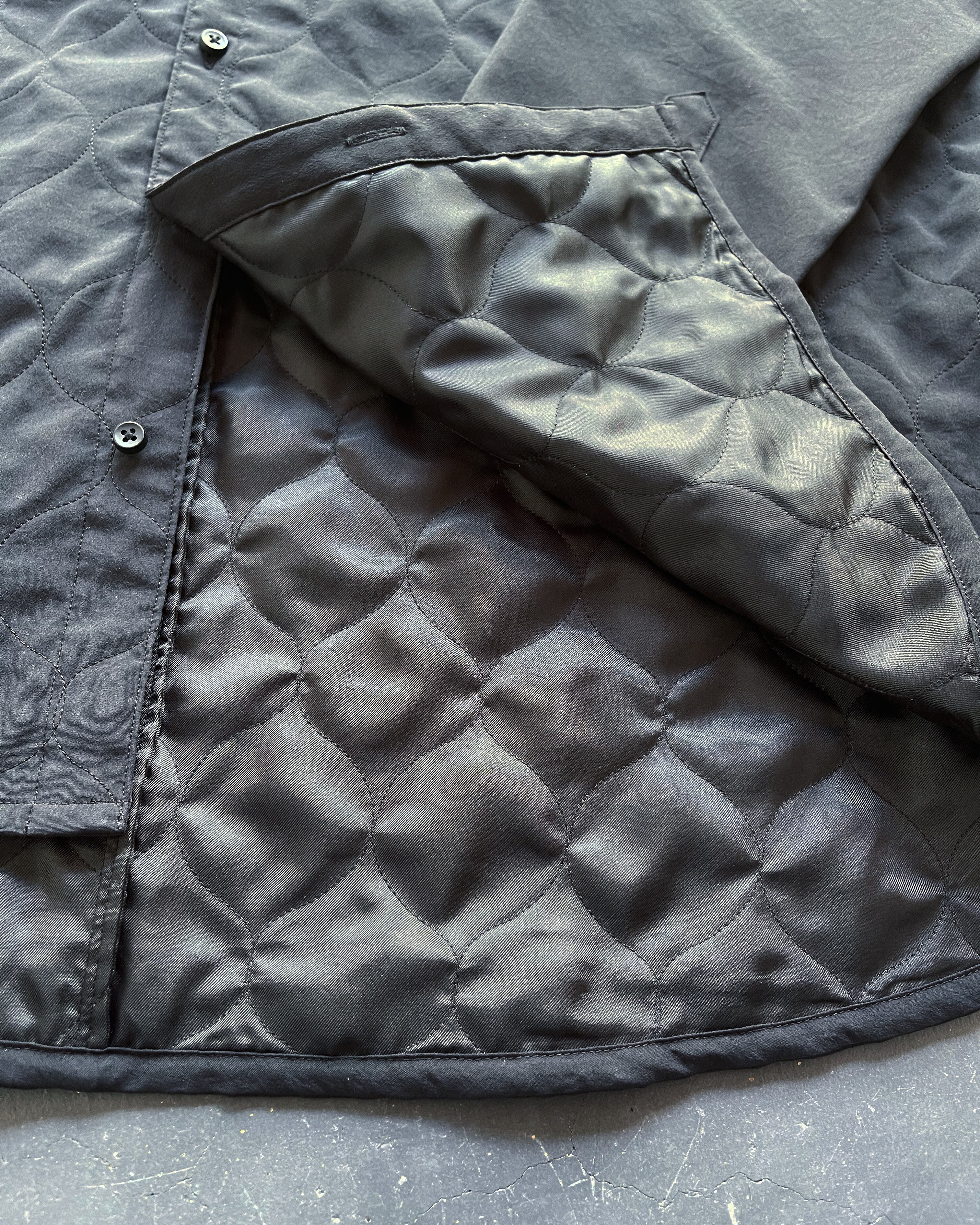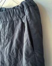 表地に光沢のないポリエステルのタスラン加工糸を使用した平織高密タイプライター生地、中に高機能中生地コマサーモン、裏地にポリエステル裏地を張り合わせて細かいステッチでキルティングした生地です。