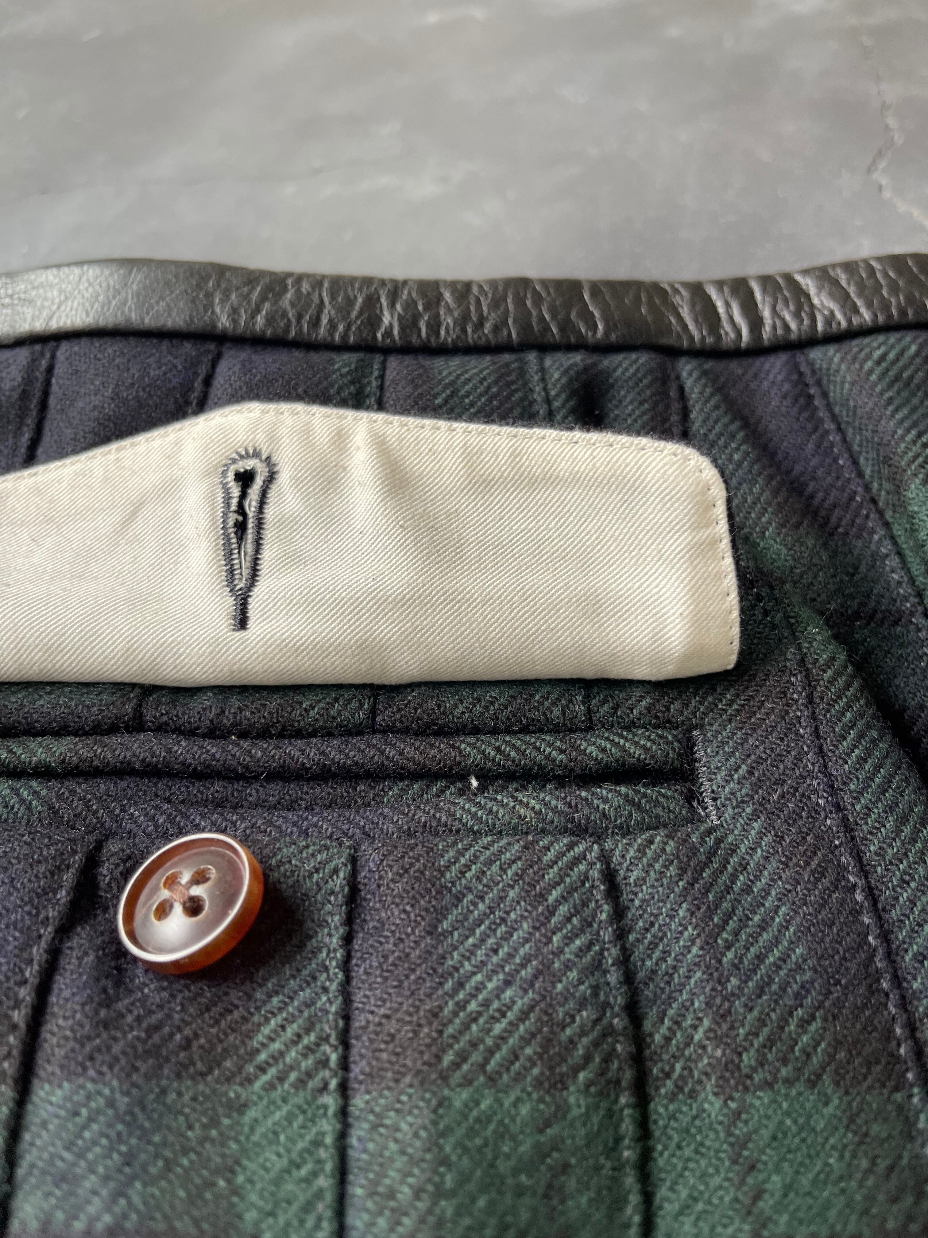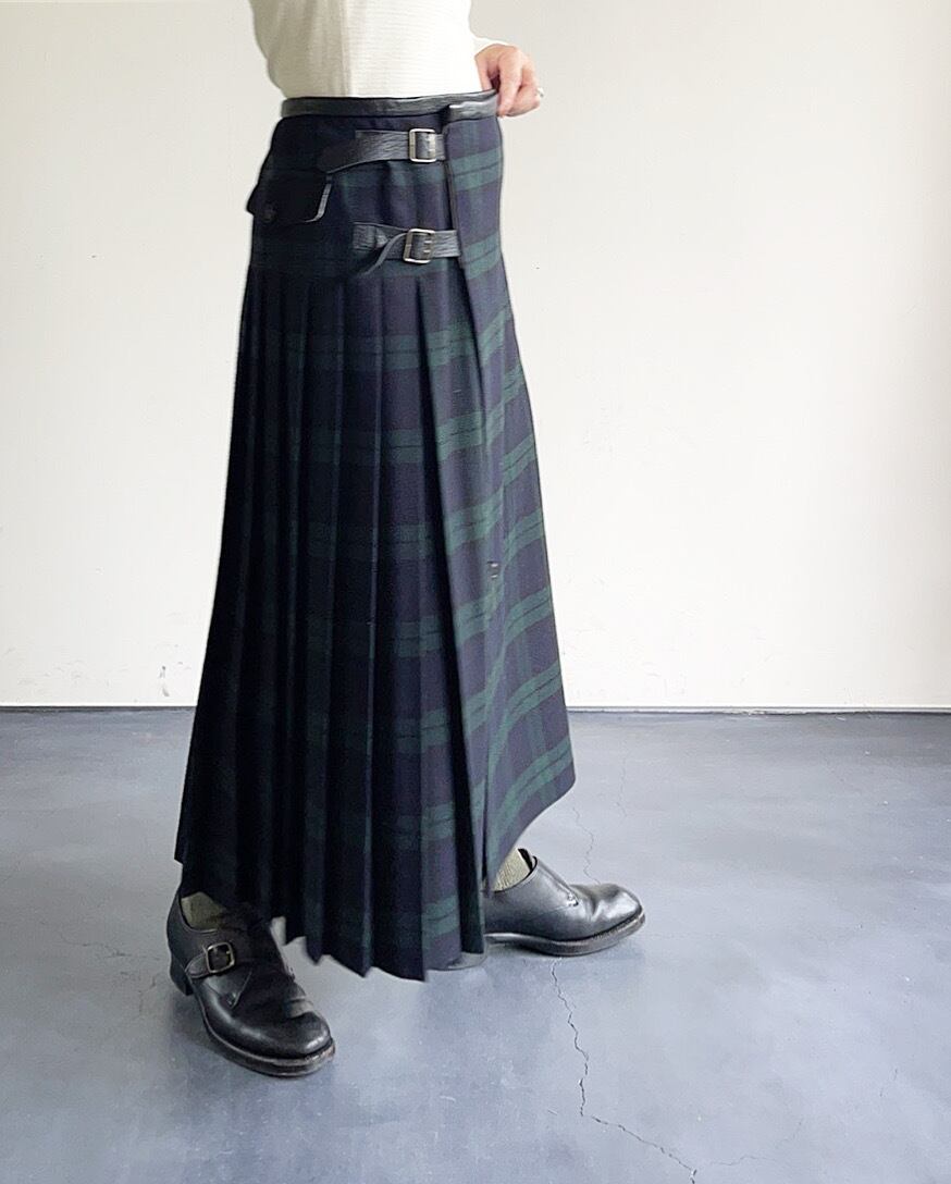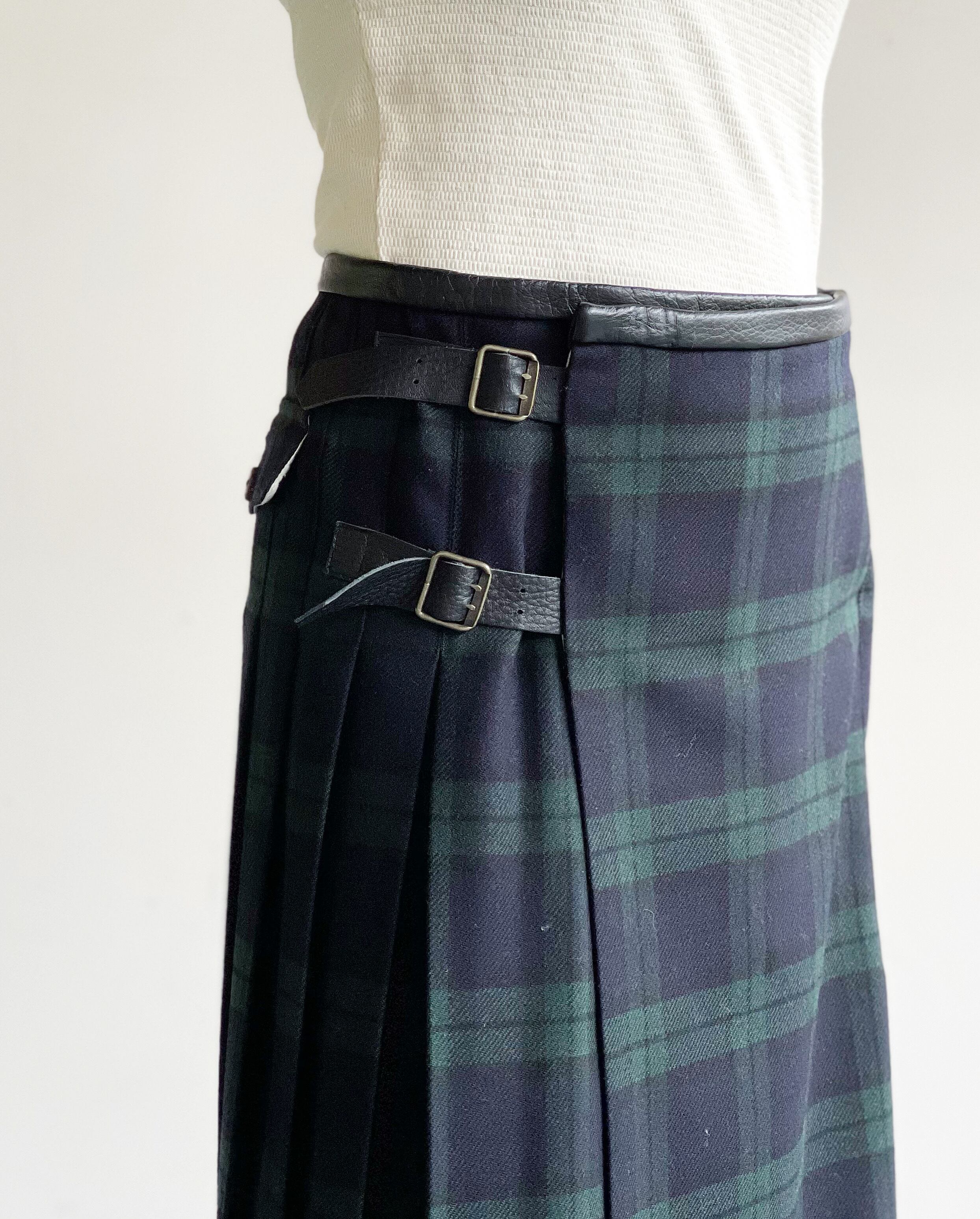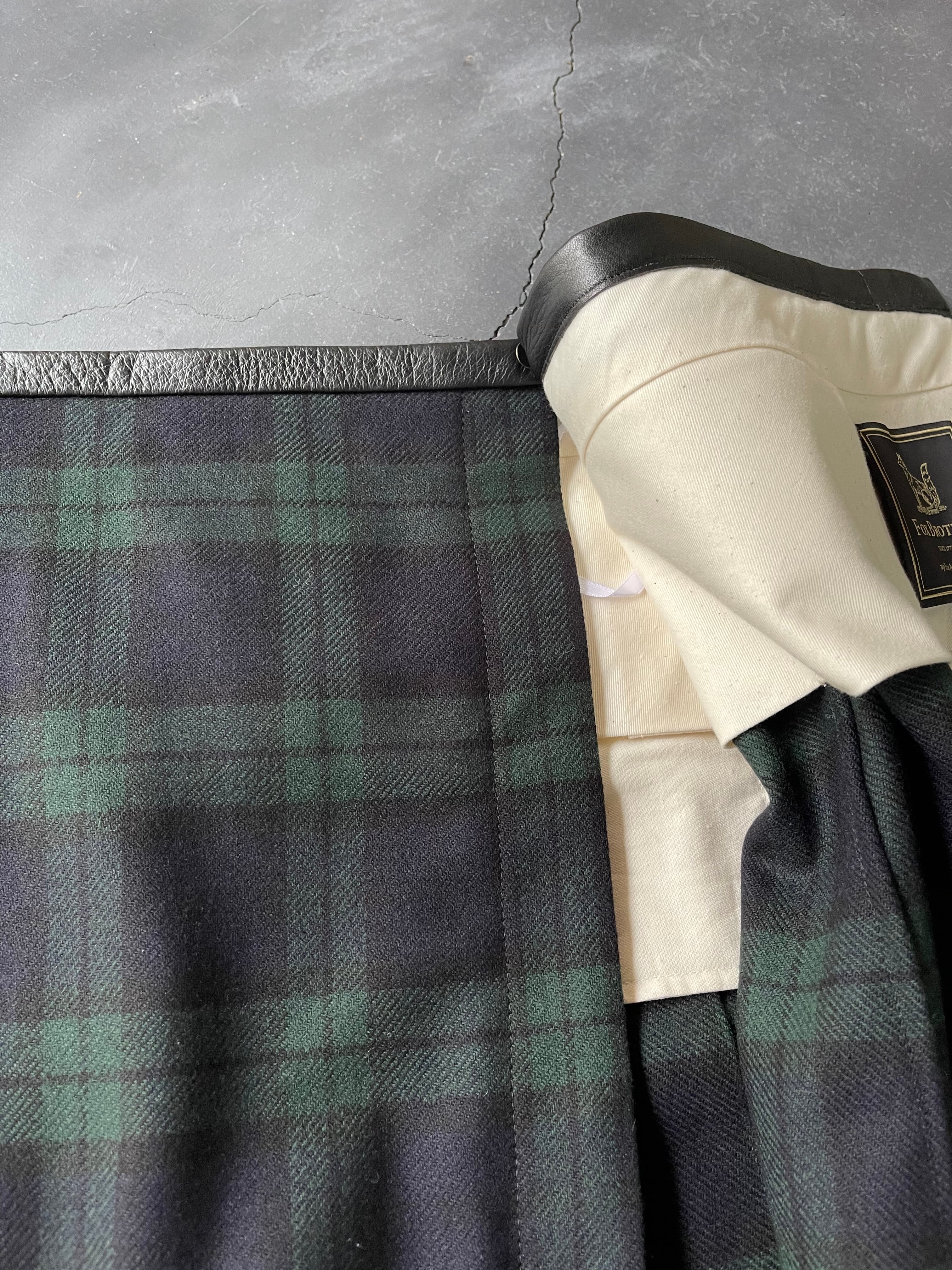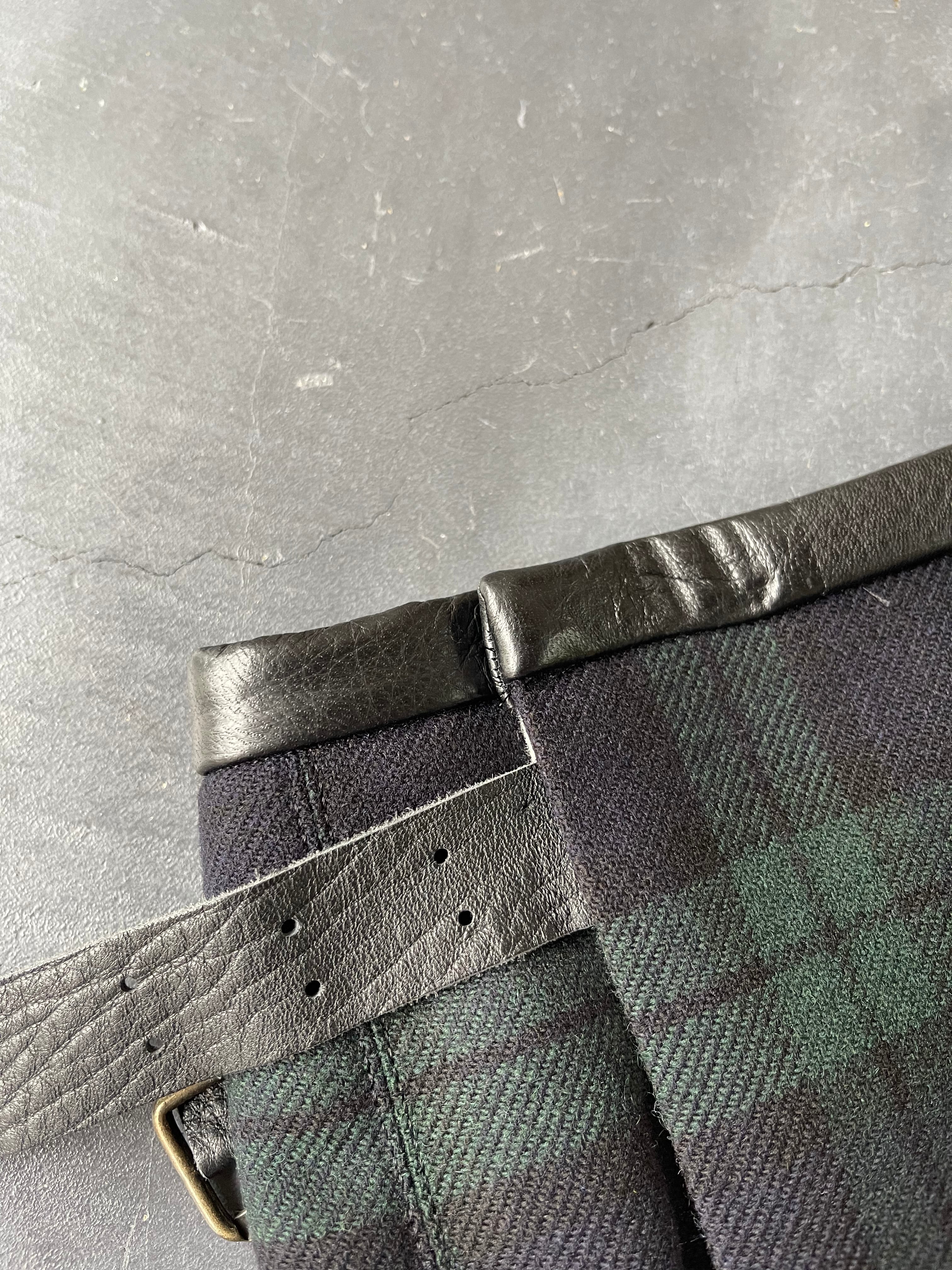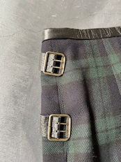この当時のキルトスカートとブランド定番のキルトスカートをMIXさせた新しいキルトは、ウエストとミニベルトに蝦夷鹿のレザーを使用し、前端にキルトピンを取り付けました。