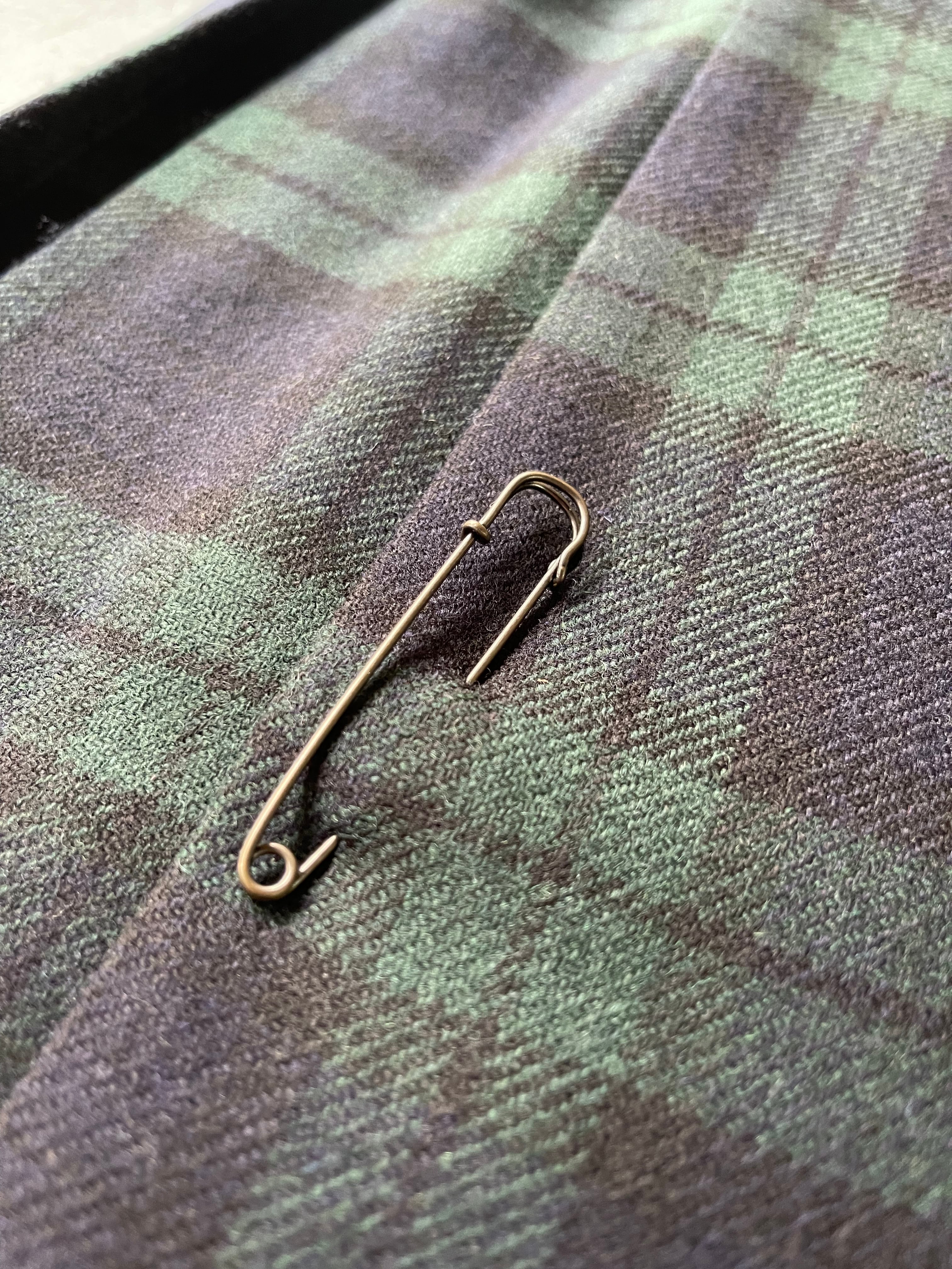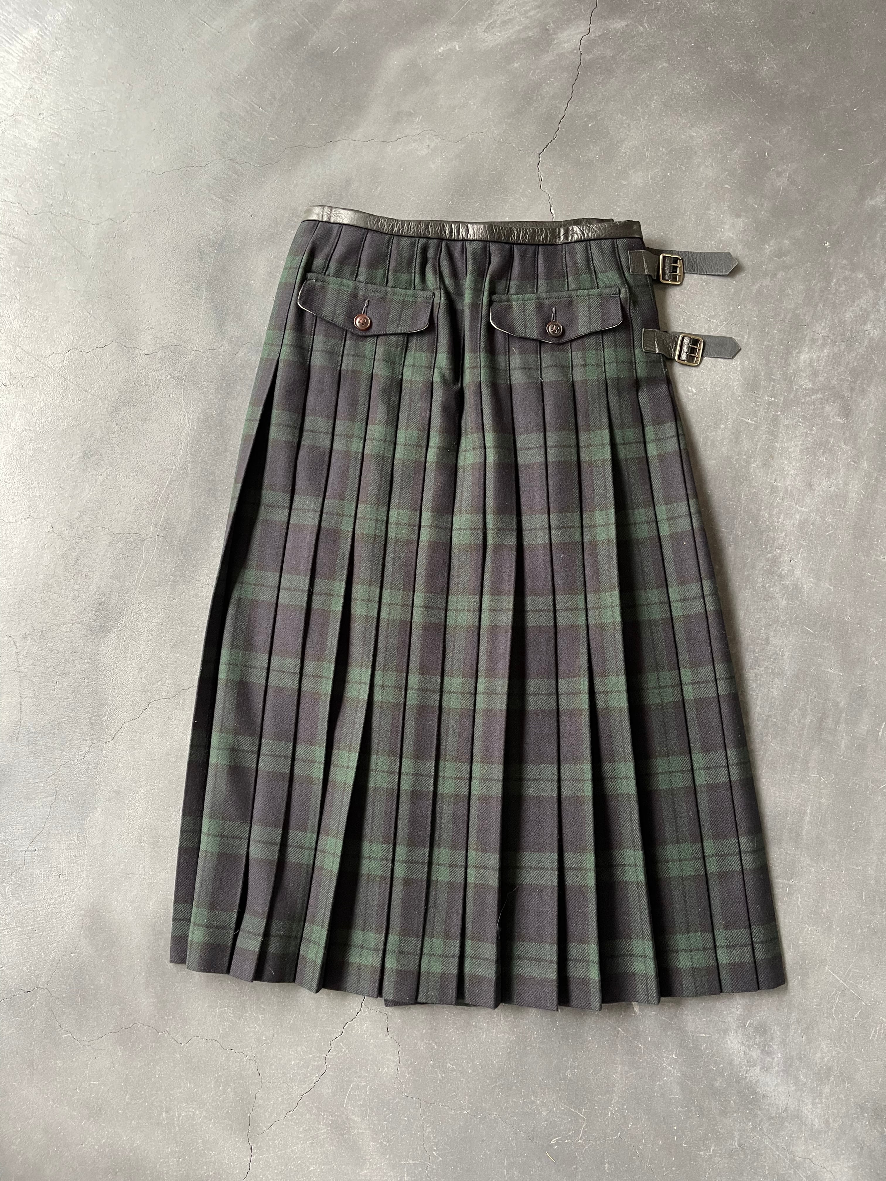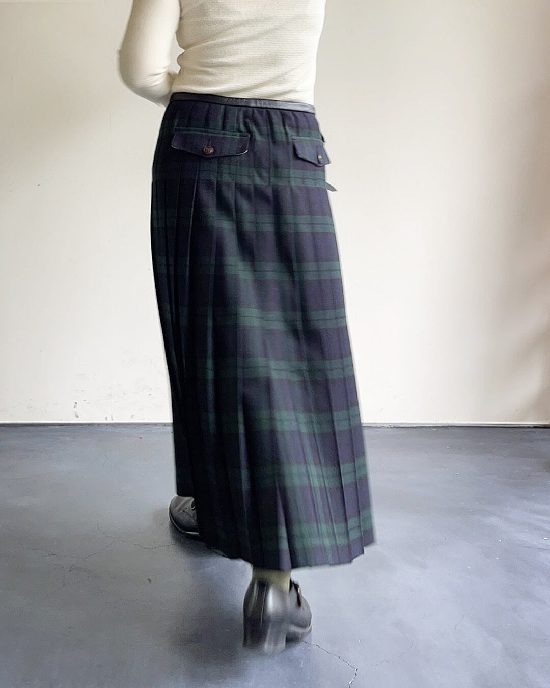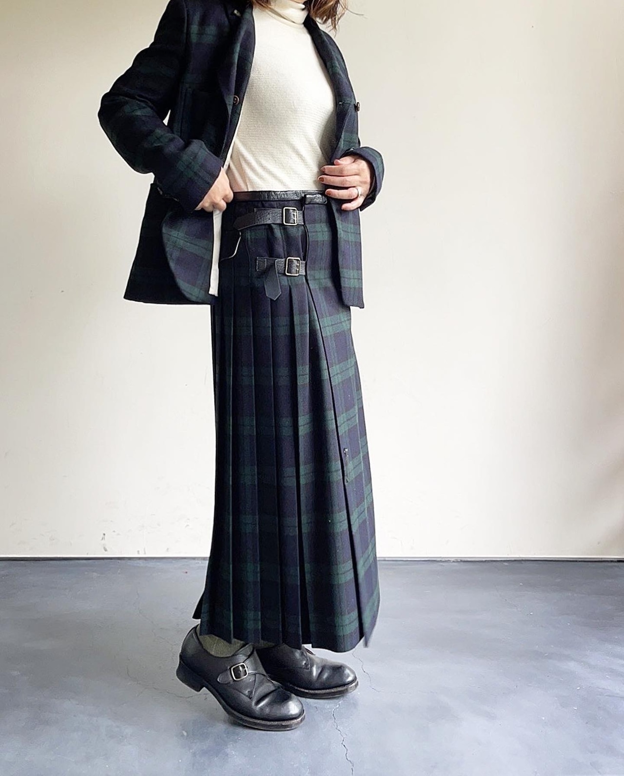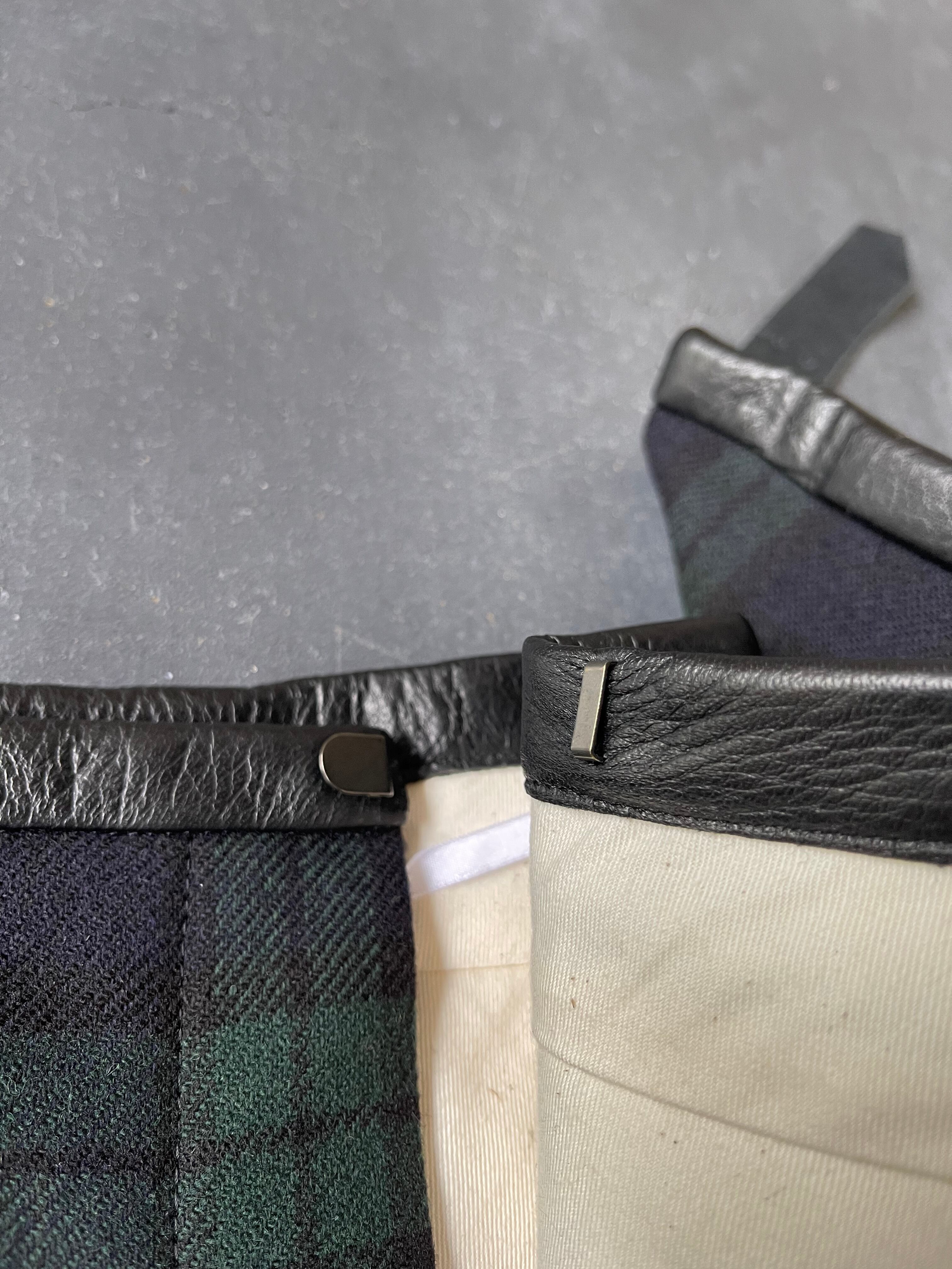 この当時のキルトスカートとブランド定番のキルトスカートをMIXさせた新しいキルトは、ウエストとミニベルトに蝦夷鹿のレザーを使用し、前端にキルトピンを取り付けました。