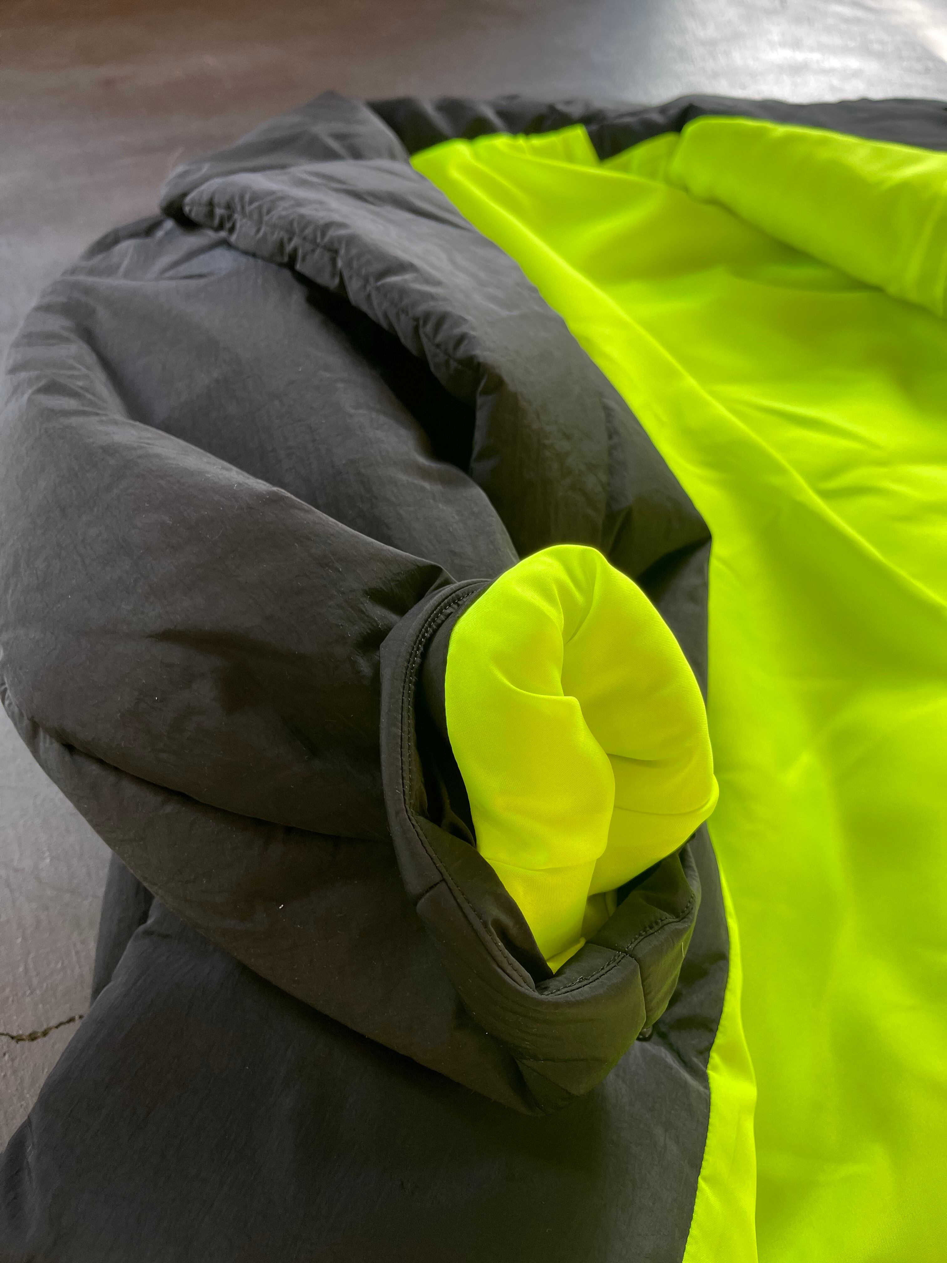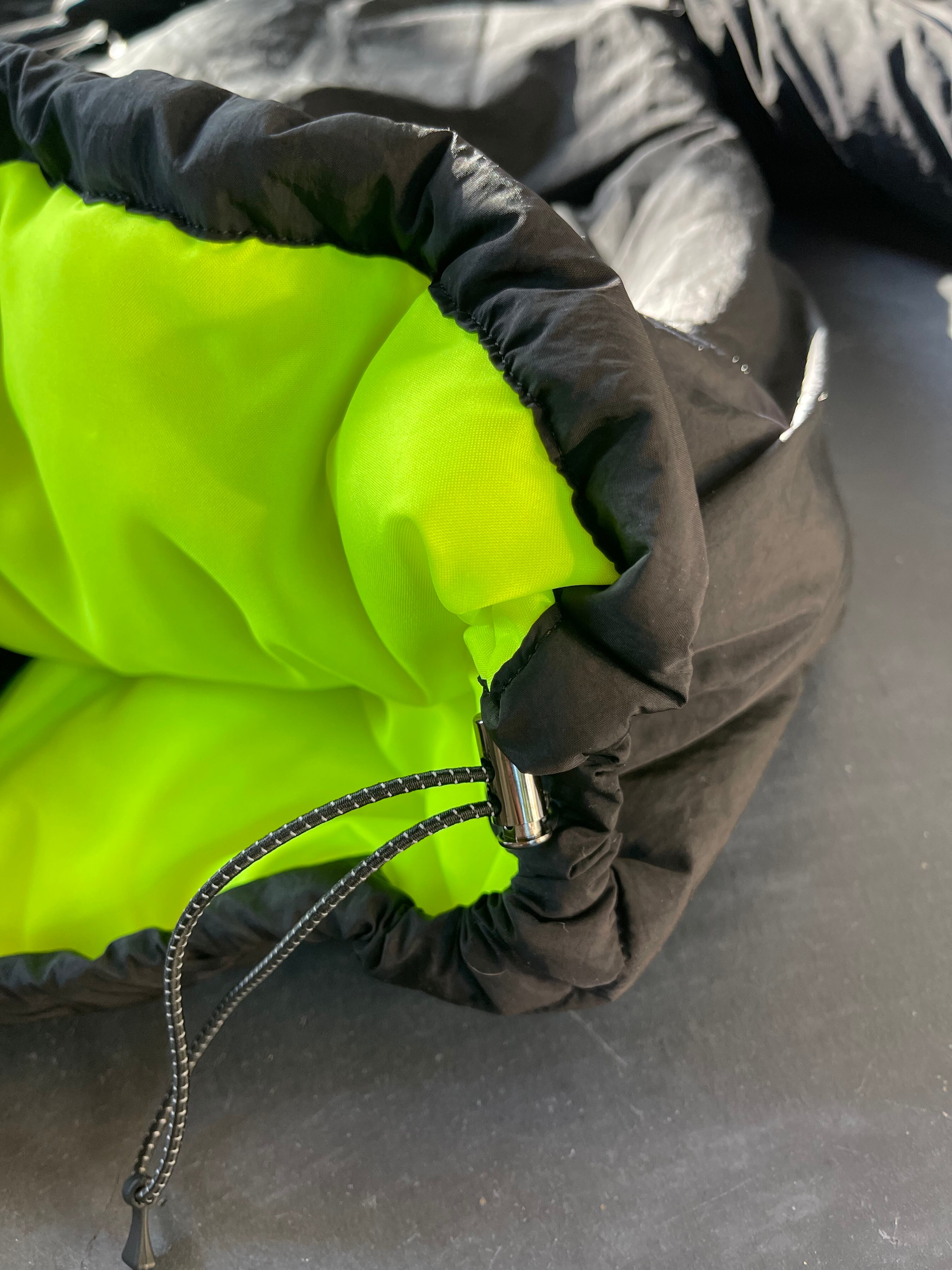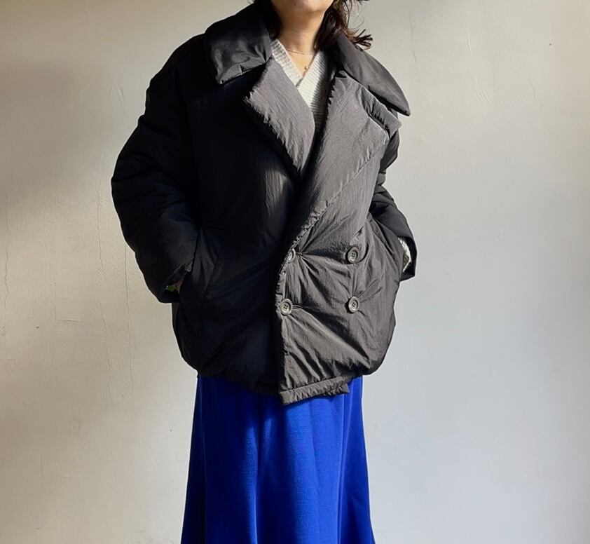 サスティナブルなリサイクルナイロンに、撥水・防風処理とシワ加工を施した超軽量タフタ素材のダウンです。