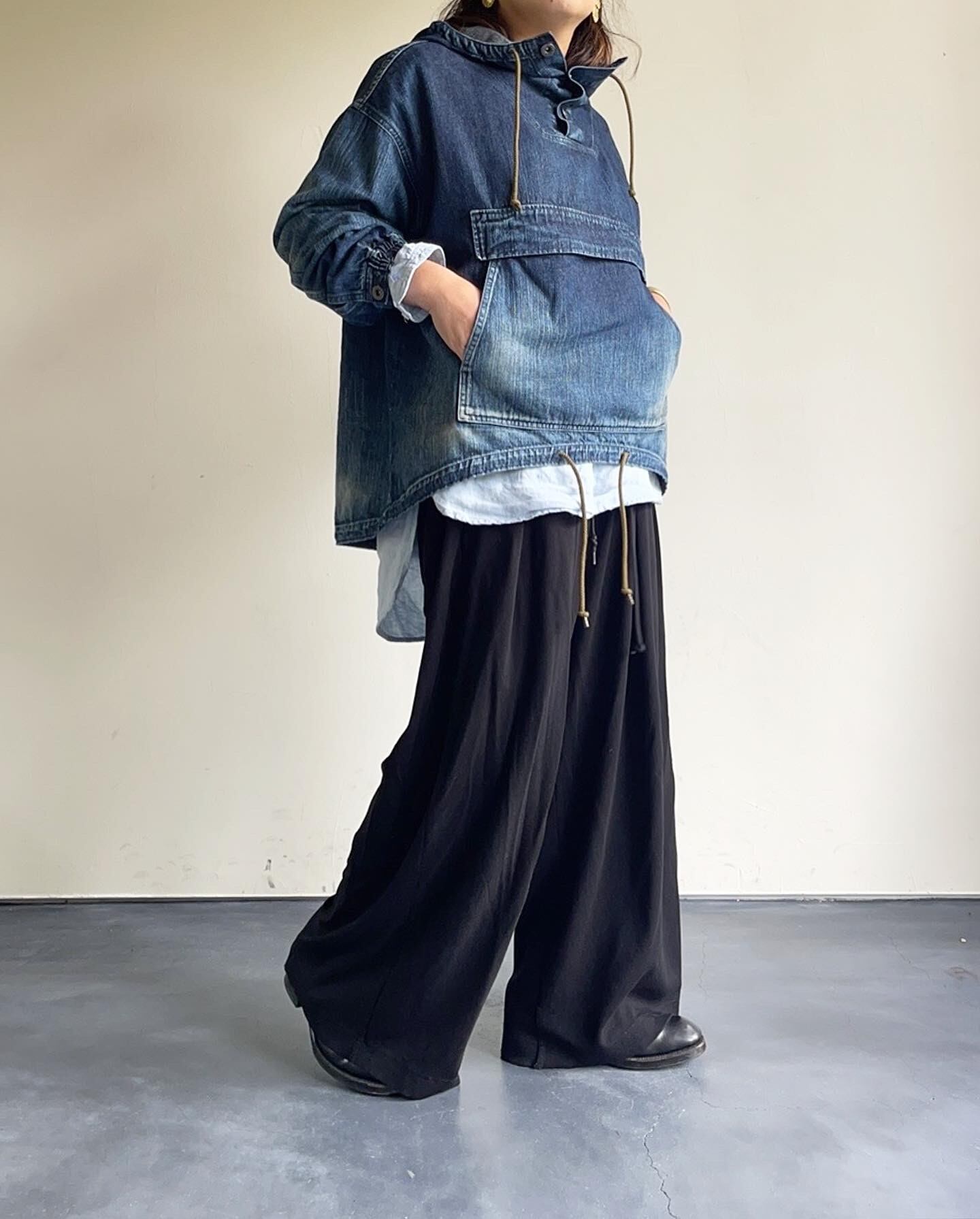 裾のドローコードで丈を調整し、スカートやワイドパンツなどでのコーディネートもオススメです。