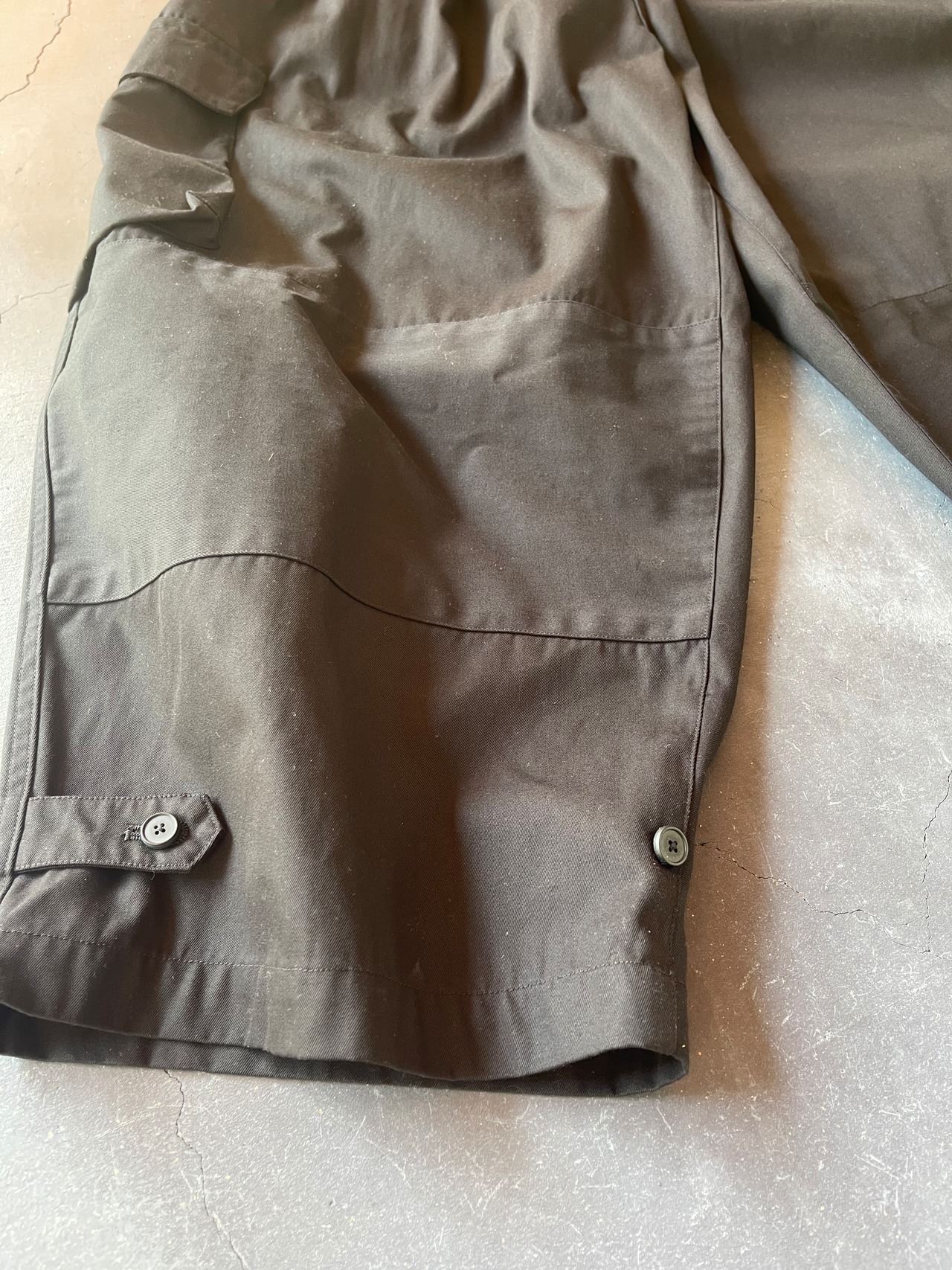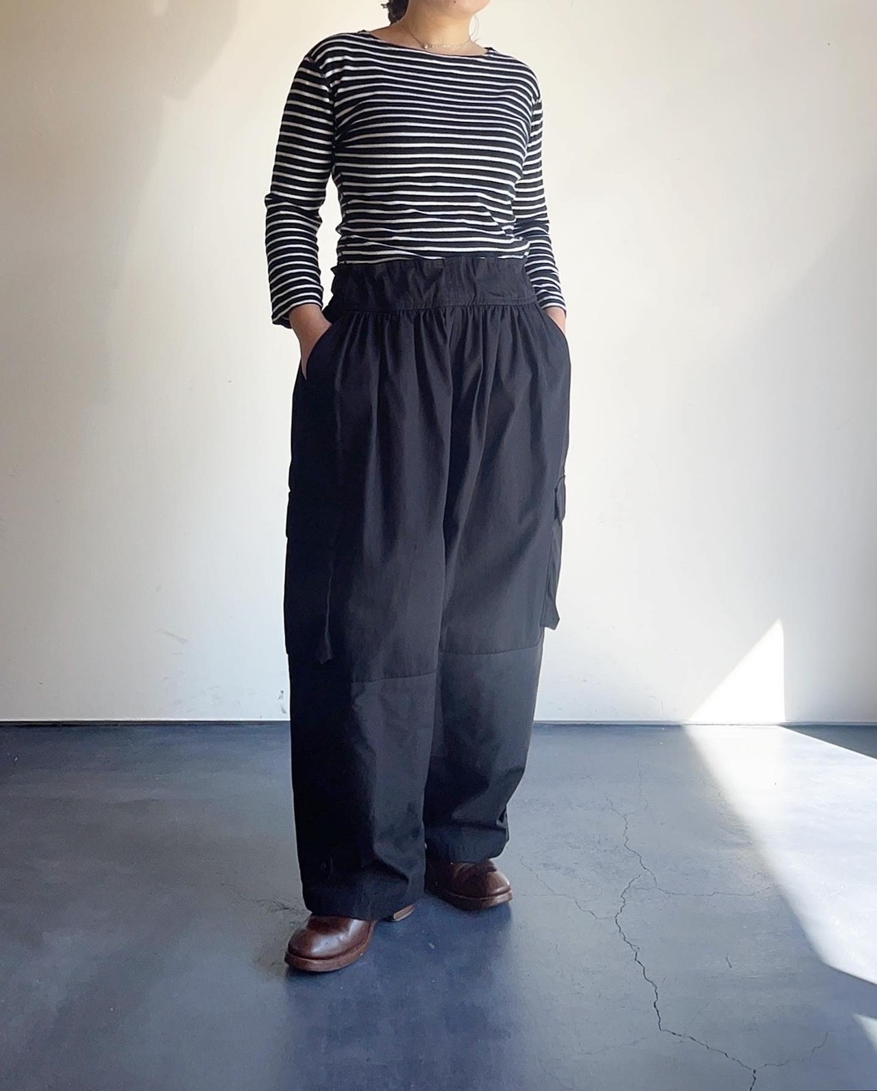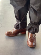 極限まで撚りを強めたコットンポリエステルの糸で織った高密度のギャバです。糸を極端に強撚することで皺になりにくくなり、速乾性や落ち感が加わって、地味な生地ではありますが綿のギャバとしては理想的な生地であると思います。TCですので頑丈で長く着用できる素材です。