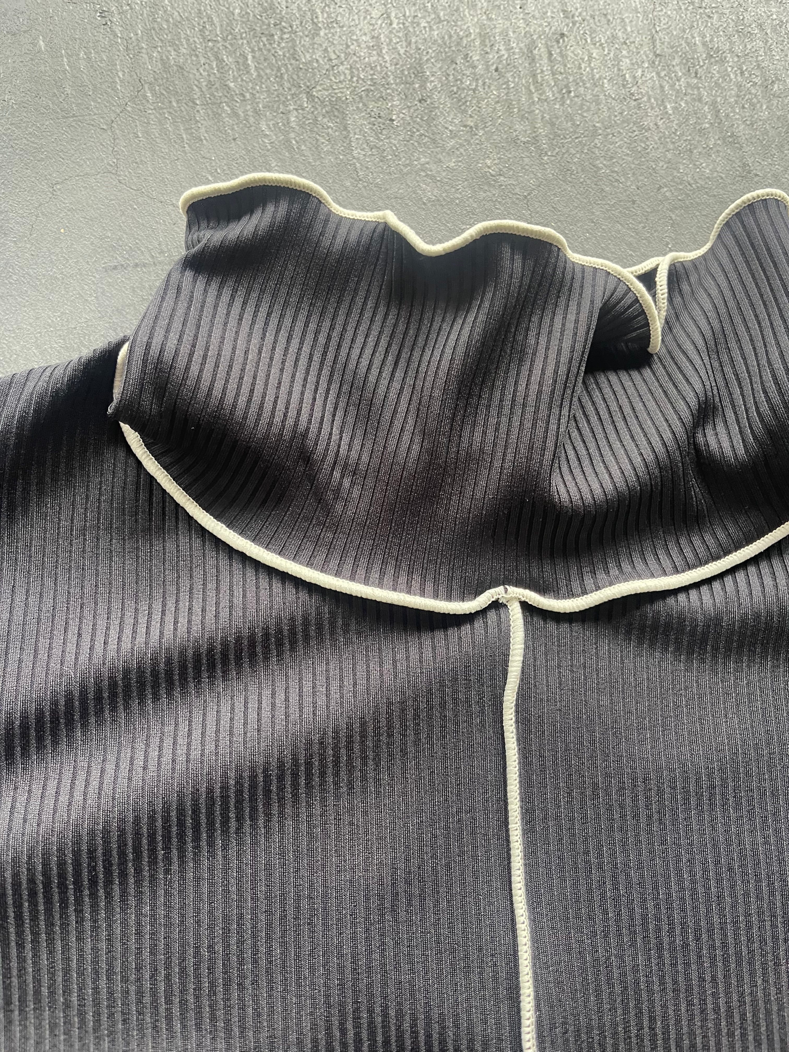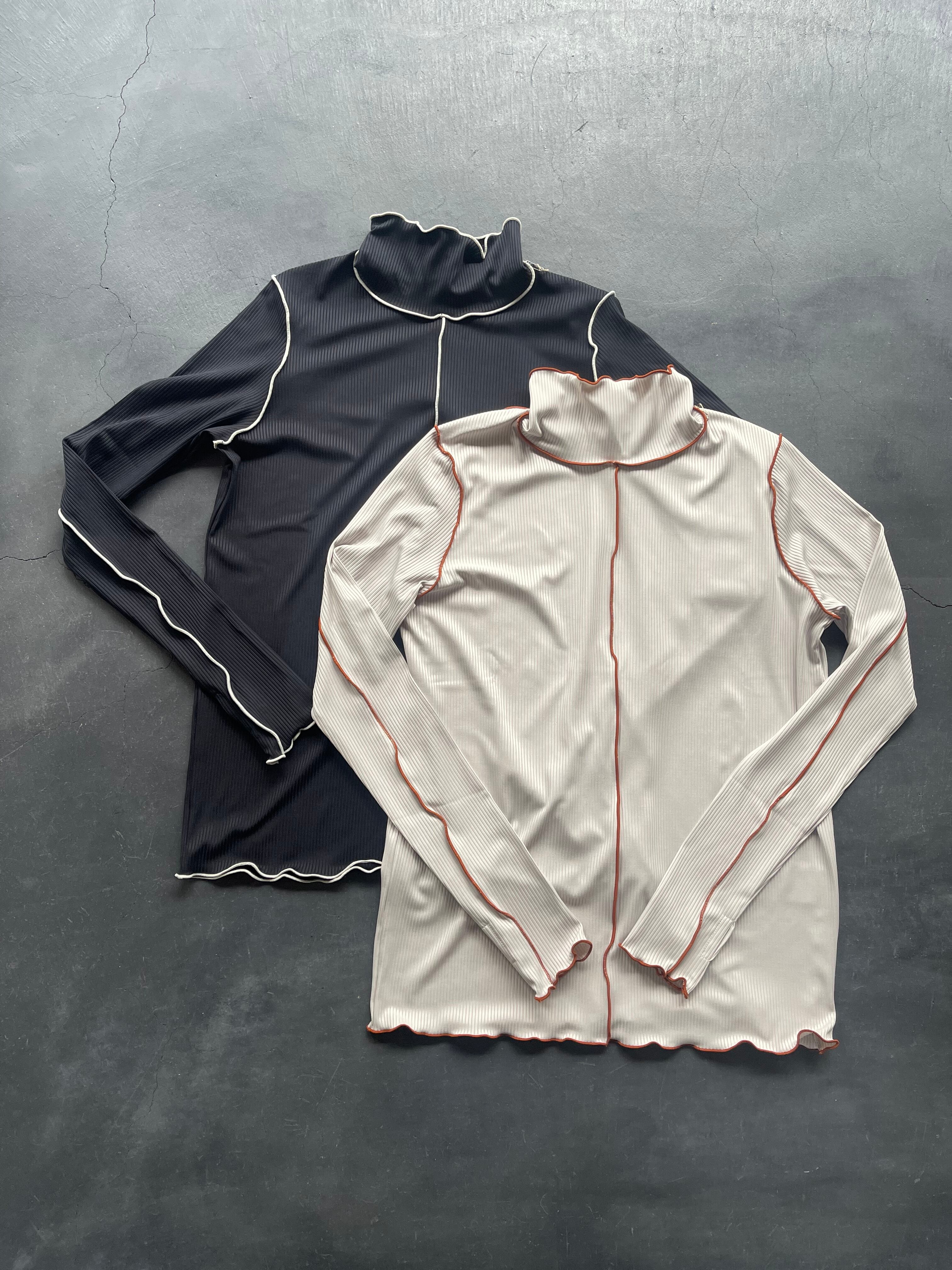 適度で上品な光沢を持つはっきりした凹凸のリブニットは、4wayストレッチでしなやかに身体に沿ながらも程良い厚みで安心感を与えるうえ、クールタッチ・イージーケアで時代にぴったり寄り添うジャージー素材。