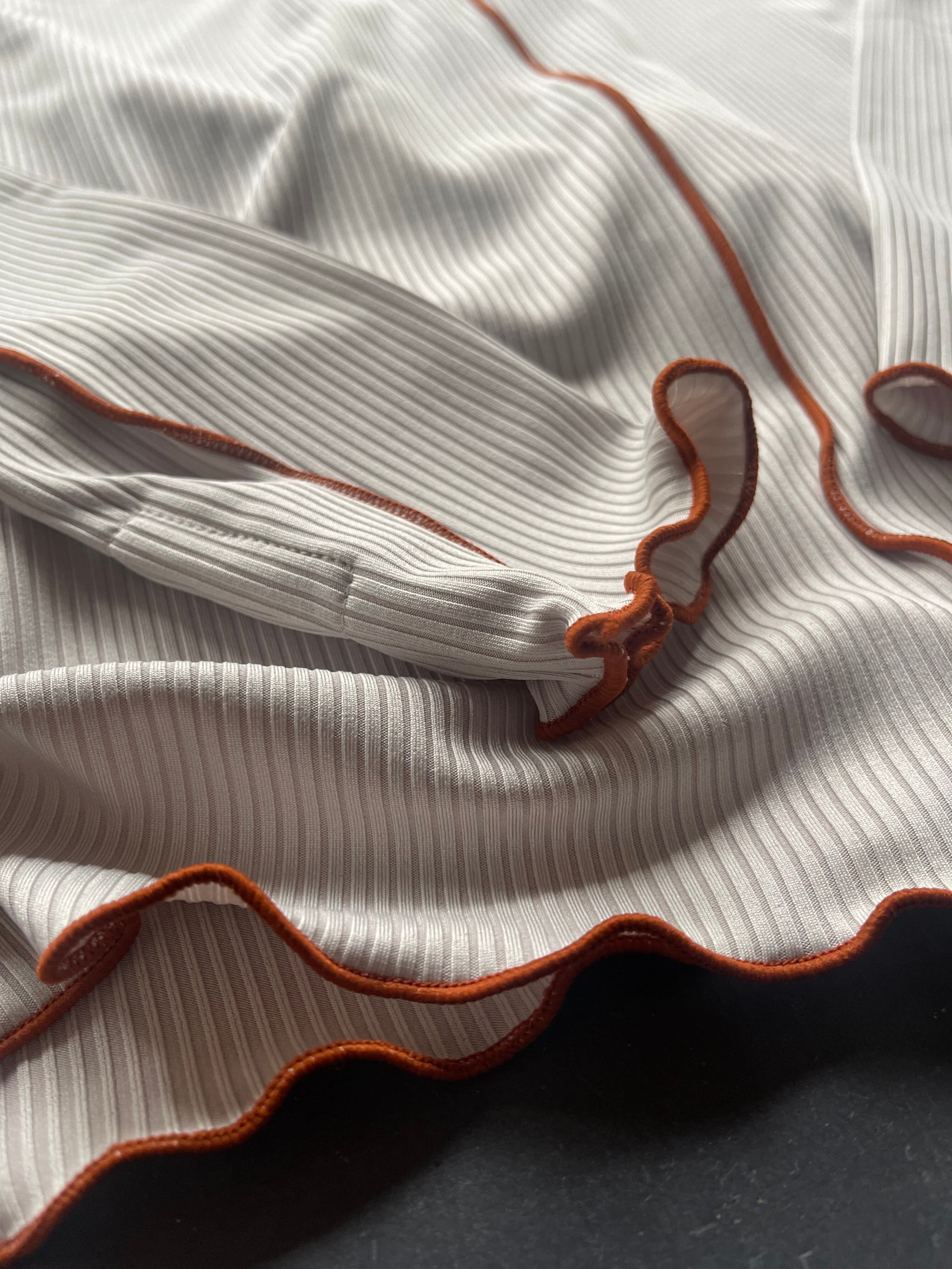 特殊ミシン(メローロックミシン)を使い縫製された配色ステッチがポイントです。