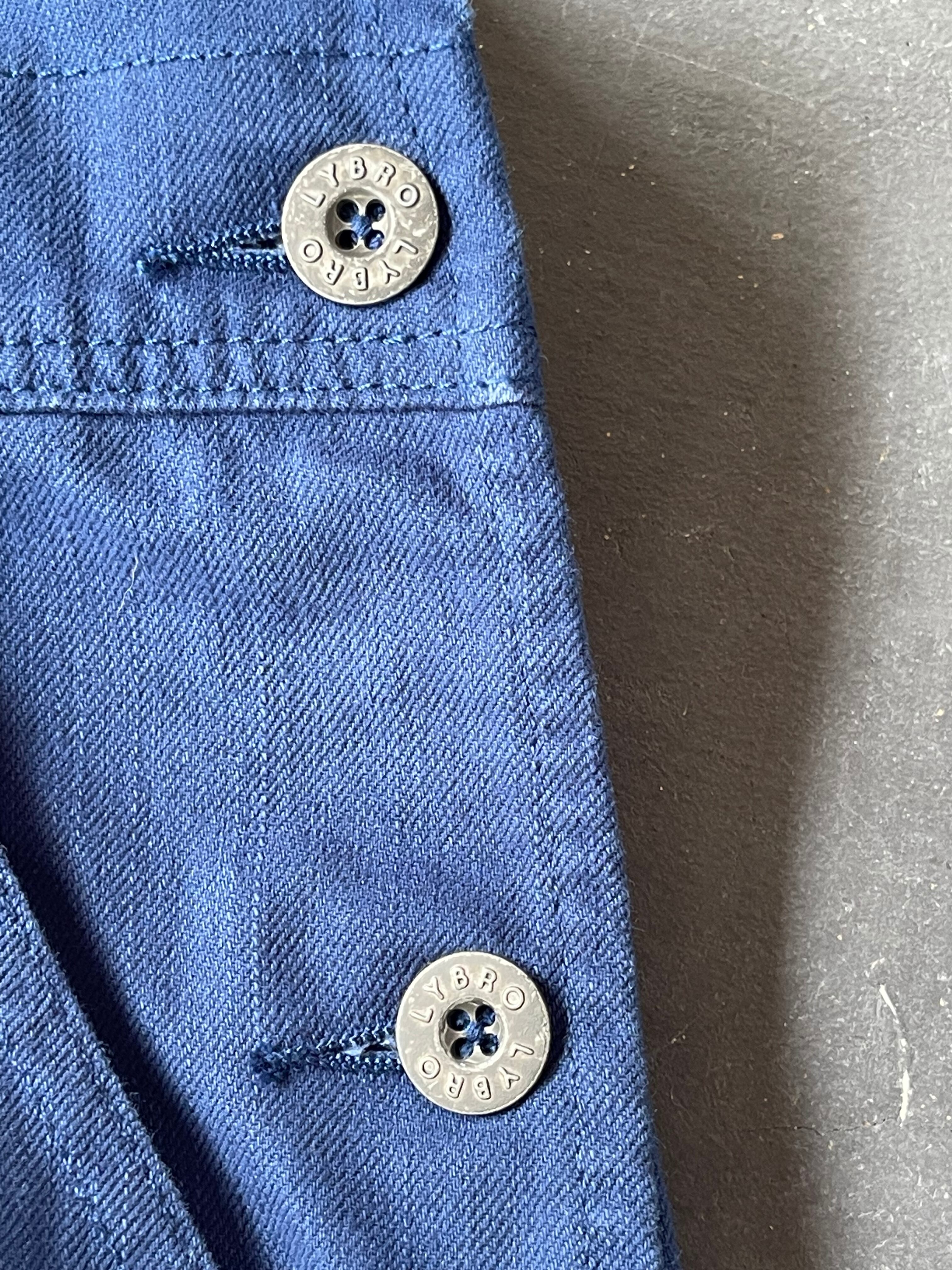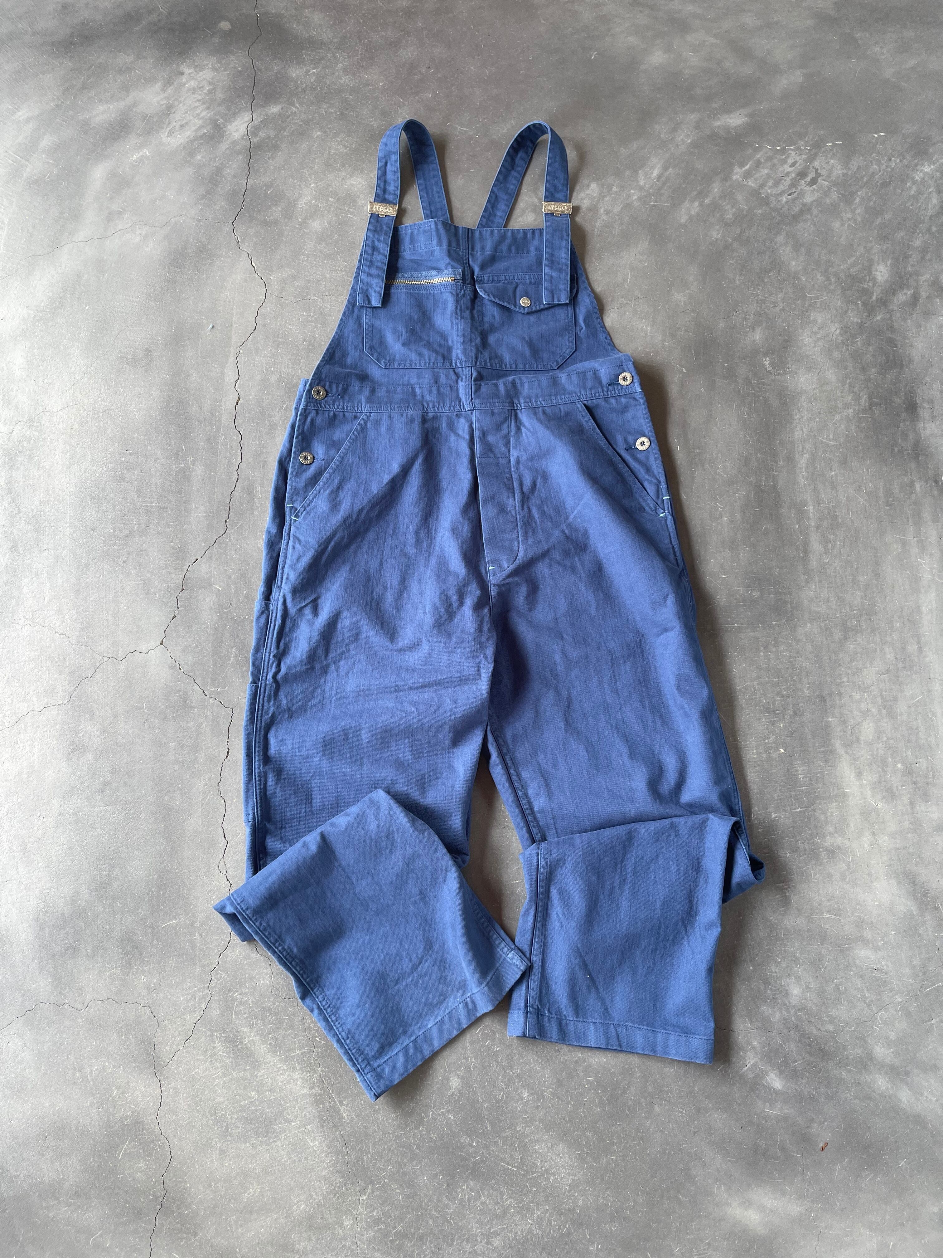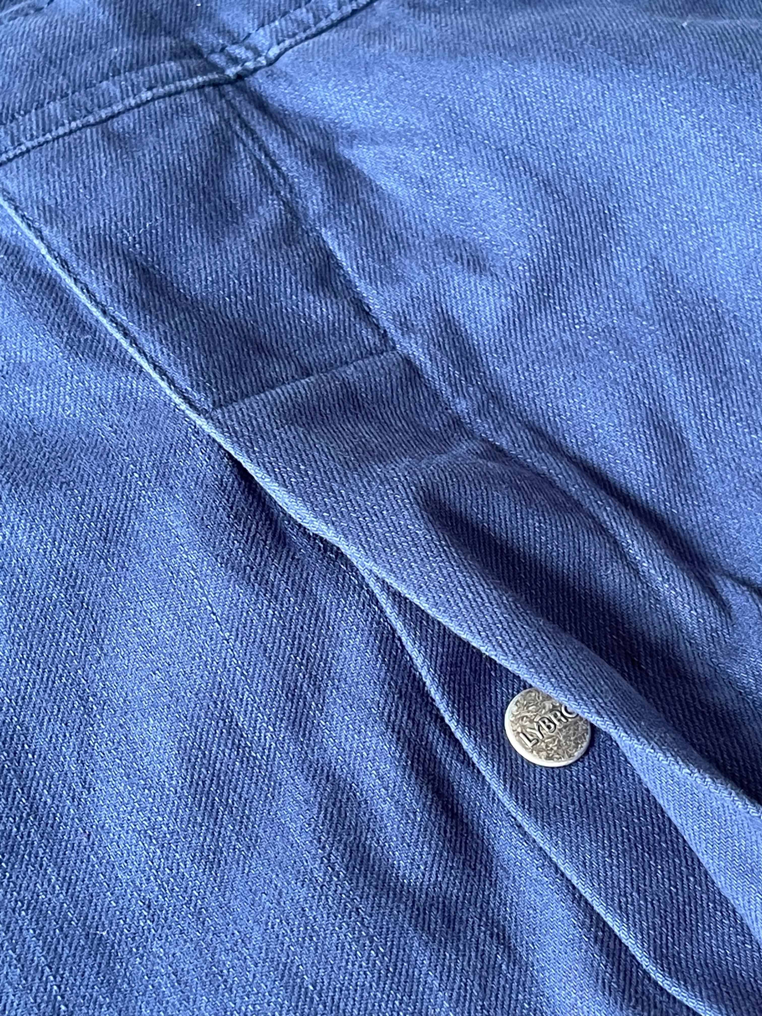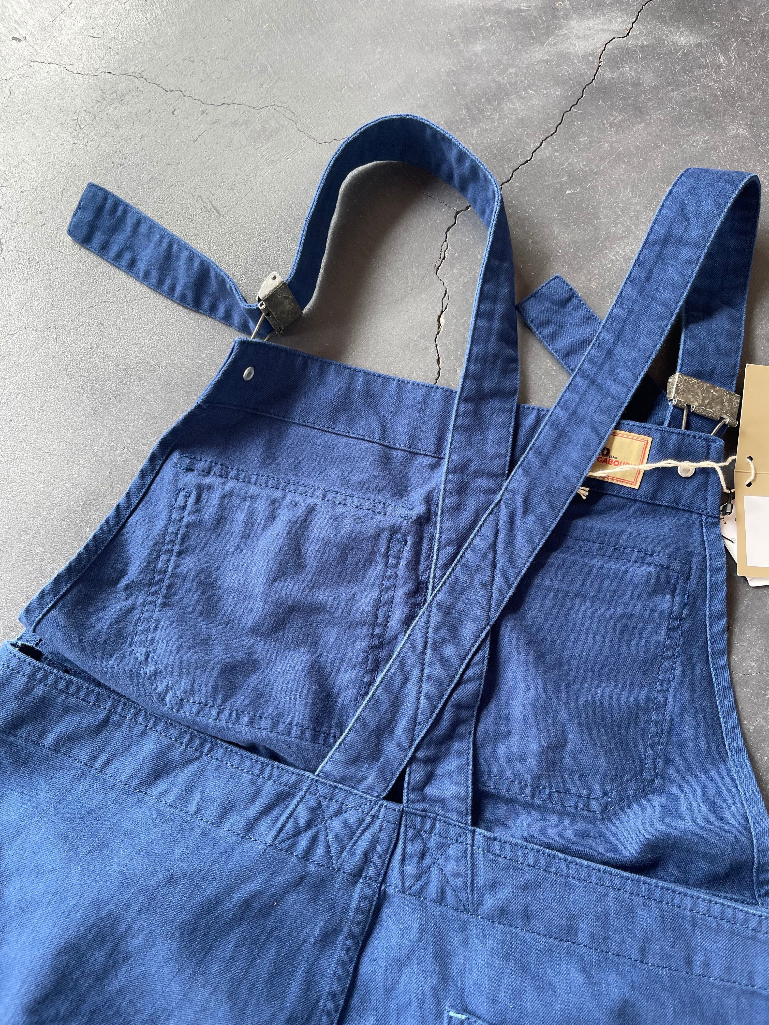 ツイル素材のクラシックなダンガリー。胸元に2つのポケットがあり、1つはジップポケット、もう1つはボタンポケットです。ポケット周りやバータックには補強ステッチを施し、強度を高めています。