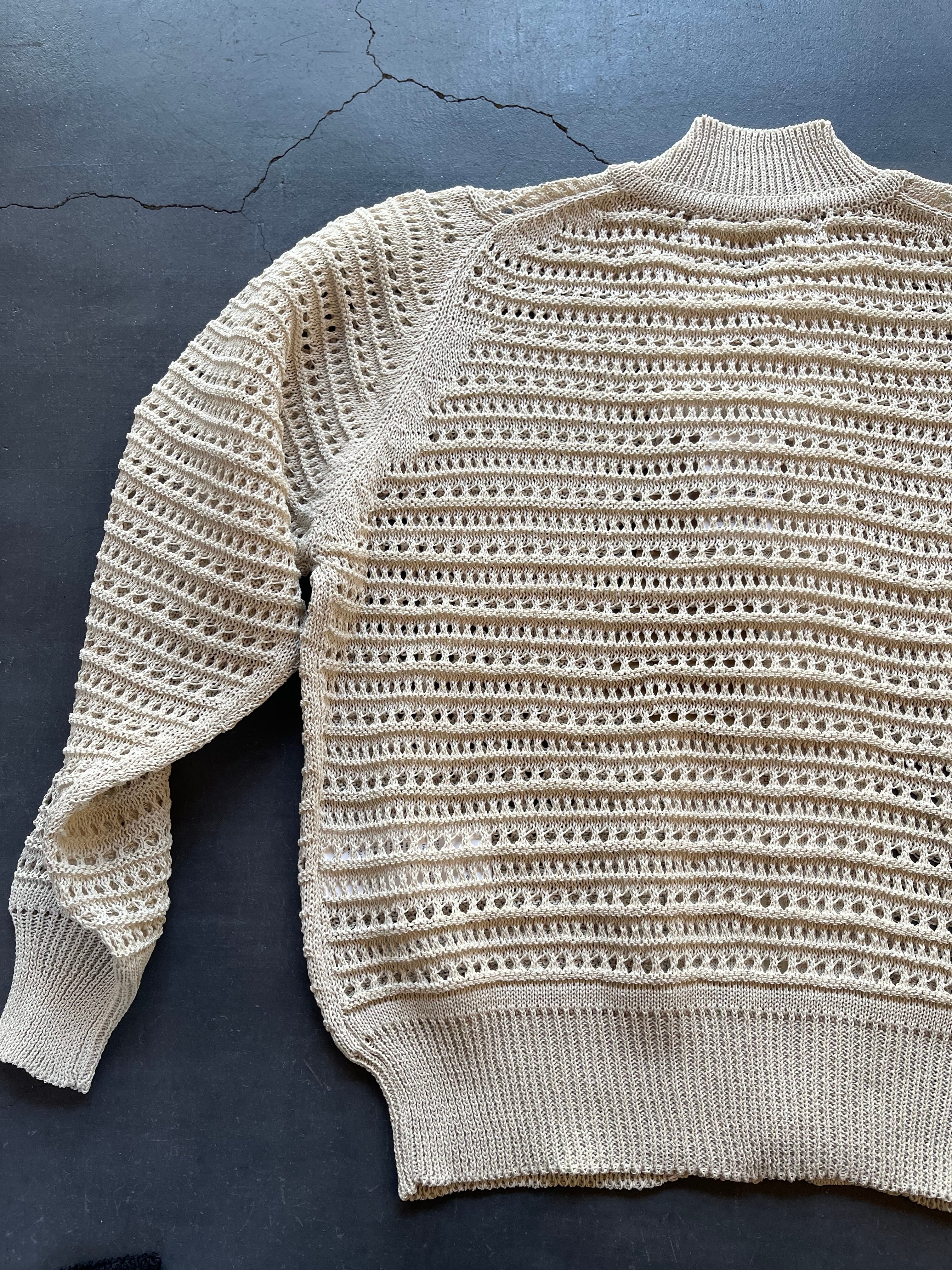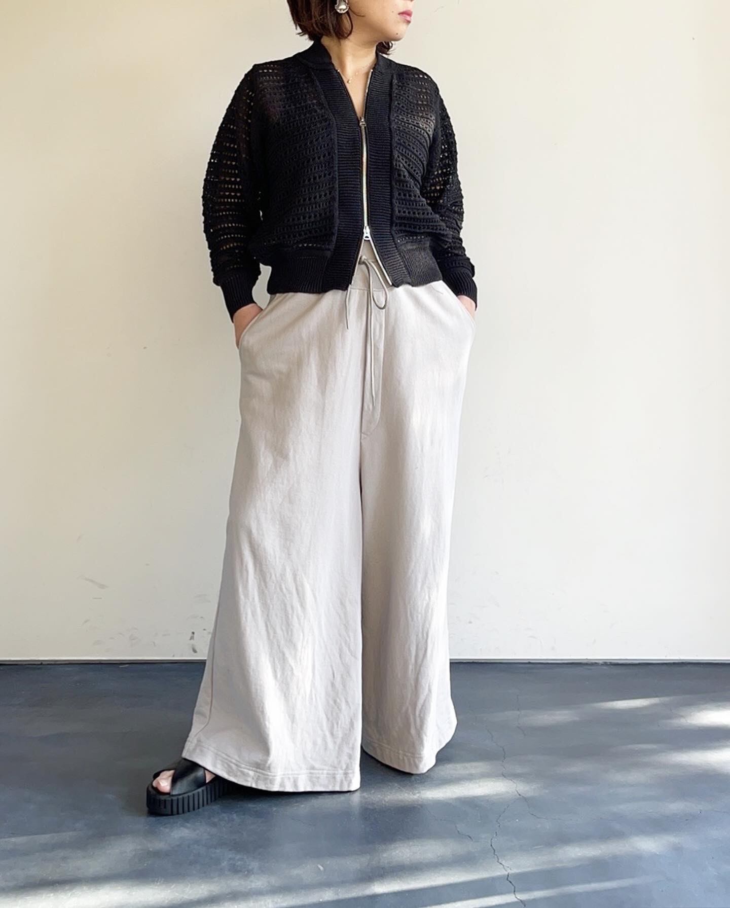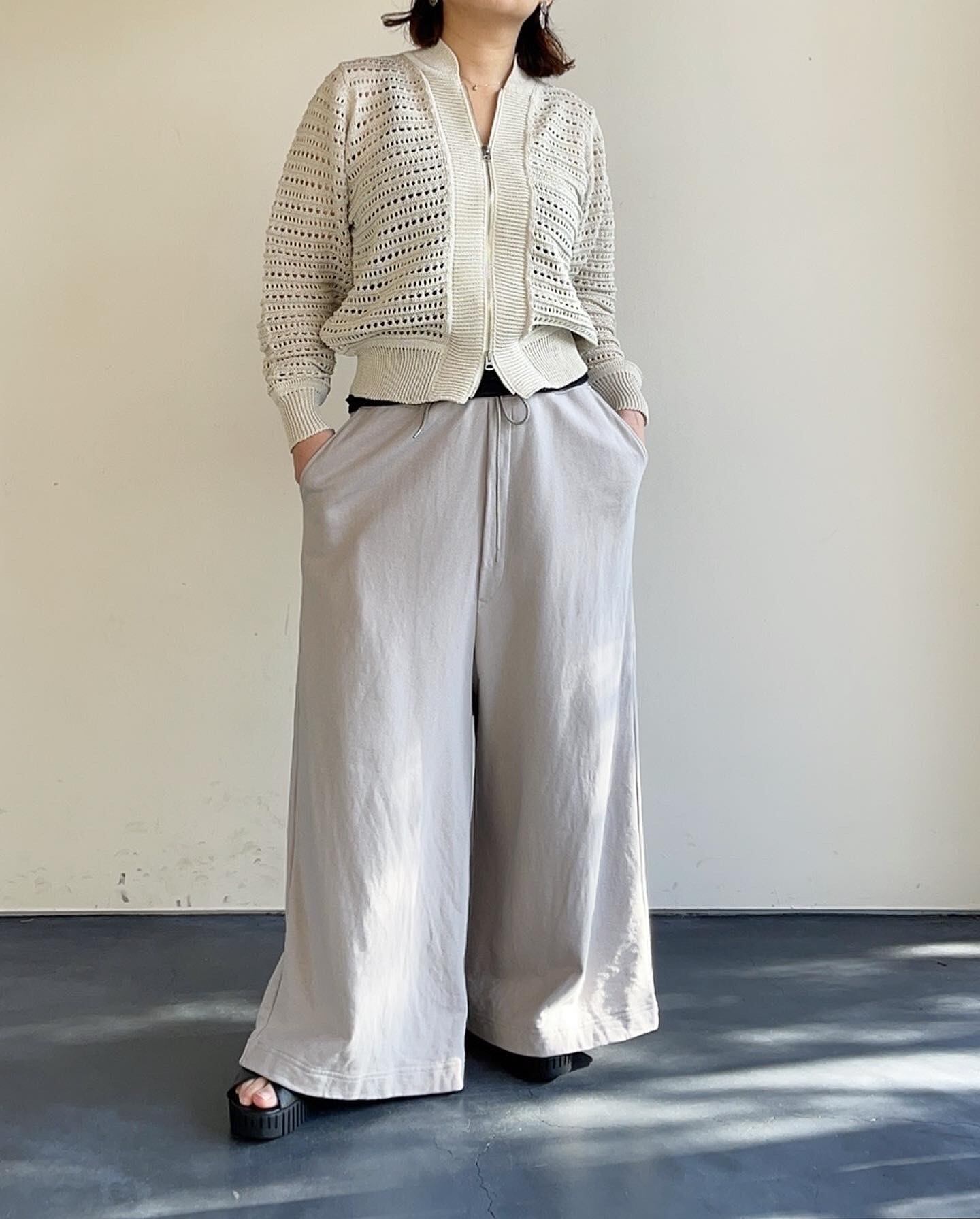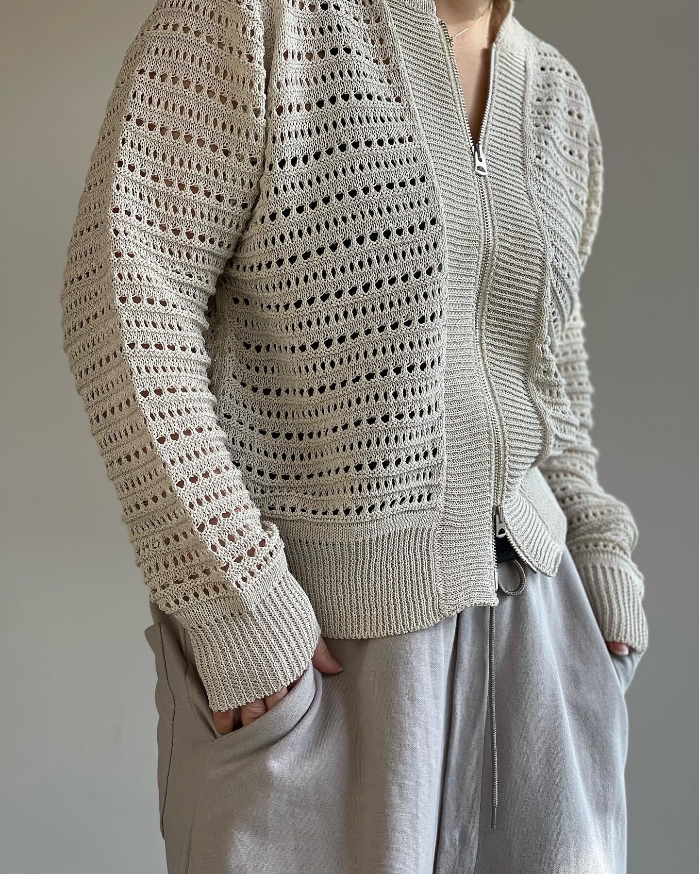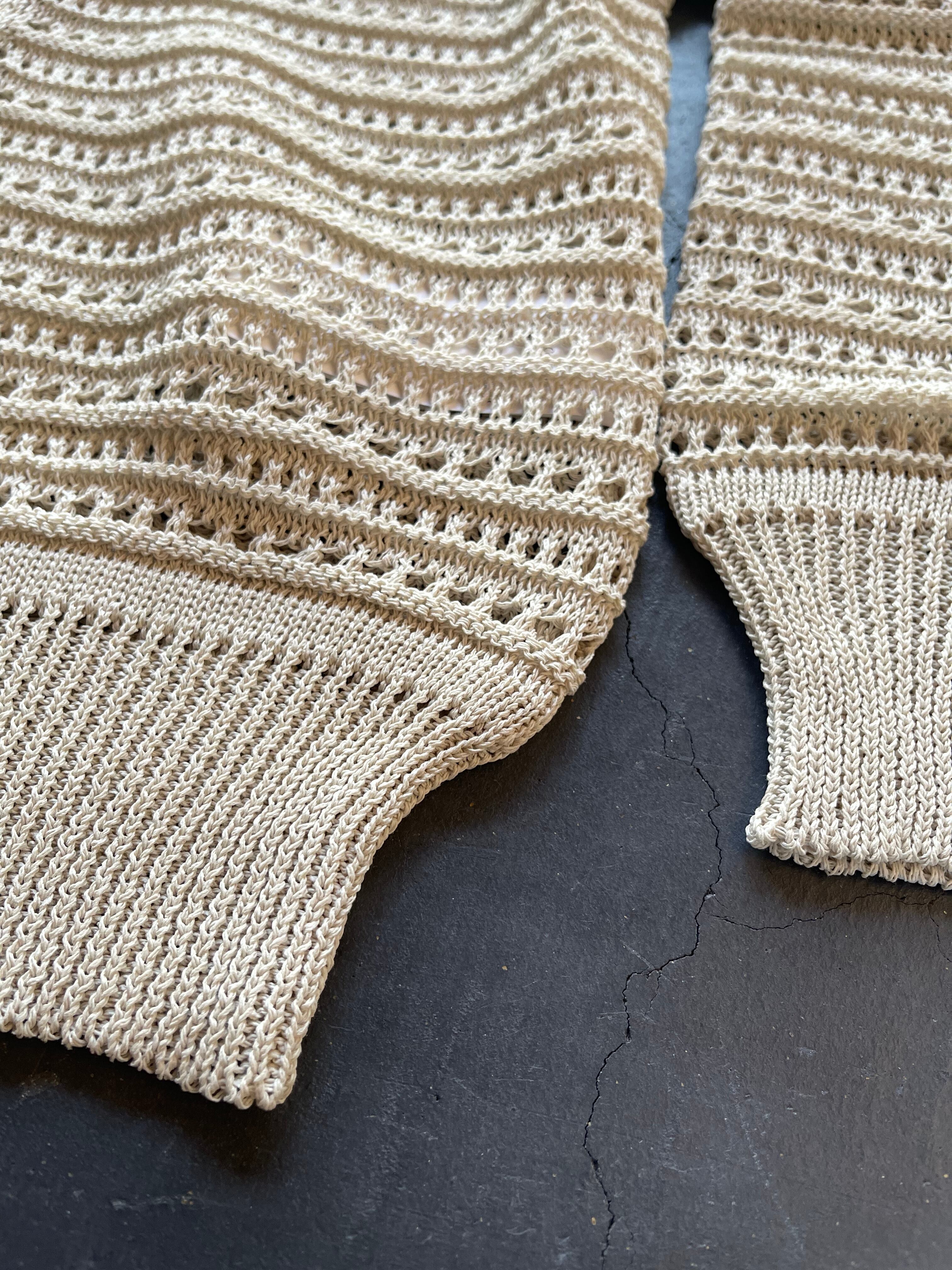 シワや毛玉ができにくい性質も兼ね備え、清涼感を感じさせるマスキュリンな強いドライタッチとフェミニンな透かし編みが相まって独特の風合いを醸し出す。