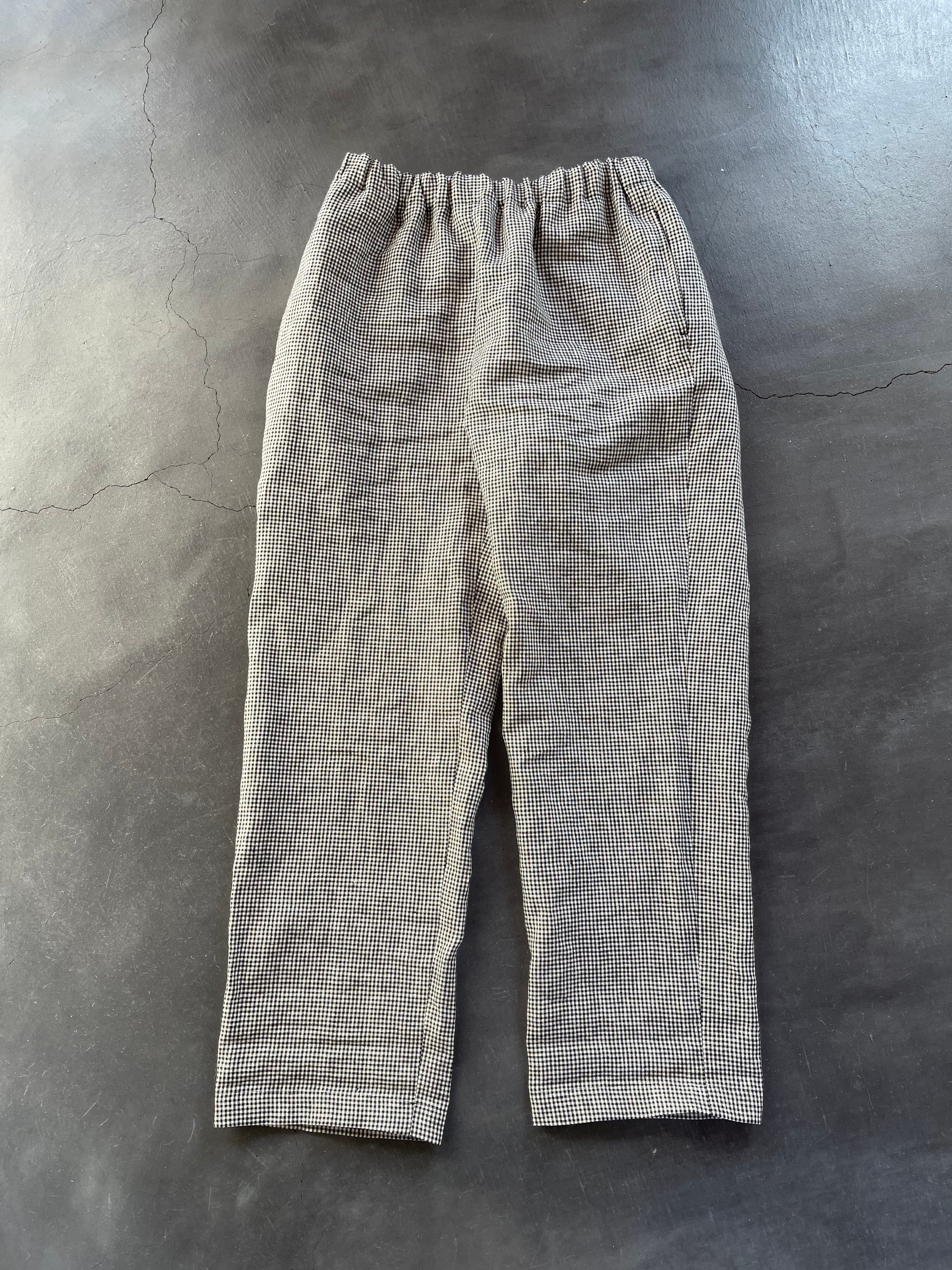 1950年代フランスの飲食店の人たちか着ていた千鳥格子柄の作業着を参考に、先染めのリネンギンガムチェックを採用しています。