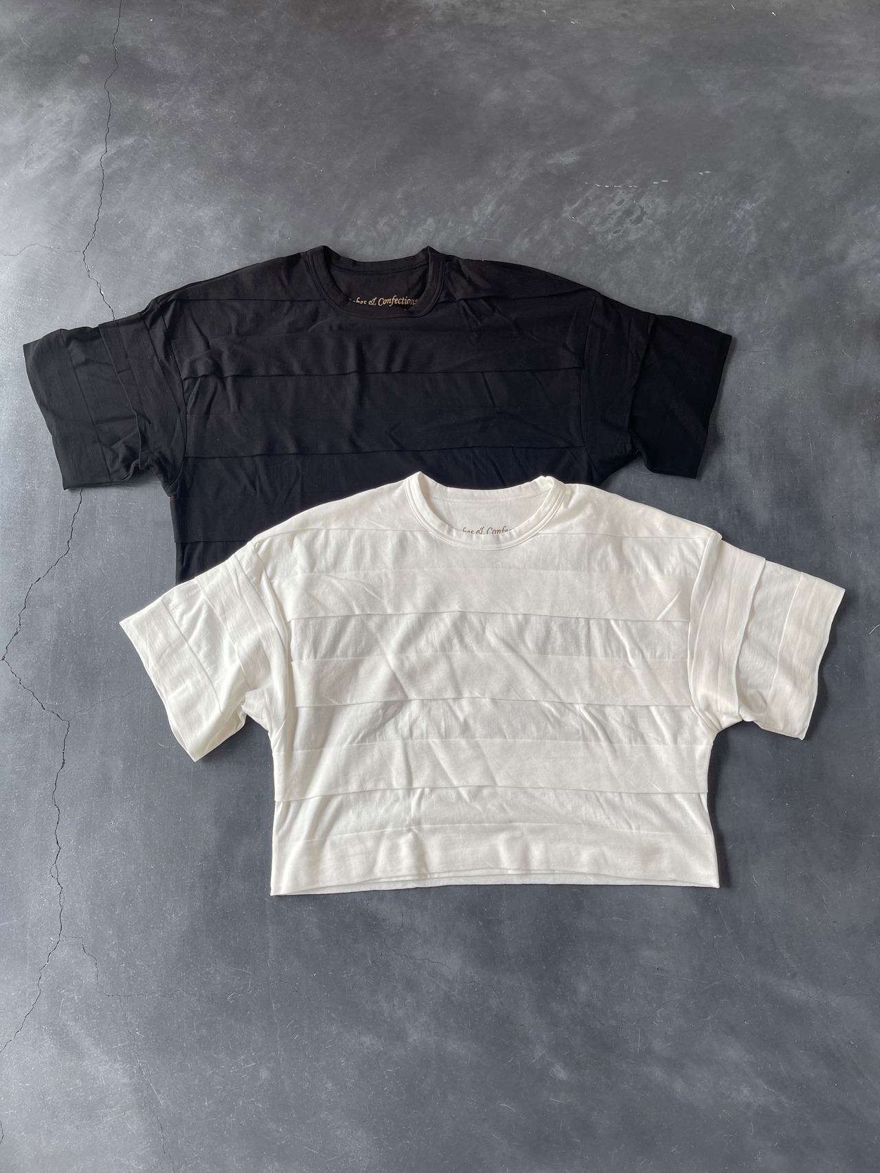 リップボーダーと名付けた、スーピマコットンの天竺とループ状の帯で交互に波打つ様な立体的ボーダー柄を表現したオリジナルコットンジャージー素材。