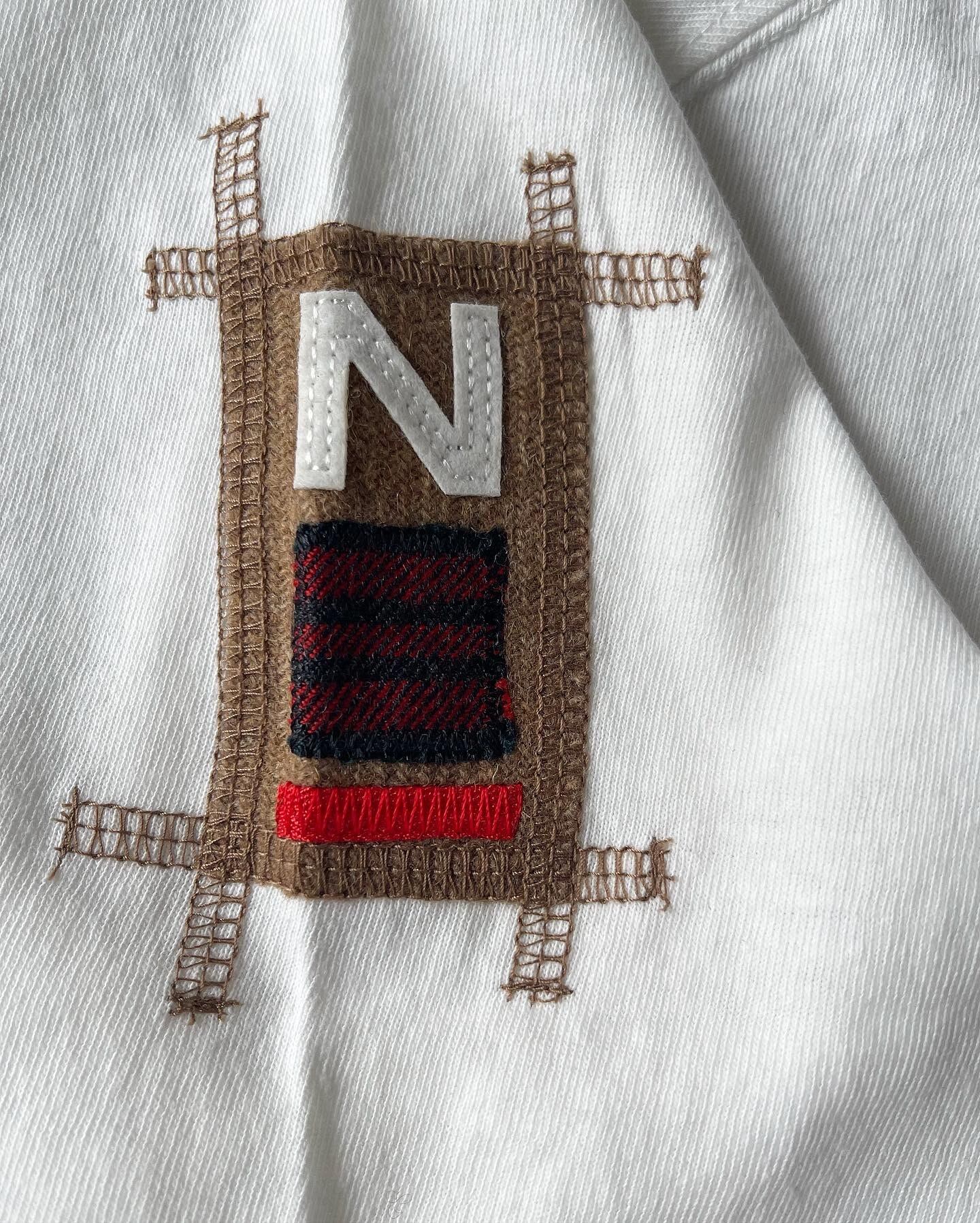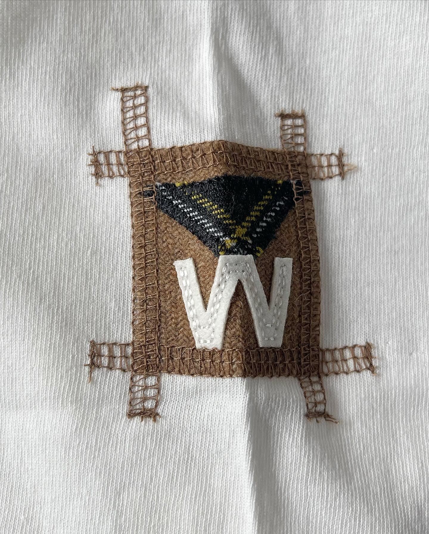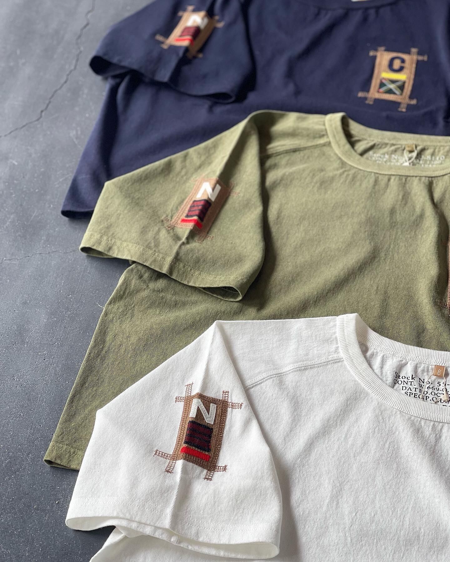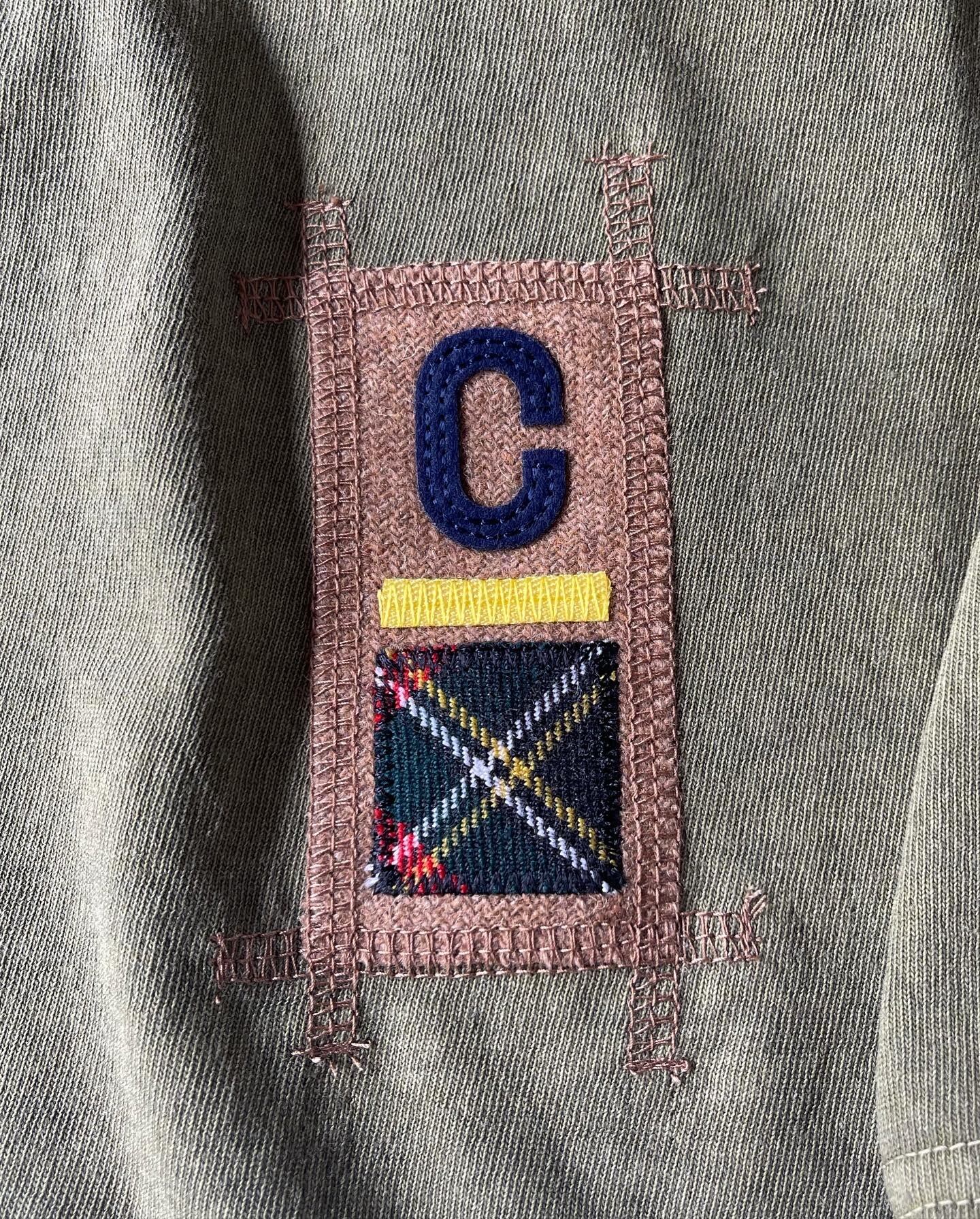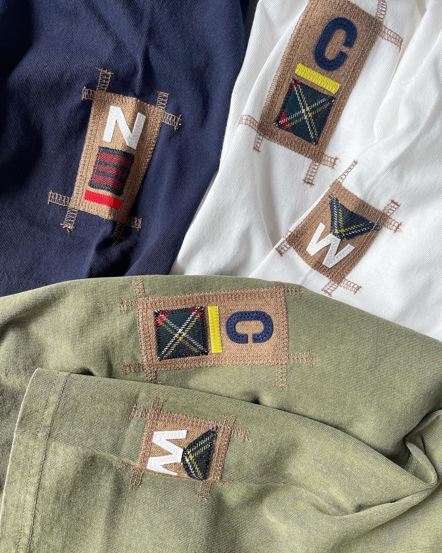 Nigel cabourn woman の頭文字を取った3つのワッペンを作り、袖や身頃に配しています。