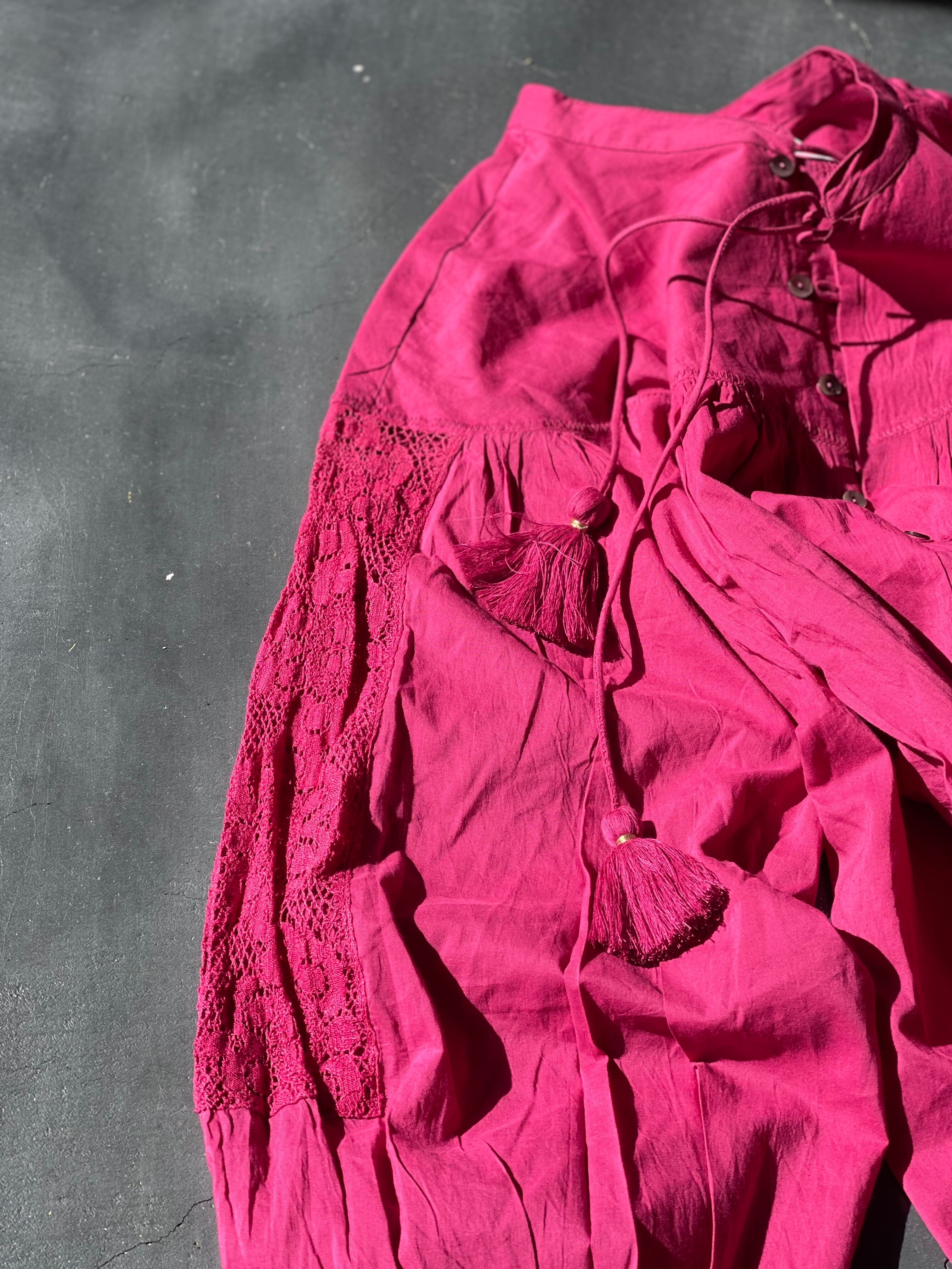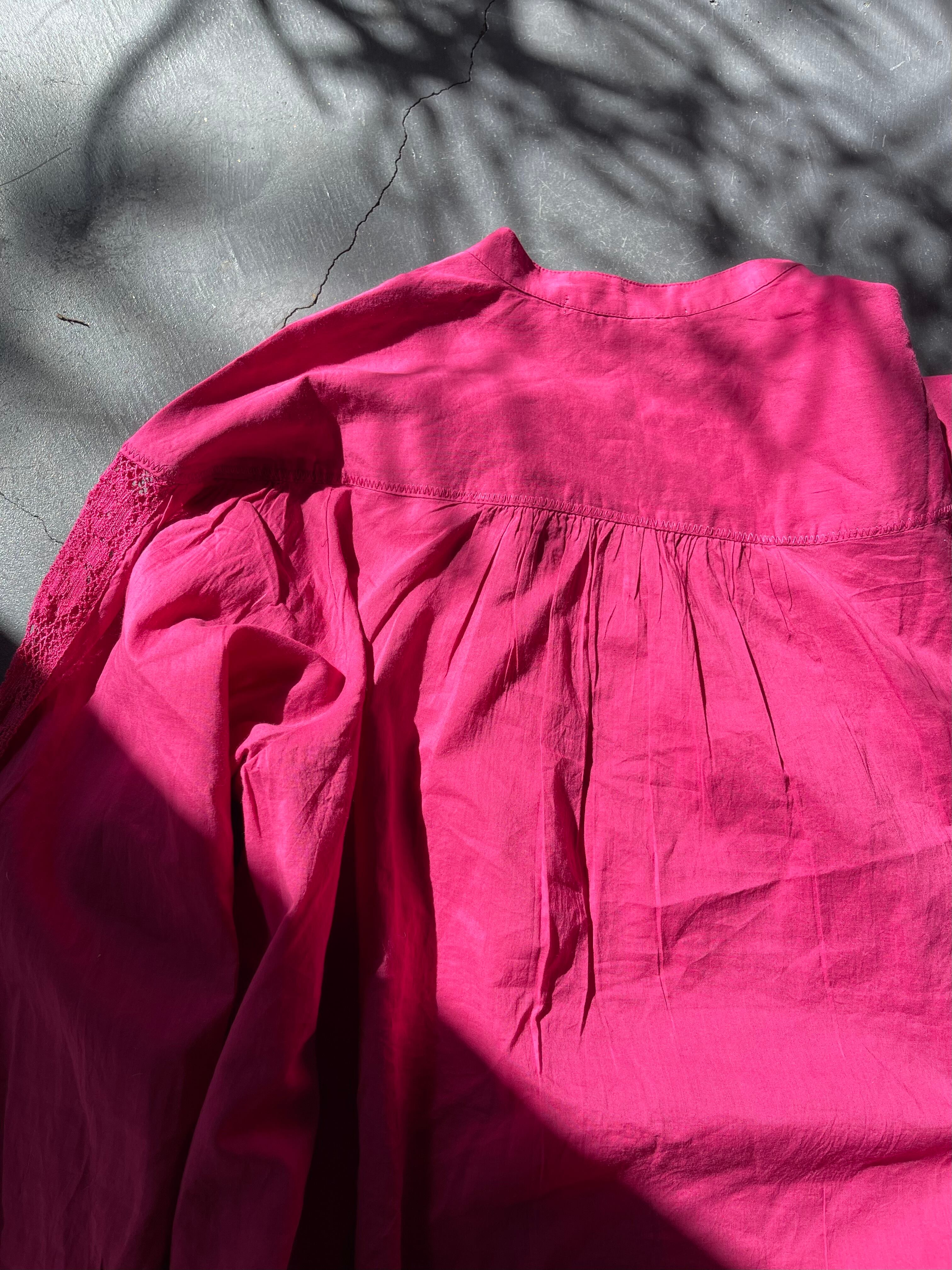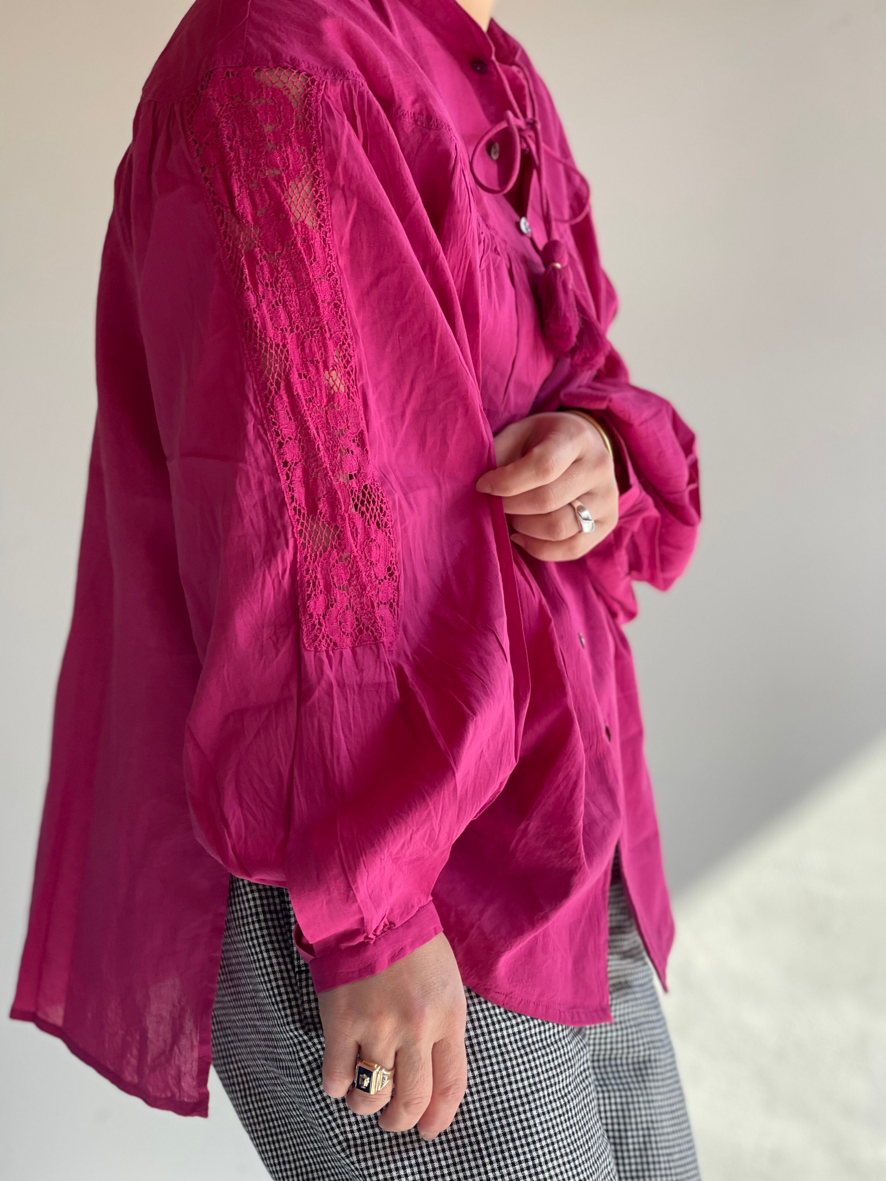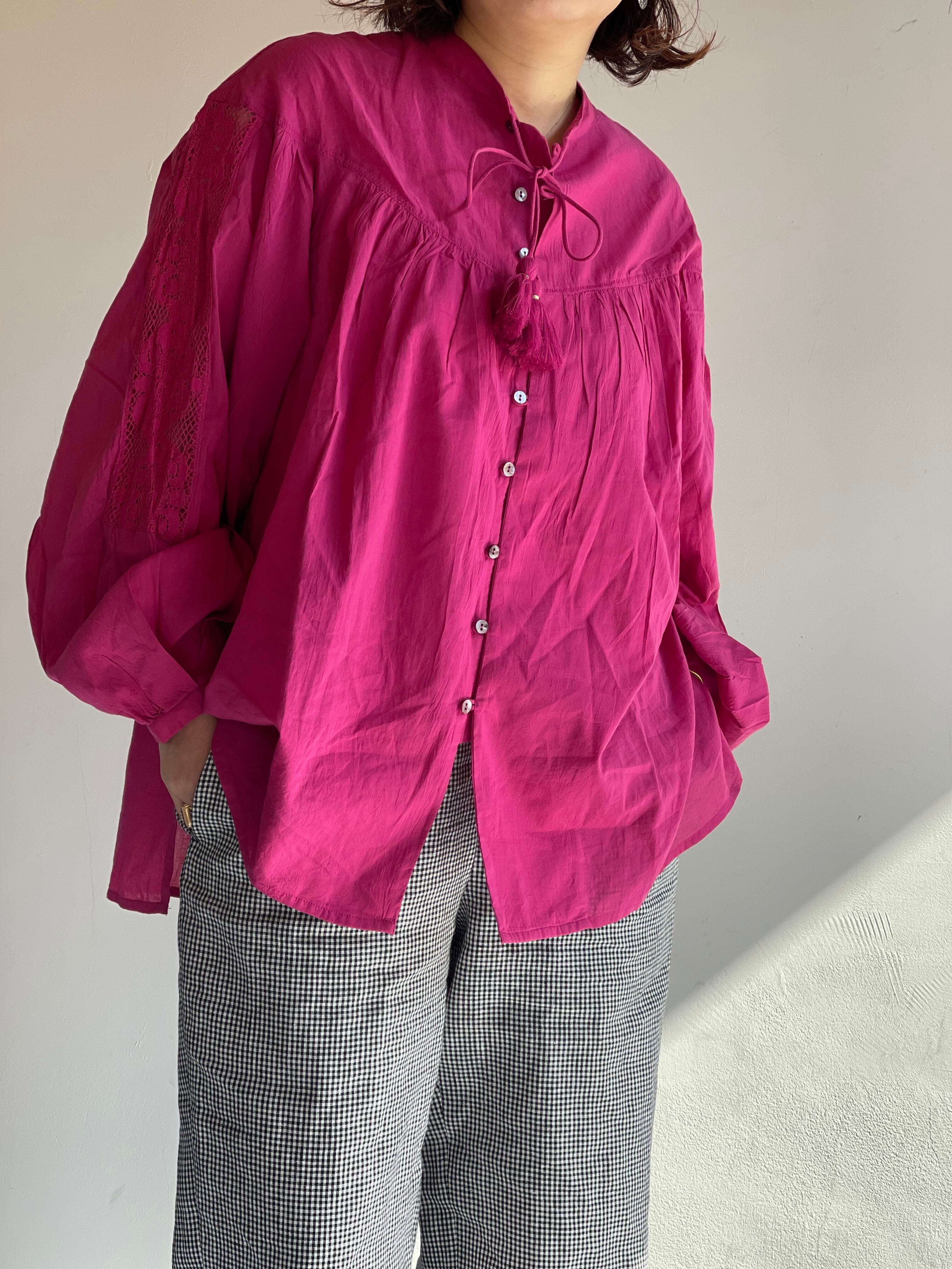インド製のコットン生地に幅広のコットンレースを組み合わせたギャザーブラウス。