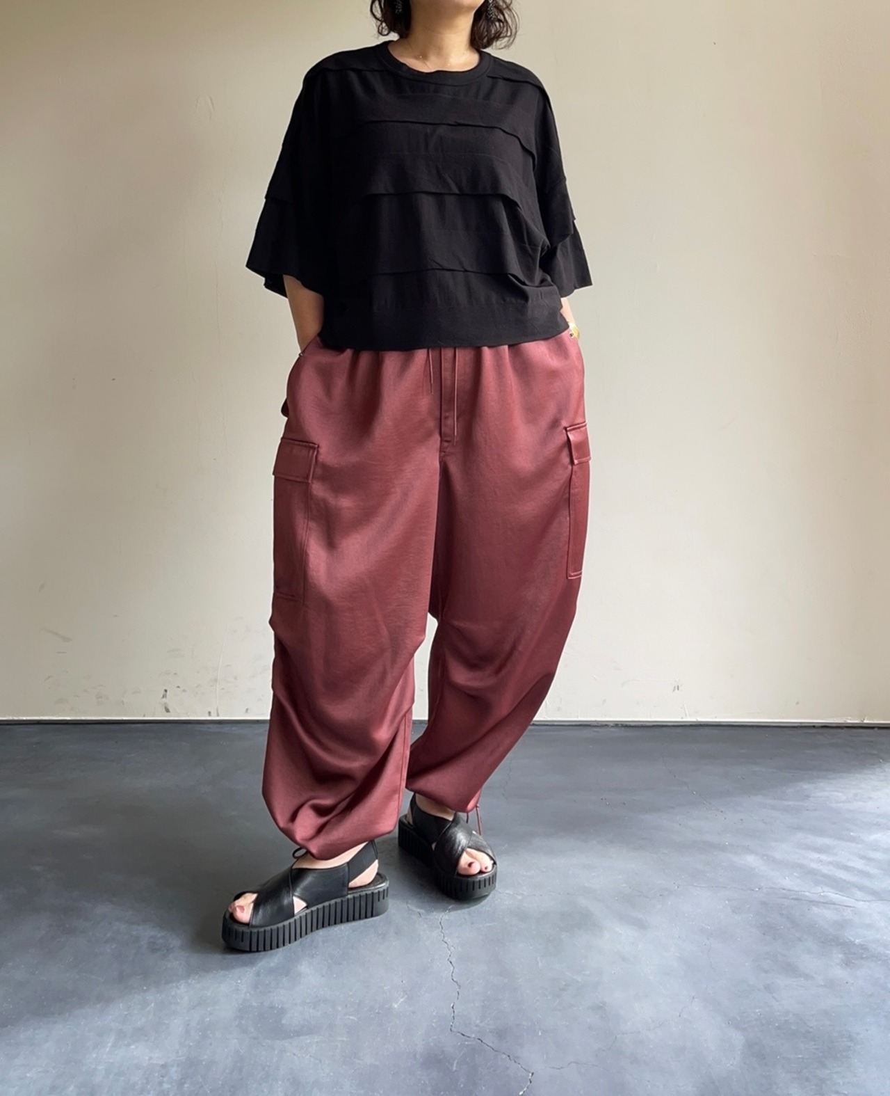 縦糸緯糸の紡績設計を独自に開発した、通常のフラットなサテンにはない豊かな膨らみと落ち感、揺らいだような表情を作り出したオリジナリティー溢れるサテン素材。