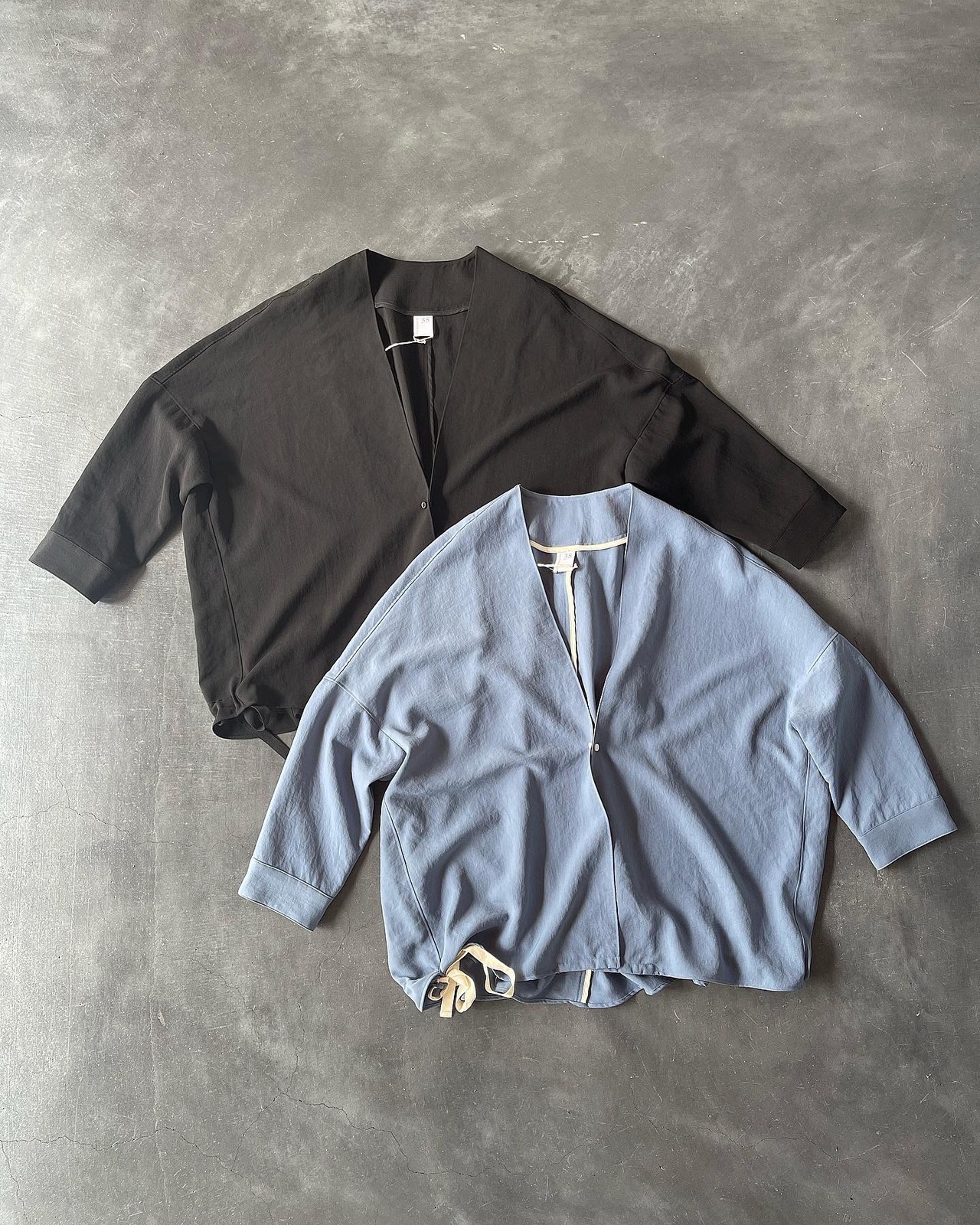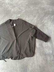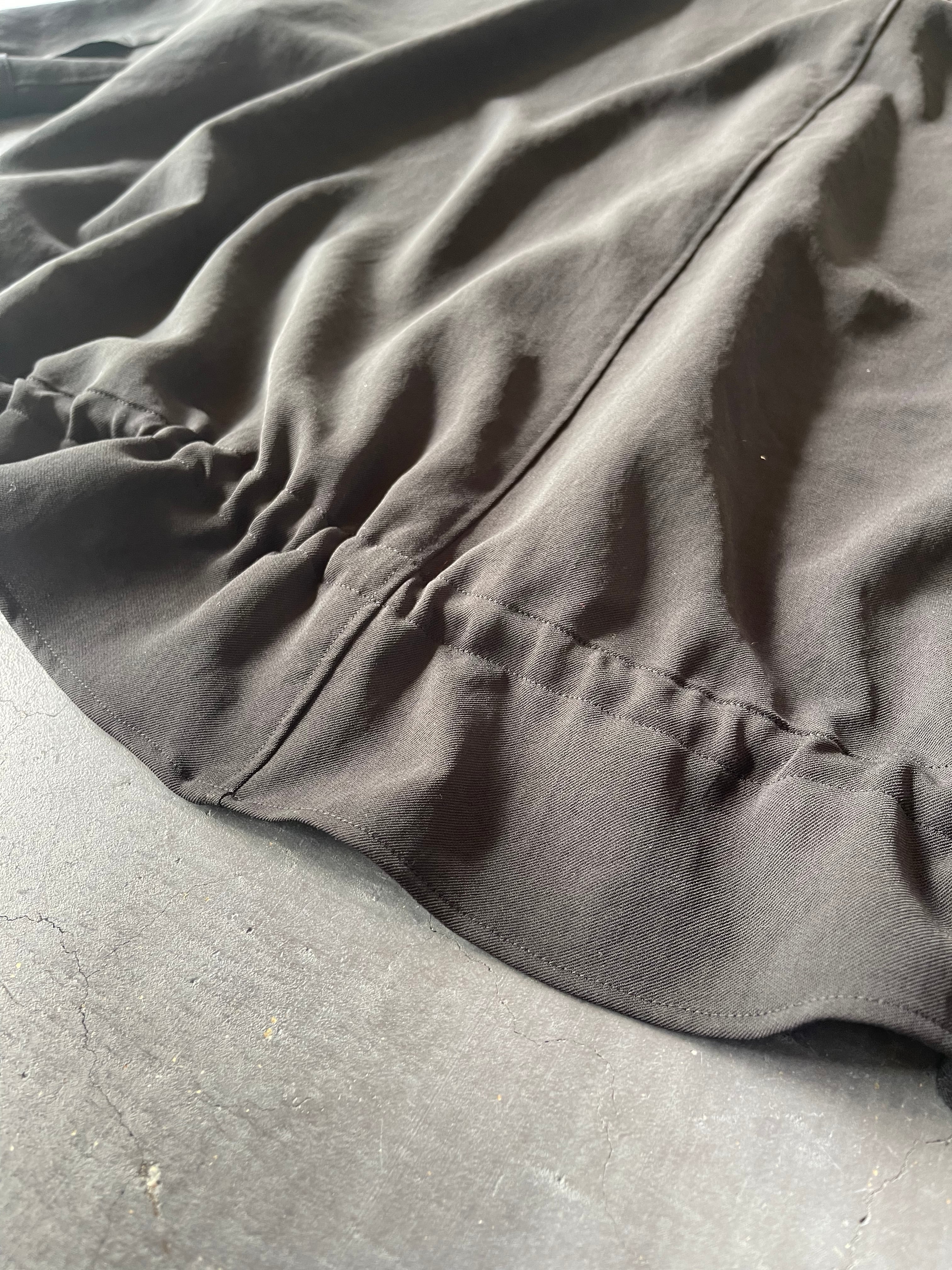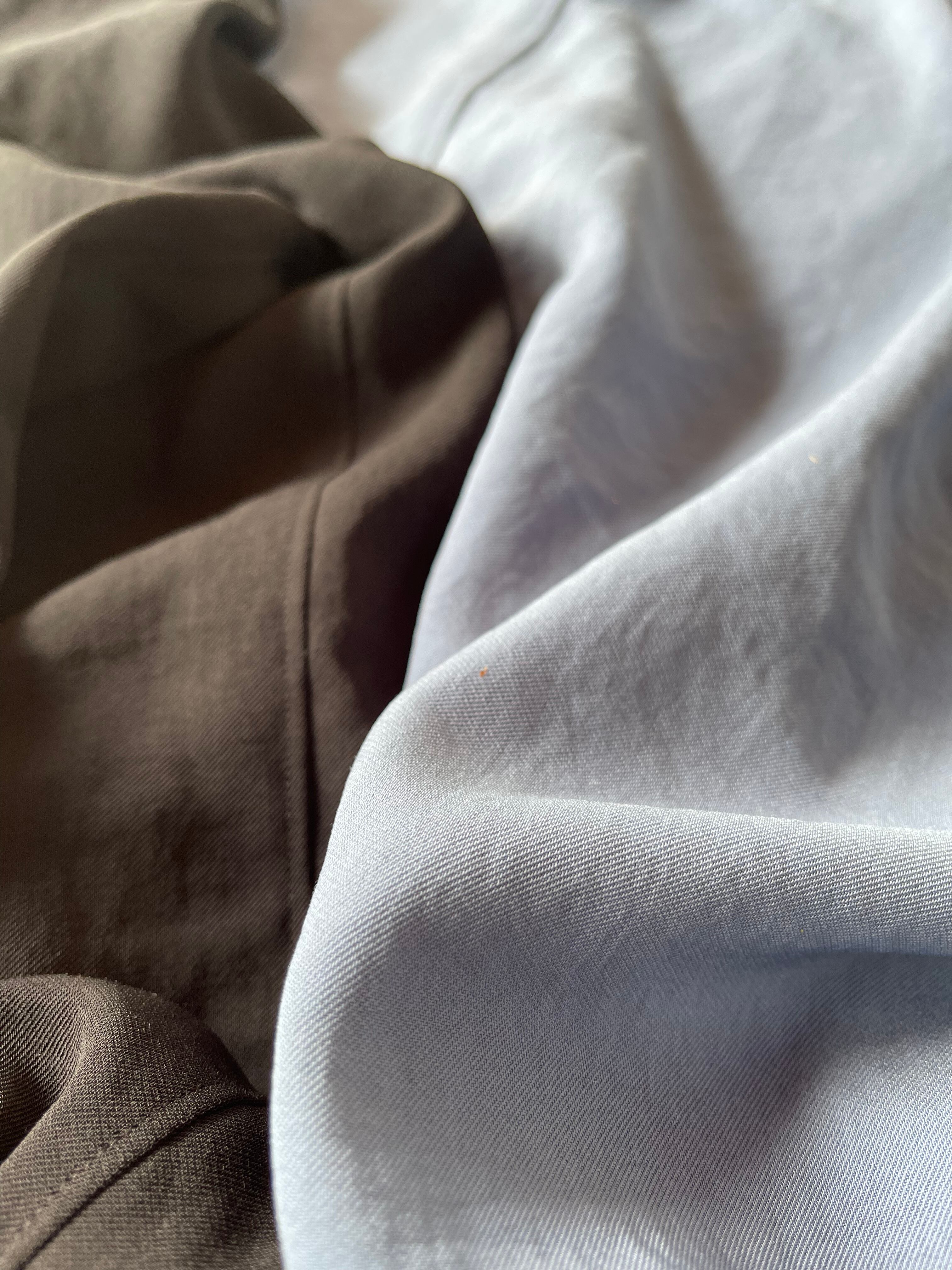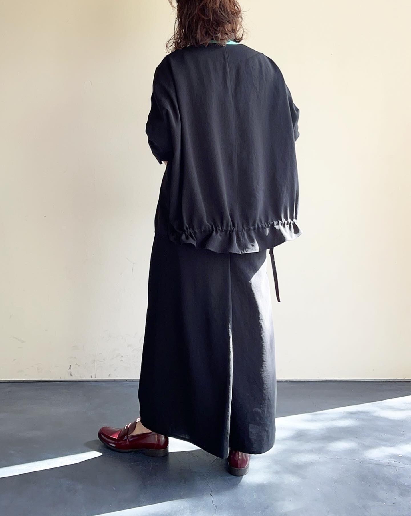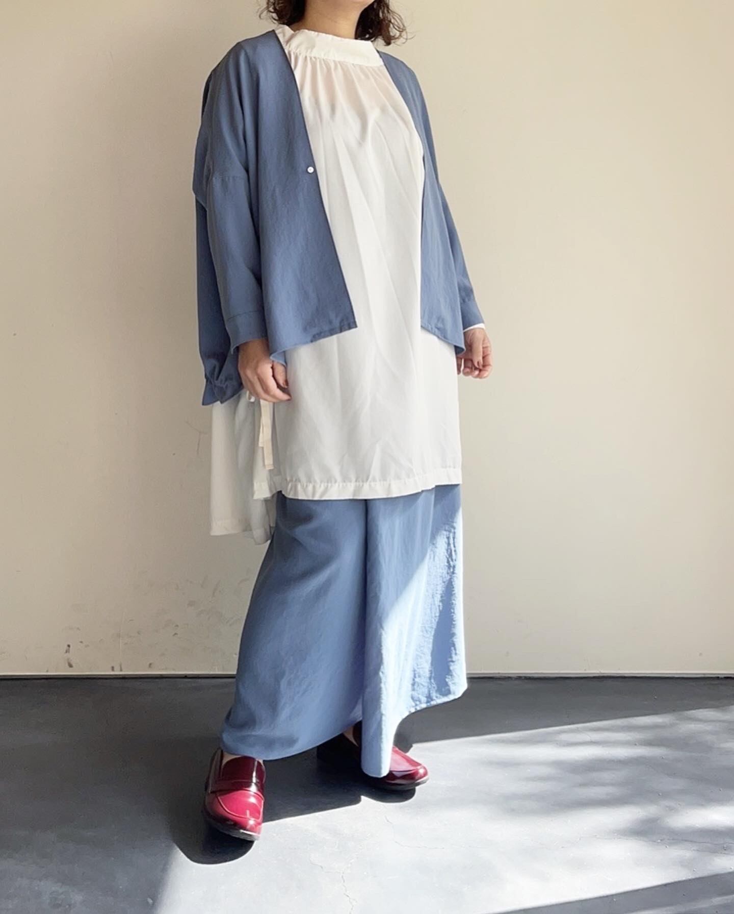 シャリ感と落ち感を合わせ待ち適度な重量感もあるので服のラインをとても美しく見せてくれる素材です。