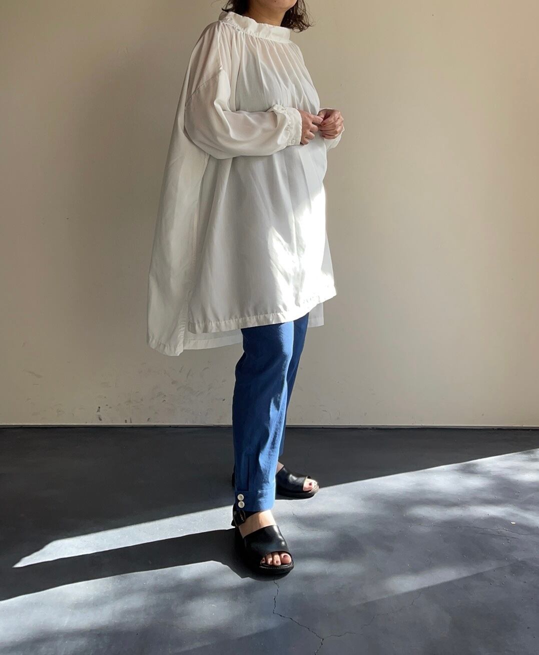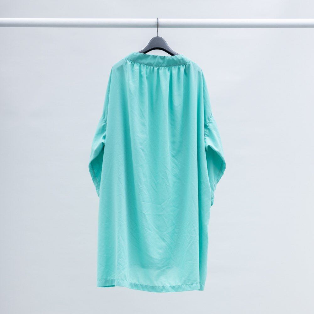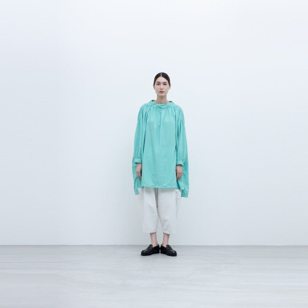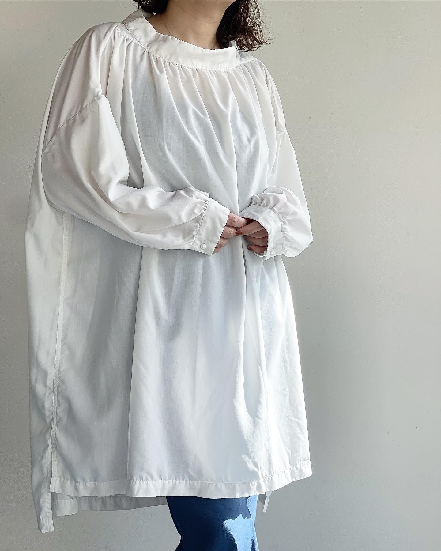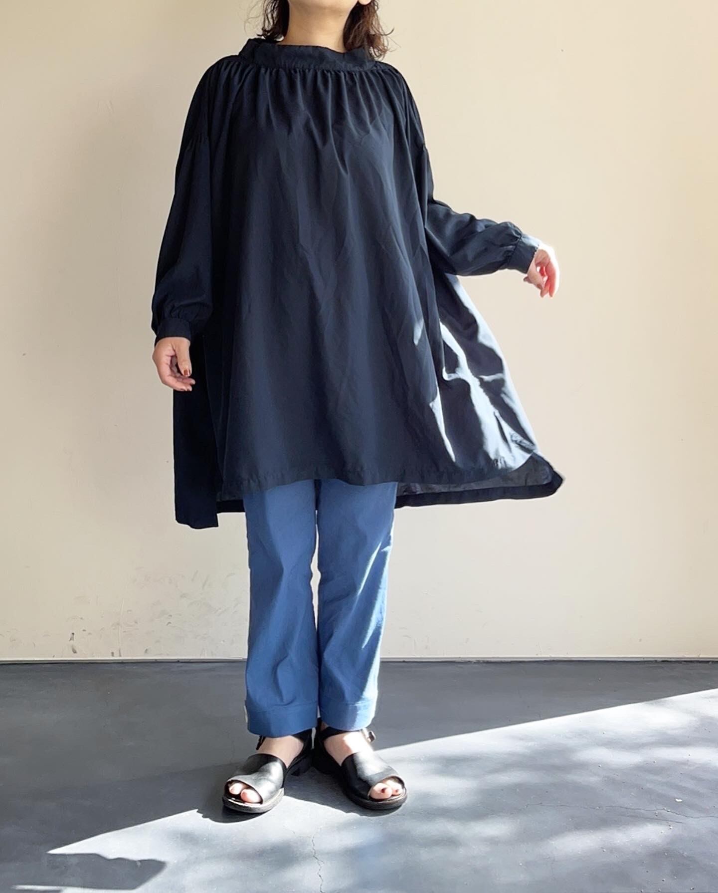 経糸緯糸共に30/-のスパンポリエステル糸を使用したローン生地です。ローンにしては太い糸を使用していますので透け感は無く柔らかいシャツ生地に仕上がっています。製品染めを施すことでパッカリングを出し粗野な感じを出しています。
