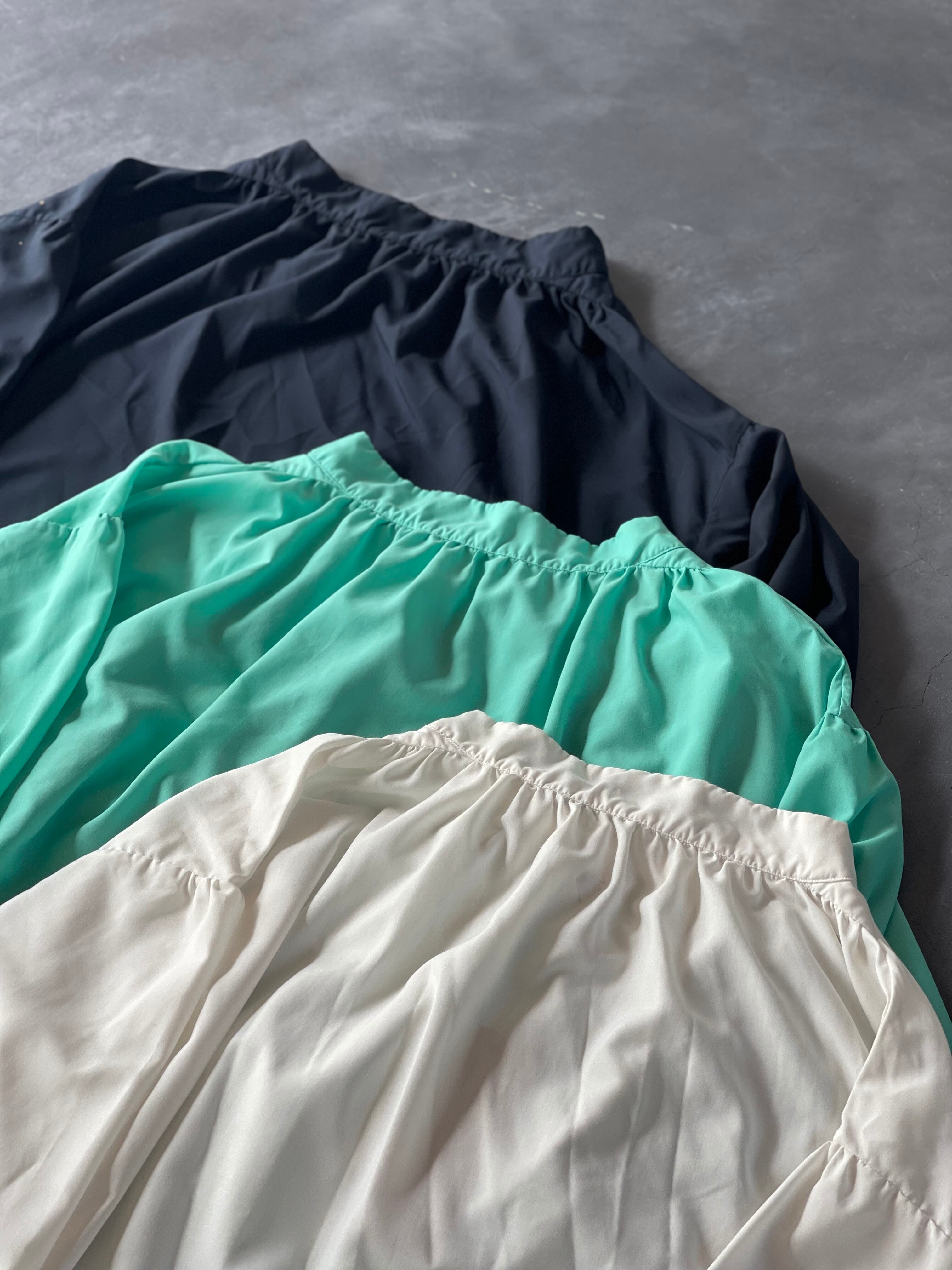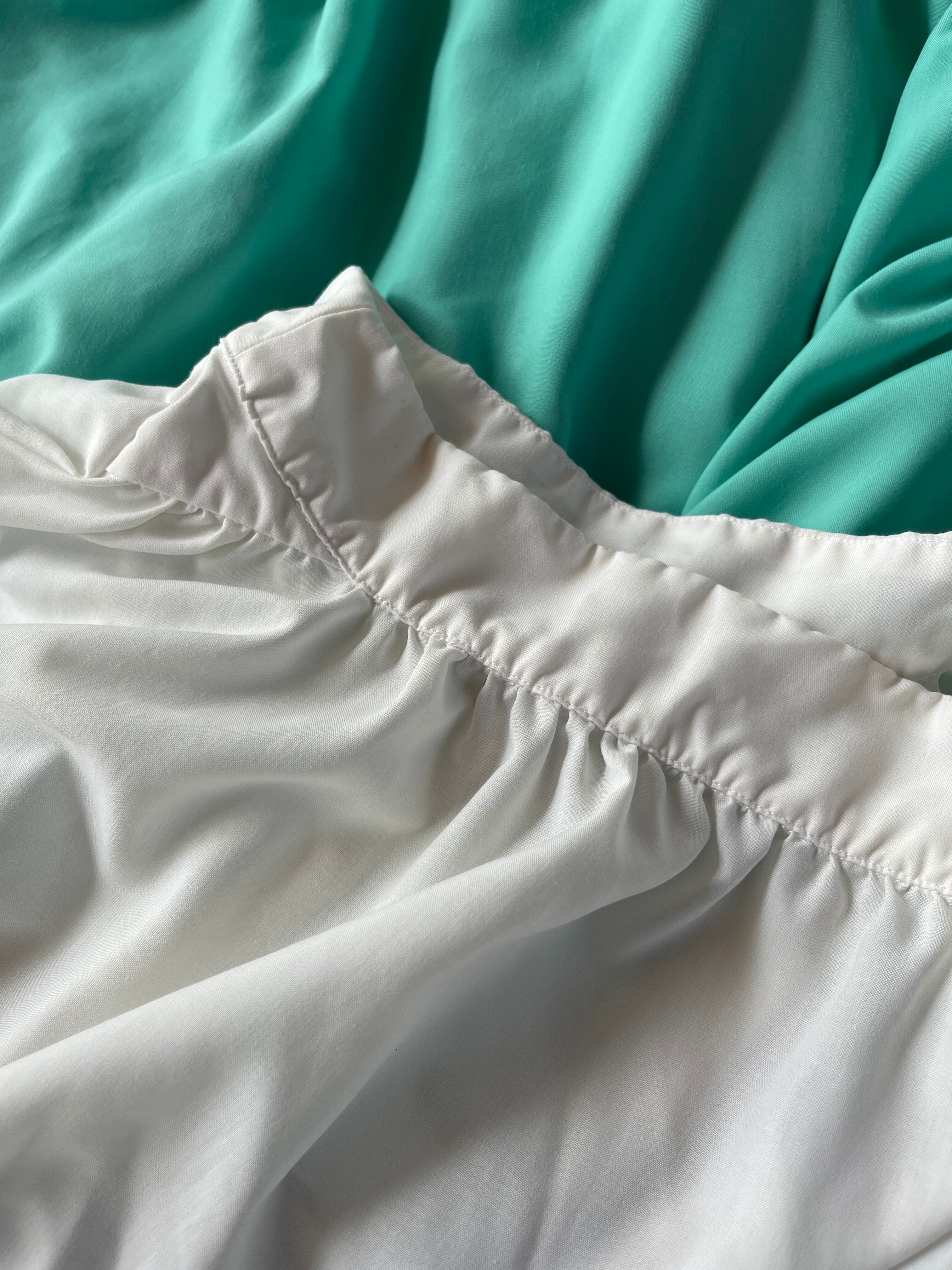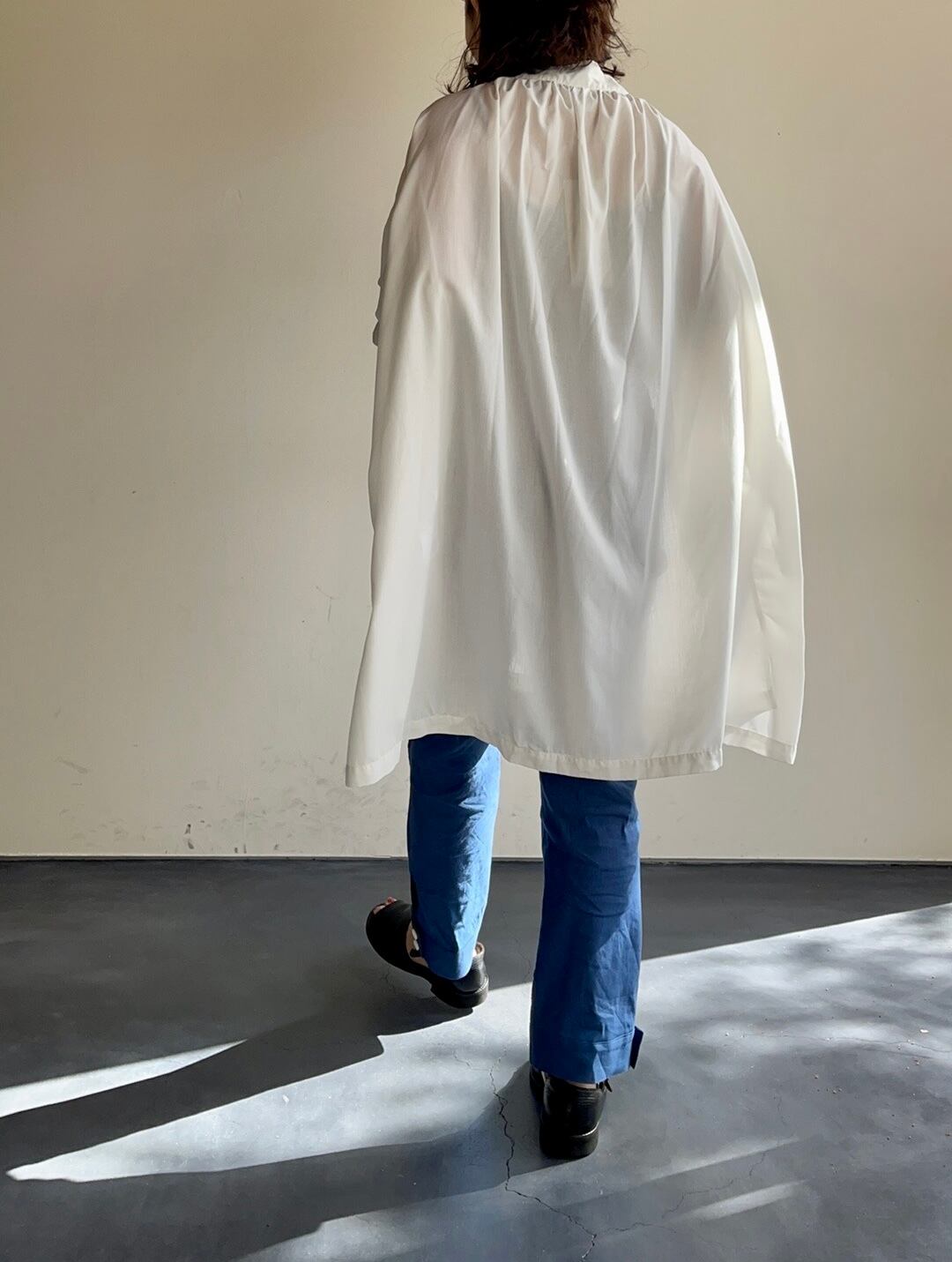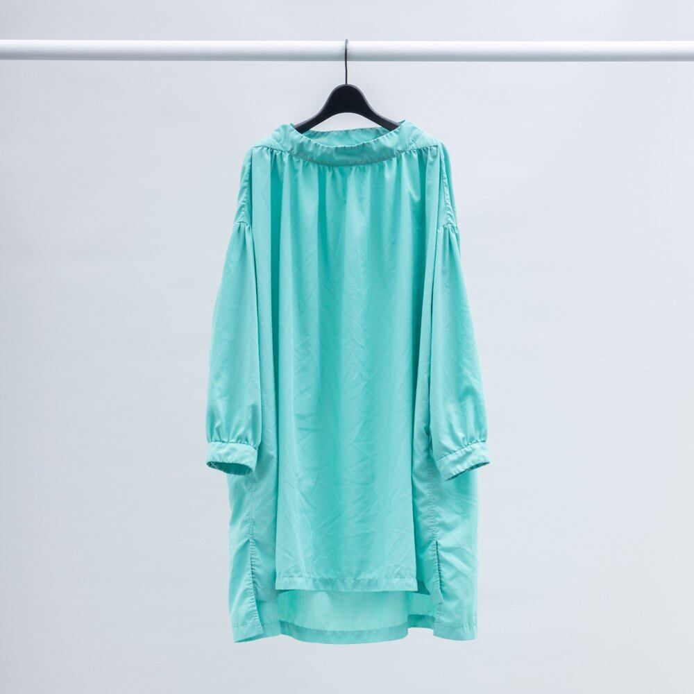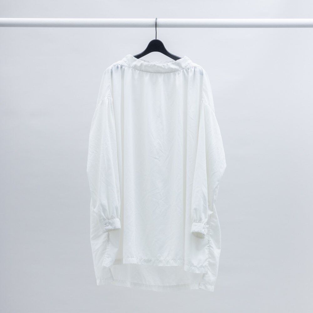経糸緯糸共に30/-のスパンポリエステル糸を使用したローン生地です。ローンにしては太い糸を使用していますので透け感は無く柔らかいシャツ生地に仕上がっています。製品染めを施すことでパッカリングを出し粗野な感じを出しています。