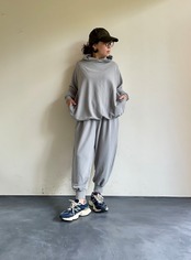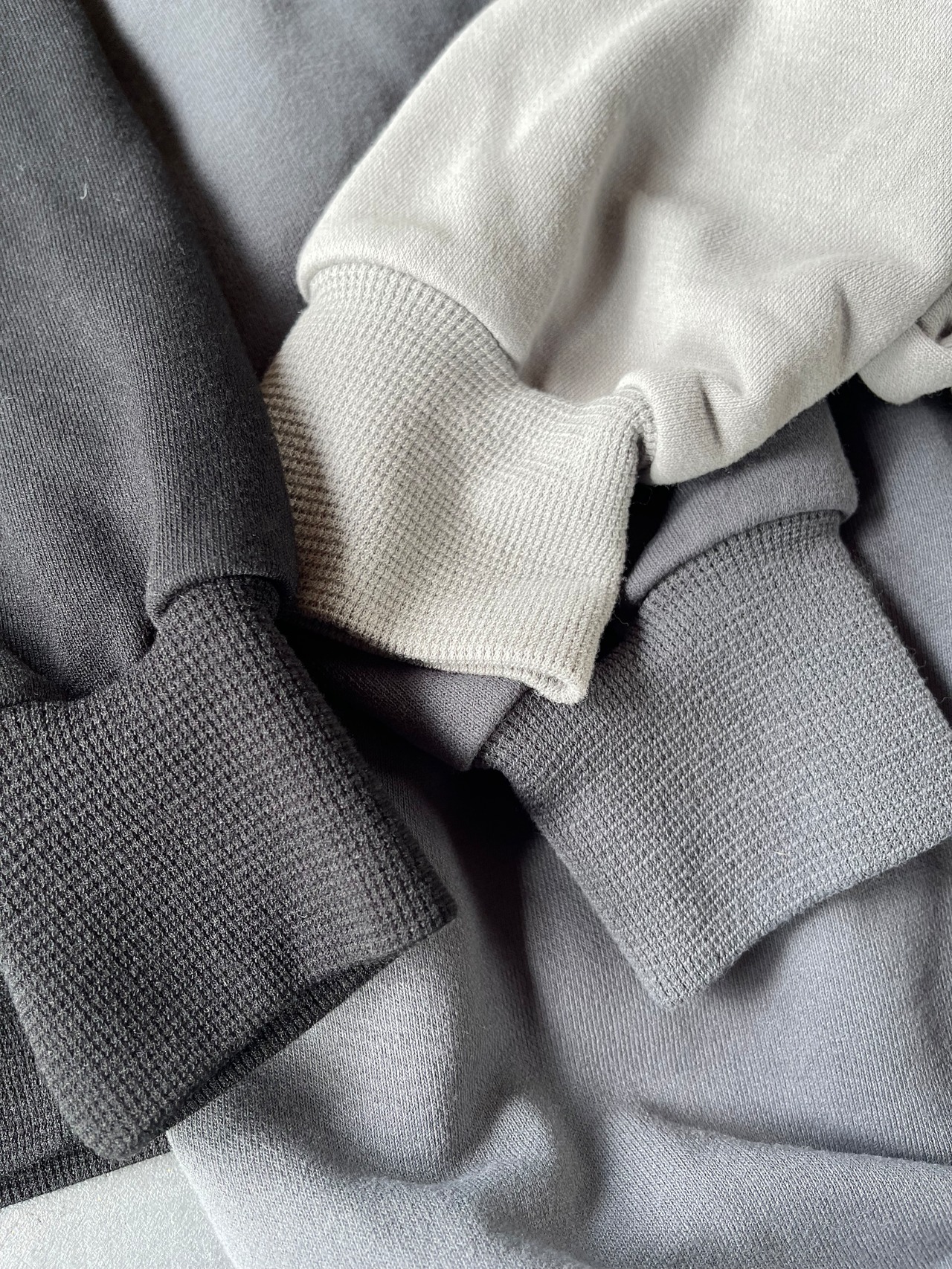 表面はドライタッチの綿ライクなポリエステル糸を使用し、裏はふくらみのあるポリエステル糸を使用しています。甘編みの綿の裏毛にとても近い風合いの柔らかな仕上がりです。
