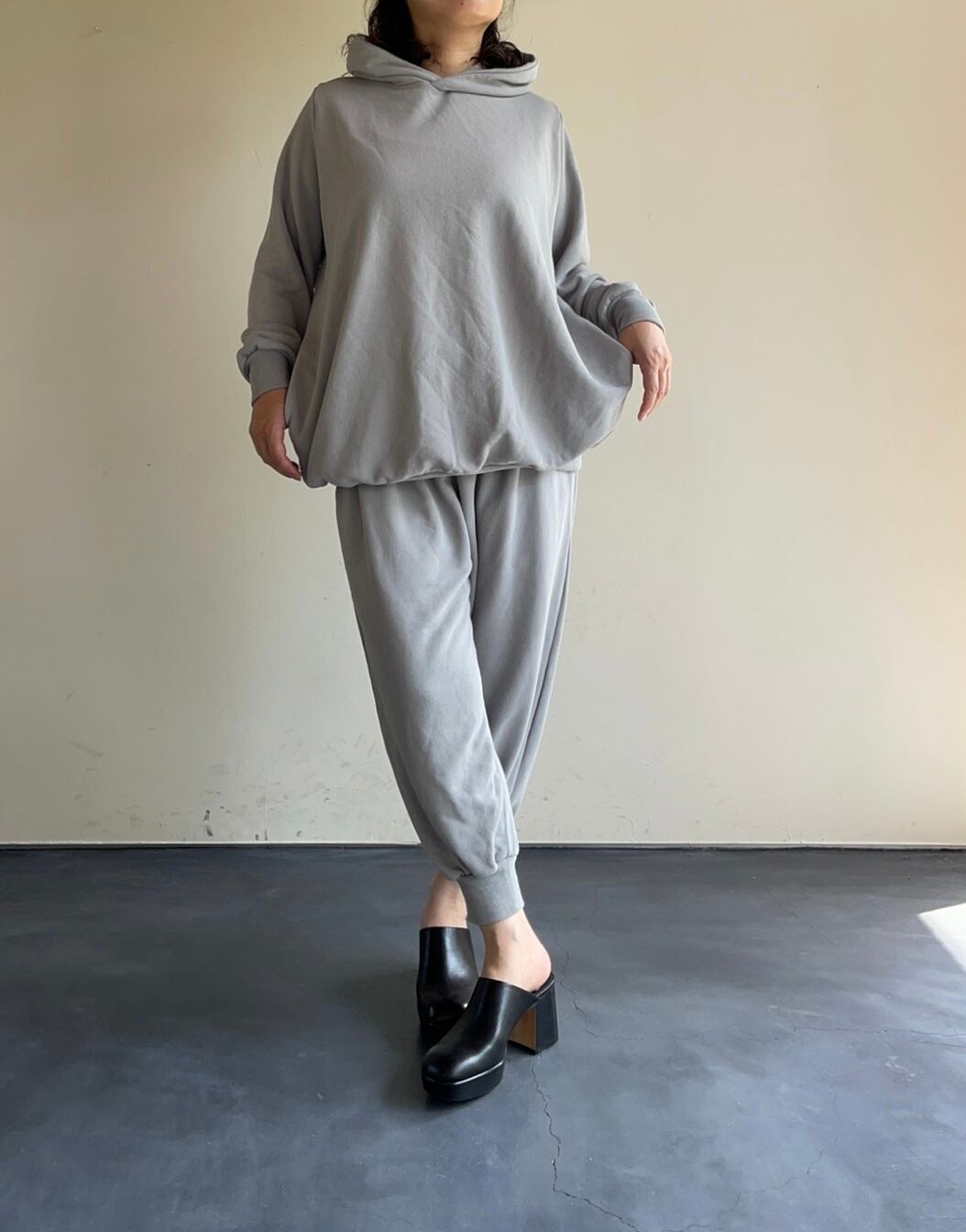 綿番でいうと30/10と同等の、綿ライクなポリエステル100%の裏毛を製品染めしています。