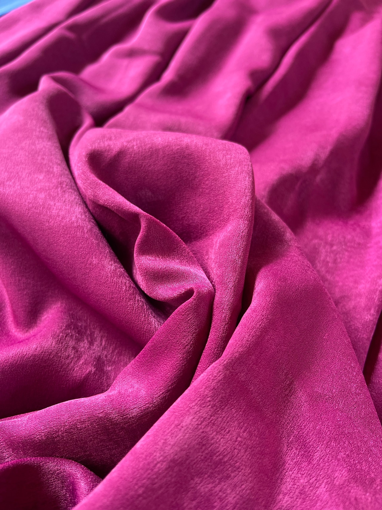 チンチラ加工(シワ加工)によるムラのある光沢によるヴィンテージ感としっとりとしたピーチ感が特徴で、ハリコシなく美しいドレープ感が楽しめる素材です。