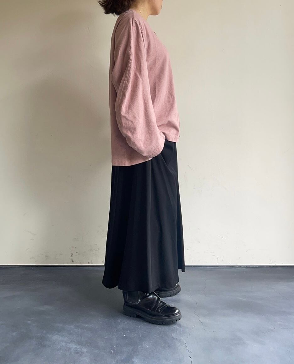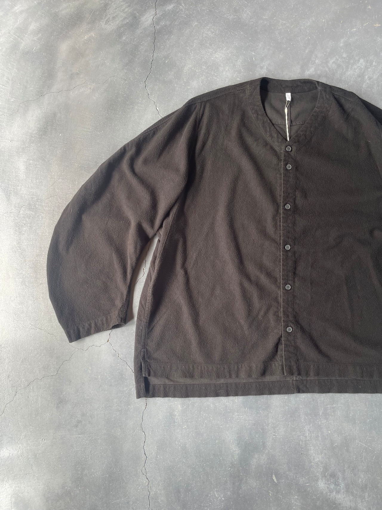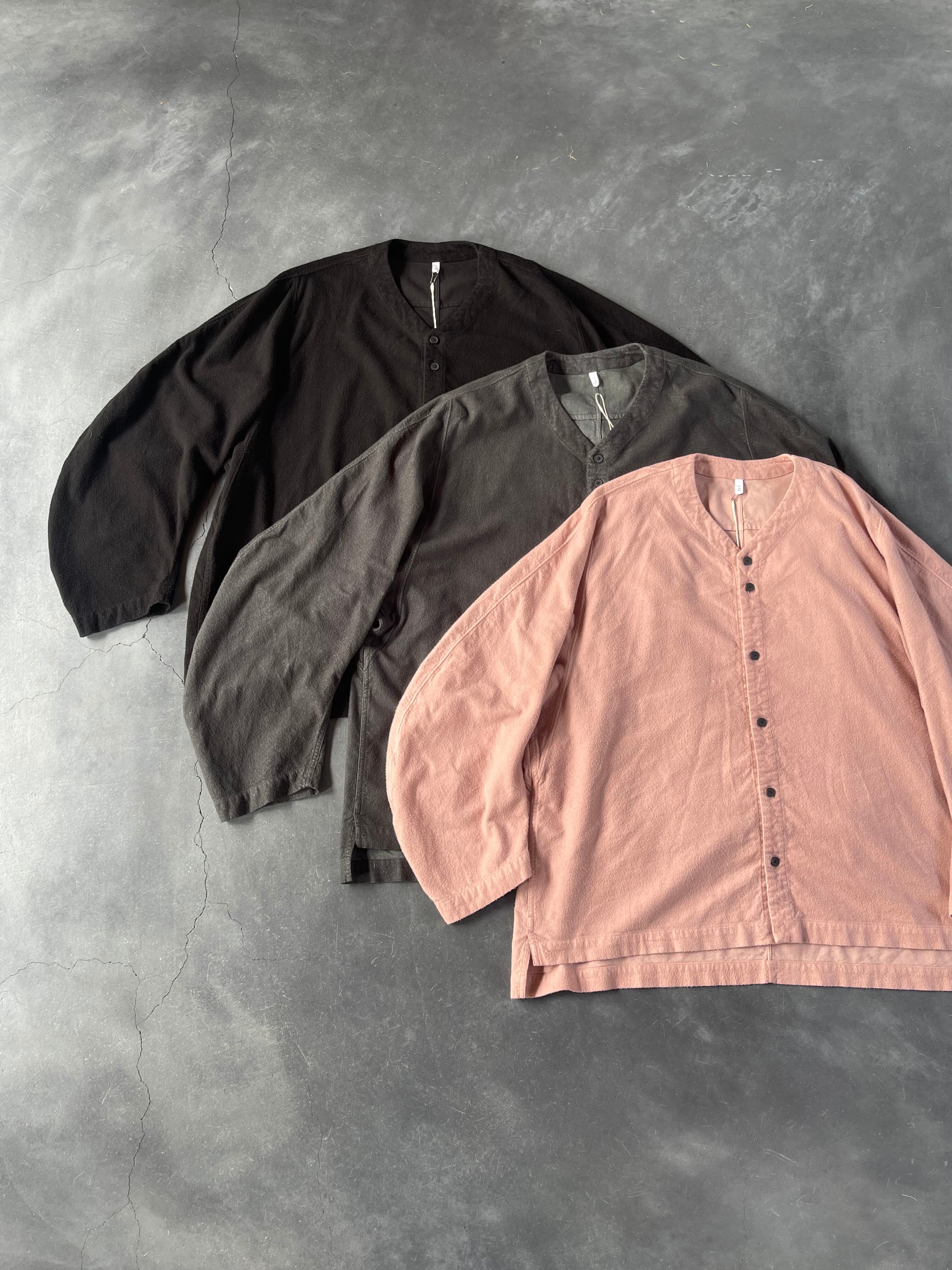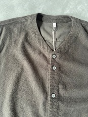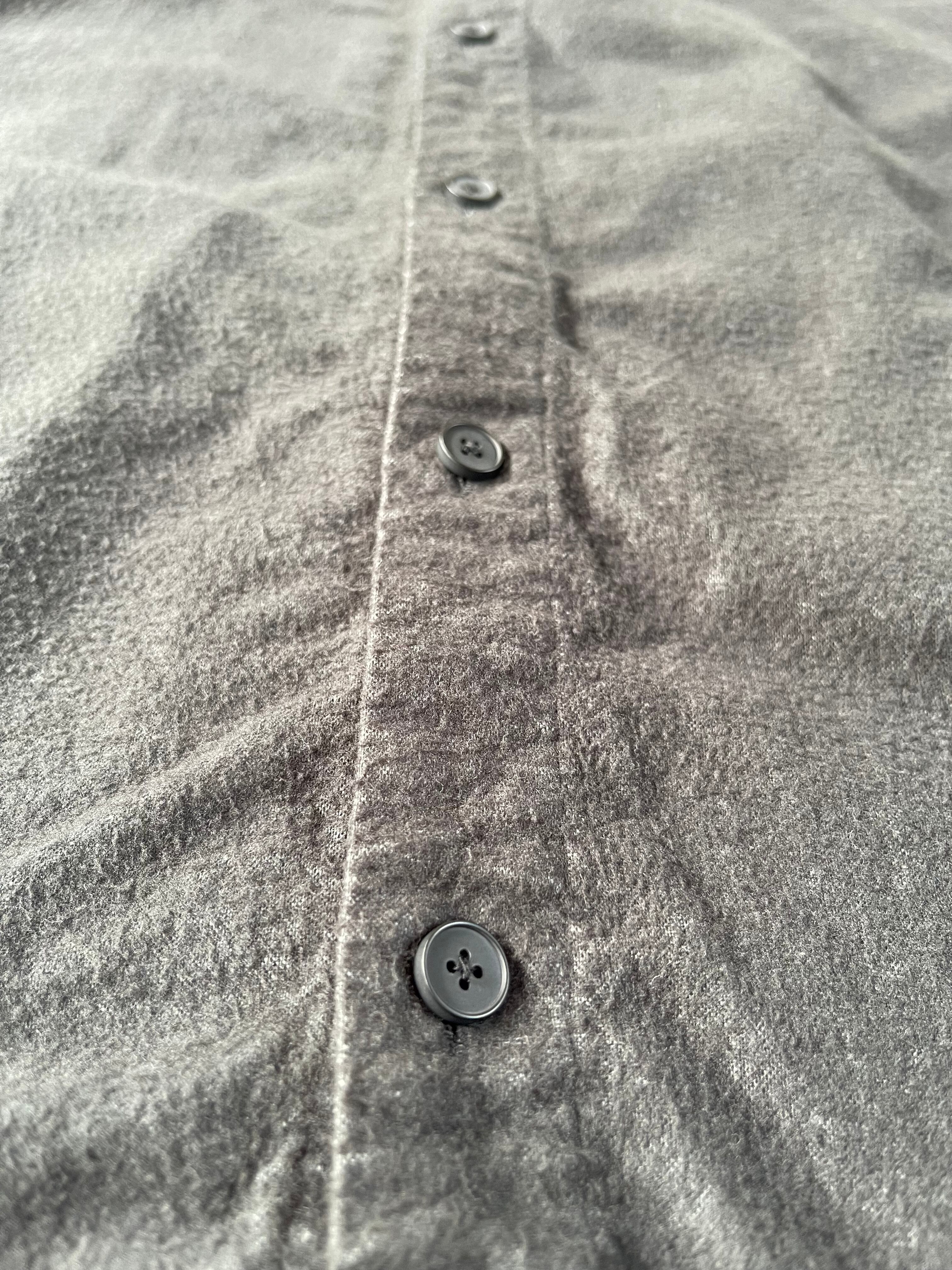 経糸に綿、緯糸にレーヨン双糸を使った平織り生地を深く起毛しています。レーヨンは非常に暖かいのが特徴でこの生地もとても暖かく、加えて起毛することで滑らかに柔らかくなった風合いが特徴です。レーヨンの量が多い生地ですので製品染めを施すことで生地のコシがなくなり、独特の重みと落ち感をもった心地よい生地に仕上がっています。製品染めは釜が小さいためロットによって色差が出ます。セットアップにする際色味が若干異なる場合があります。ご了承ください。起毛が濃く染まり奥のベース生地が薄く染まります。染めムラのように感じる場合がありますが、これはこの生地の特徴です。また、サイズ感も個体差が出ますのでご了承ください。