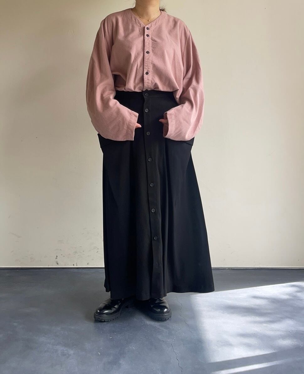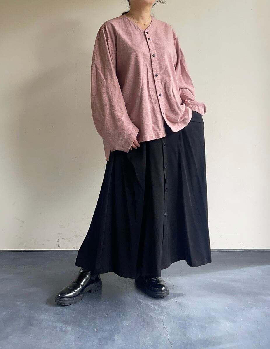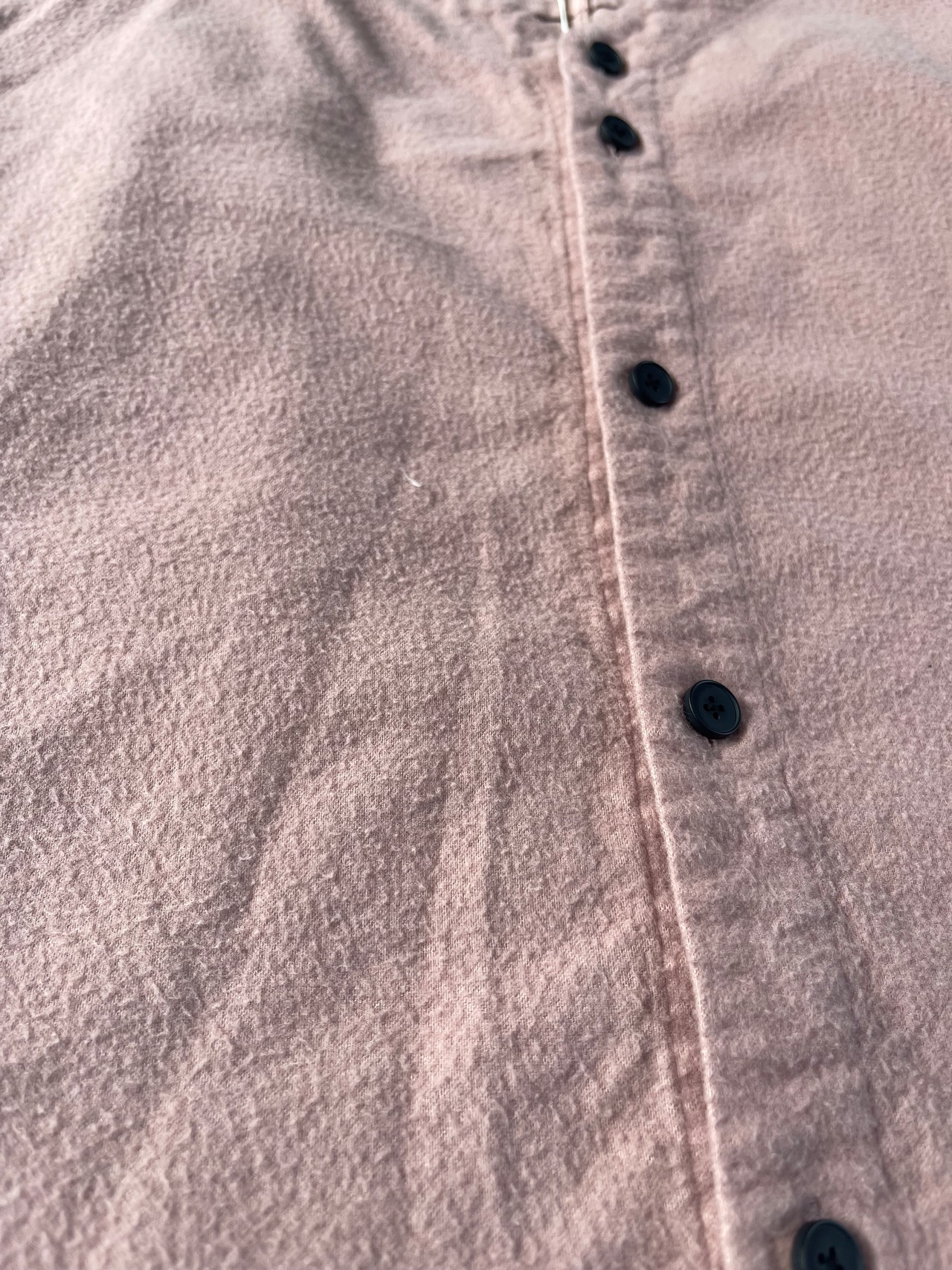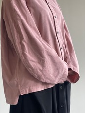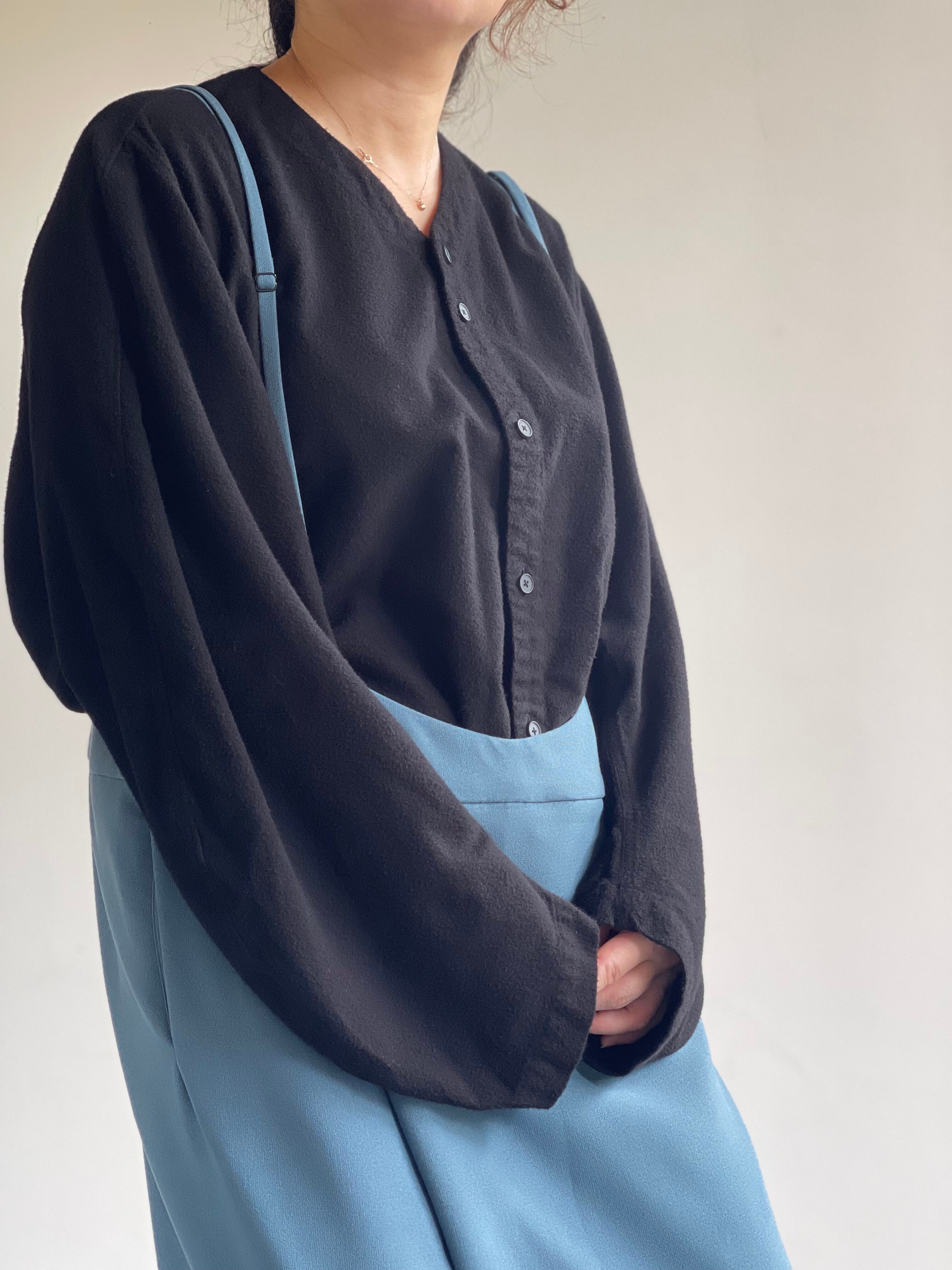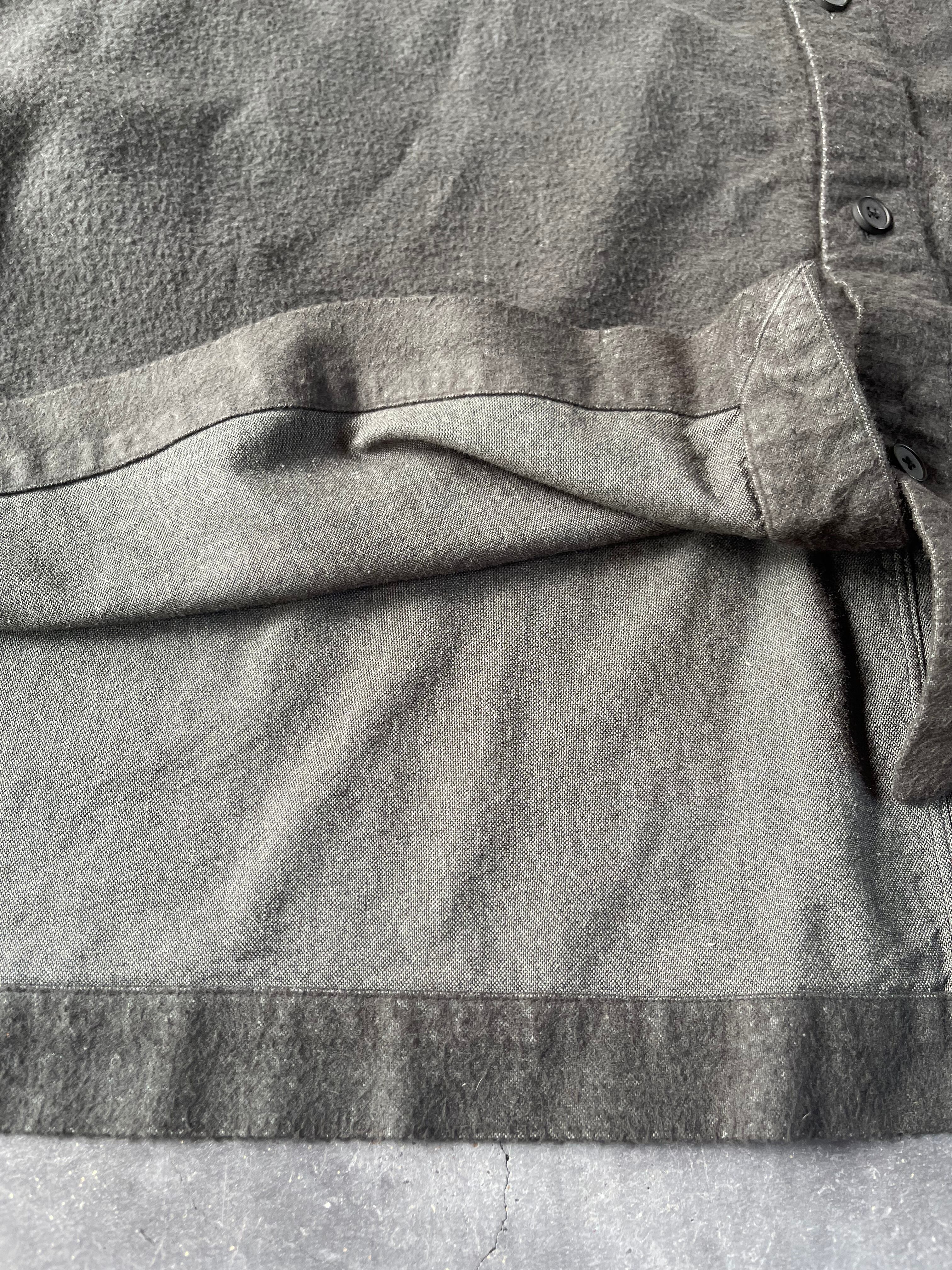 経糸に綿、緯糸にレーヨン双糸を使った平織り生地を深く起毛しています。レーヨンは非常に暖かいのが特徴でこの生地もとても暖かく、加えて起毛することで滑らかに柔らかくなった風合いが特徴です。レーヨンの量が多い生地ですので製品染めを施すことで生地のコシがなくなり、独特の重みと落ち感をもった心地よい生地に仕上がっています。製品染めは釜が小さいためロットによって色差が出ます。セットアップにする際色味が若干異なる場合があります。ご了承ください。起毛が濃く染まり奥のベース生地が薄く染まります。染めムラのように感じる場合がありますが、これはこの生地の特徴です。また、サイズ感も個体差が出ますのでご了承ください。