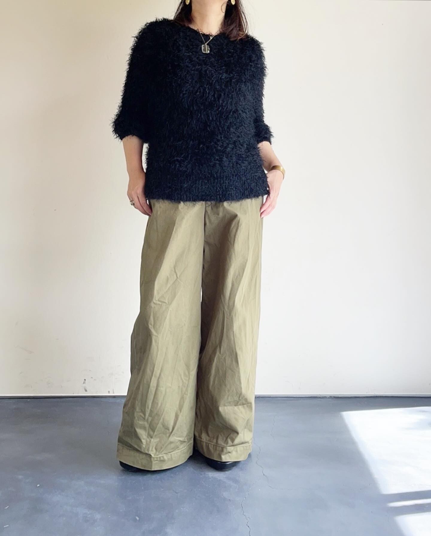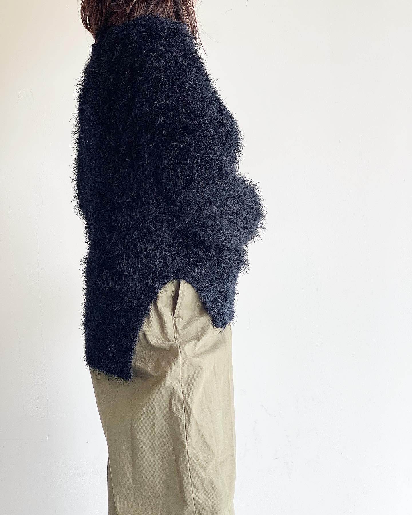 非常に長い毛足が特徴のナイロンシャギー糸を膨らみのある片畔で表情豊かに編んだオリジナルドレスニットシリーズ。個性的な見た目とドレッシーで独特な落ち感が