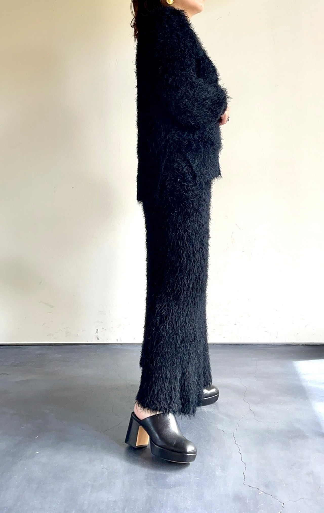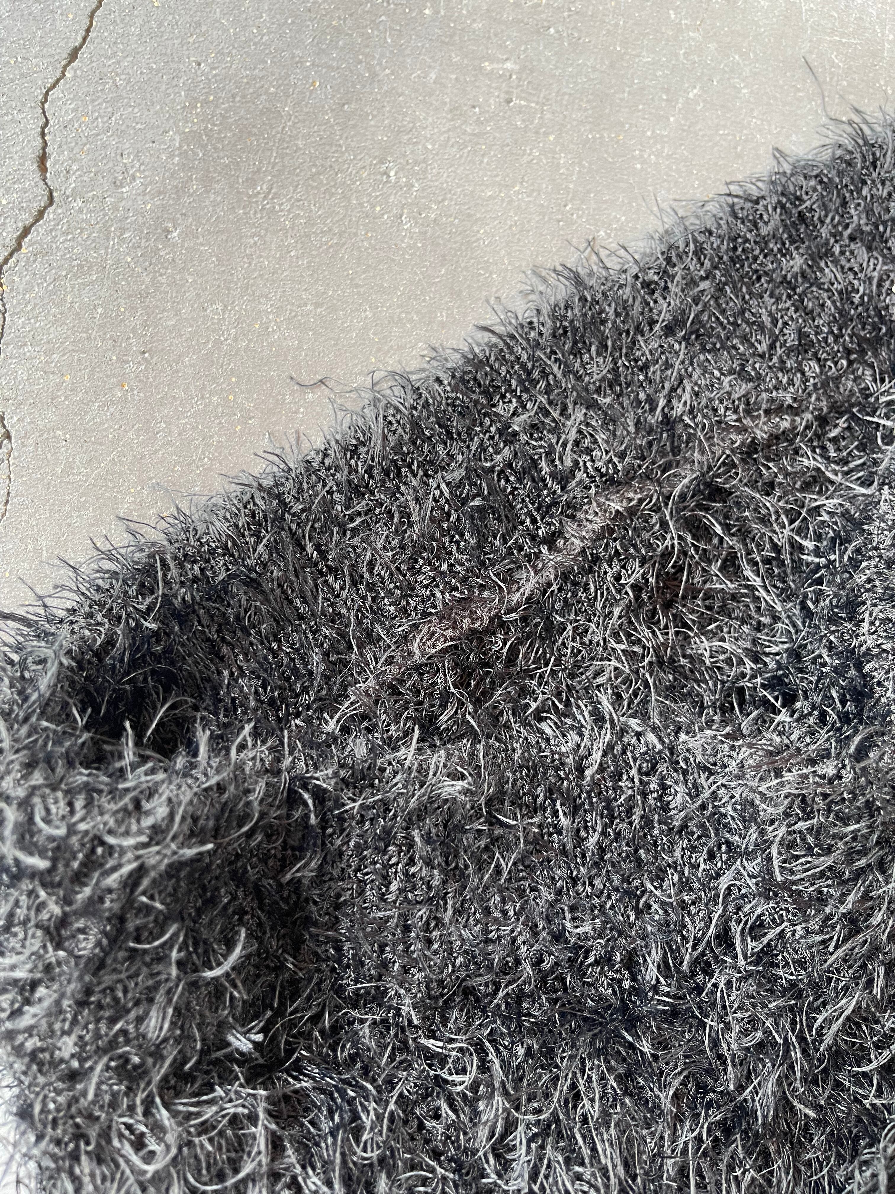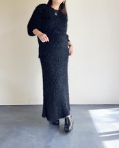 非常に長い毛足が特徴のナイロンシャギー糸を膨らみのある片畔で表情豊かに編んだオリジナルドレスニットシリーズ。個性的な見た目とドレッシーで独特な落ち感が