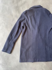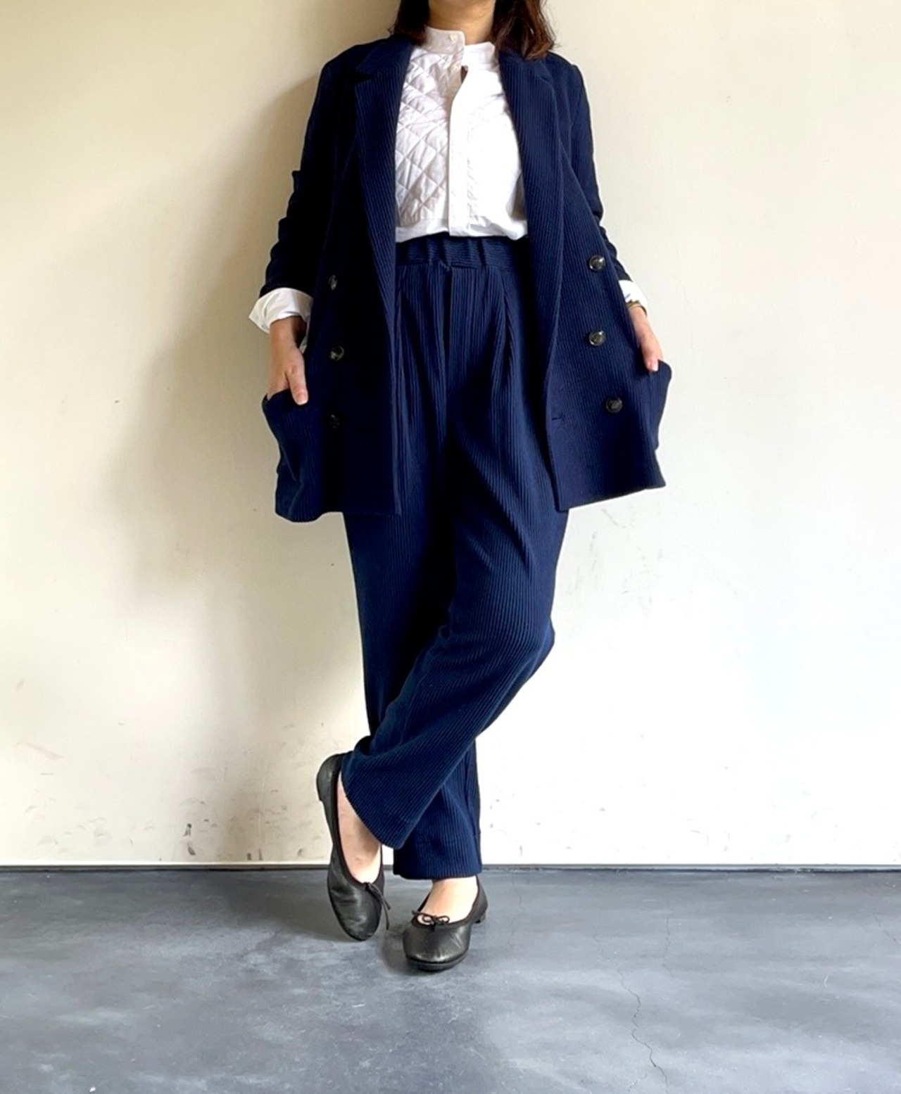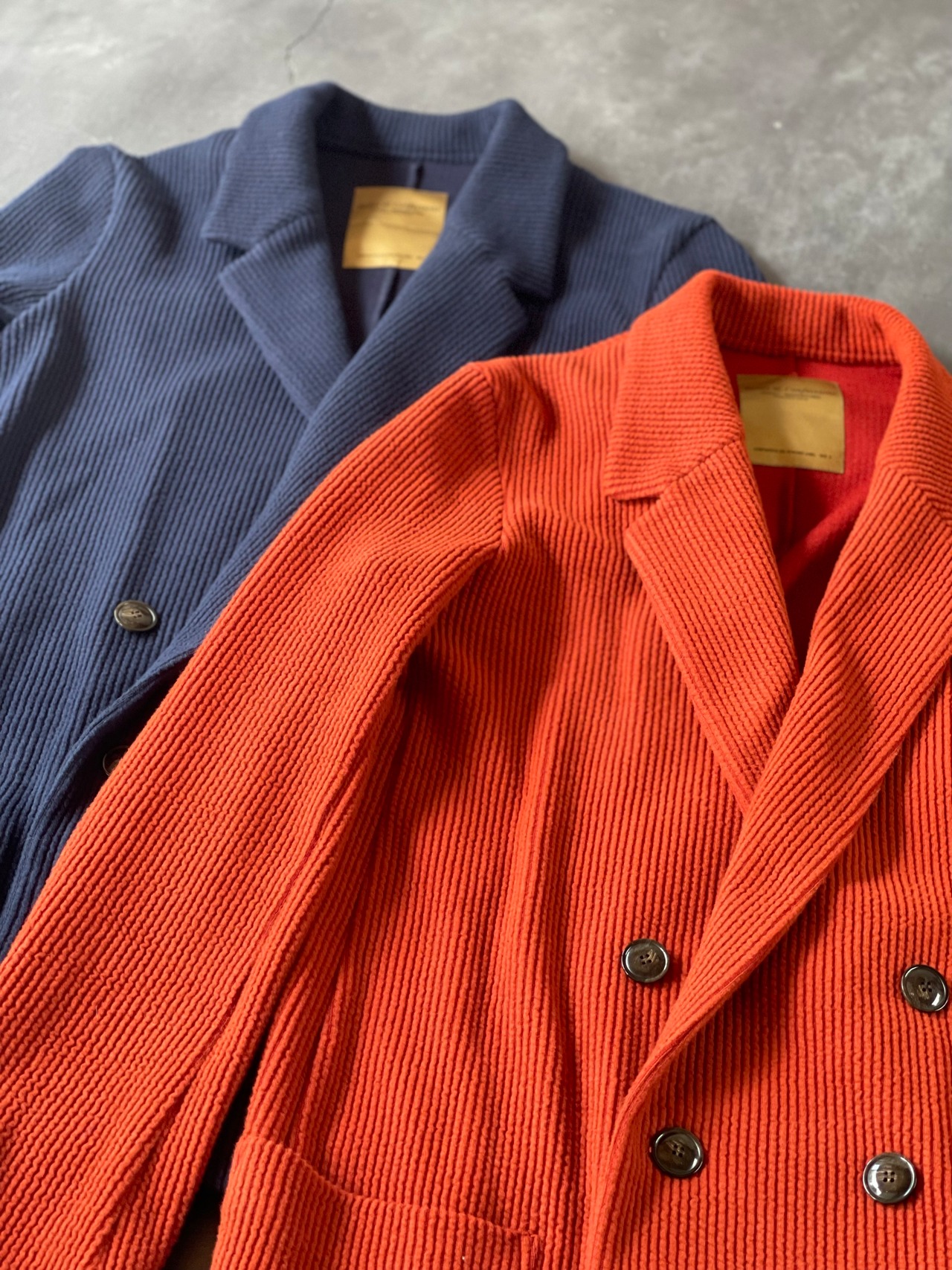 布帛のコーデュロイ組織のルックスと厚みはそのままに、しなやかなストレッチ性を持つイージーケア素材を目指し、コットンメポリエステルの接結編みで表現したファブリックライクコーデュロイジャージー素材。表側のコットンに繊細な起毛加工を施し、膨らみと温かみを持たせたりラックスジャージー素材。
